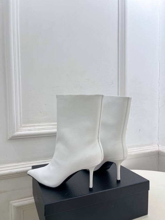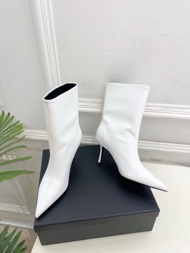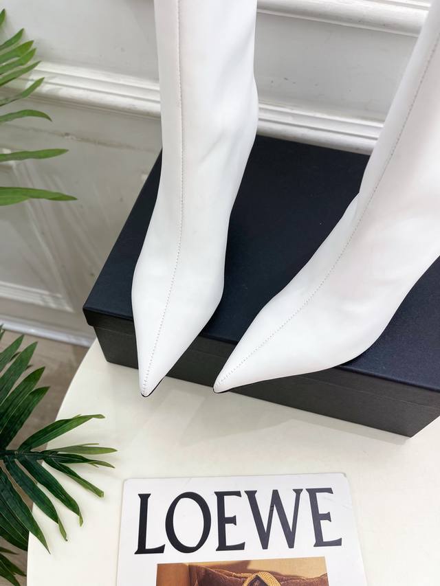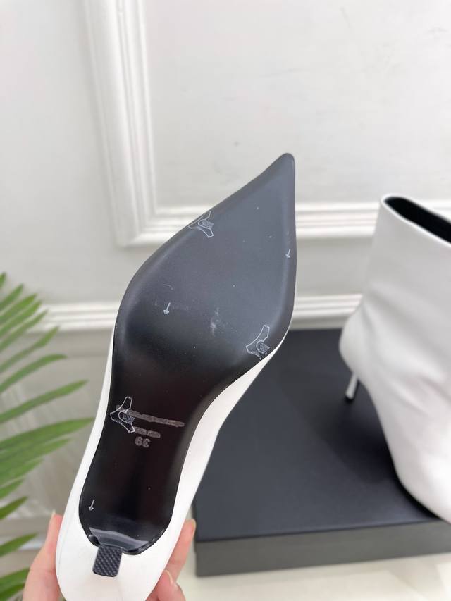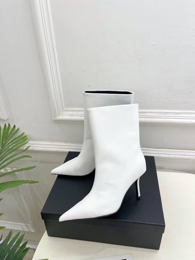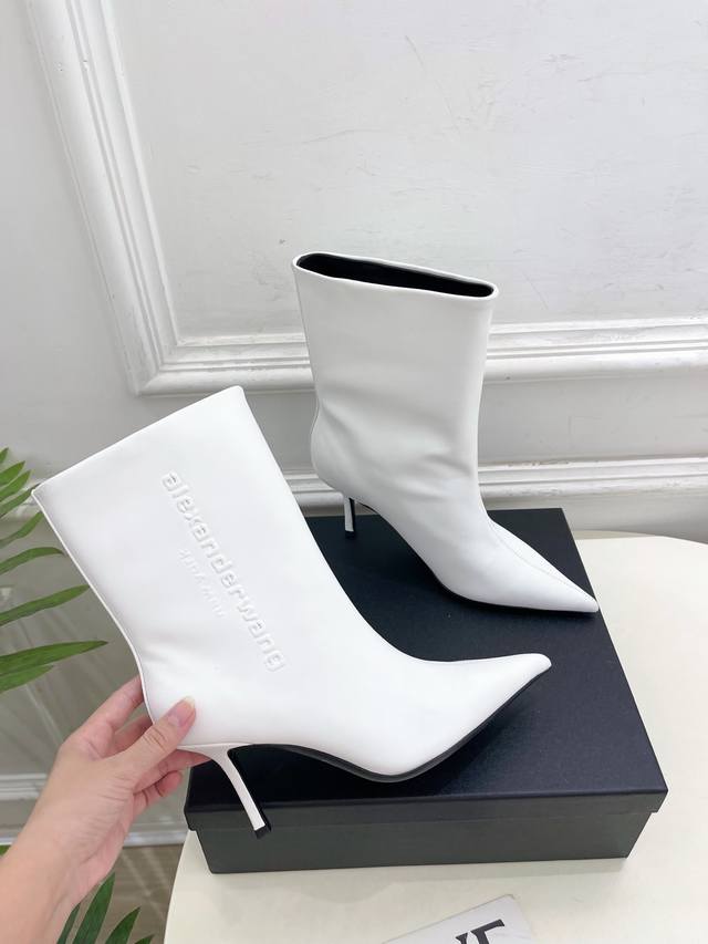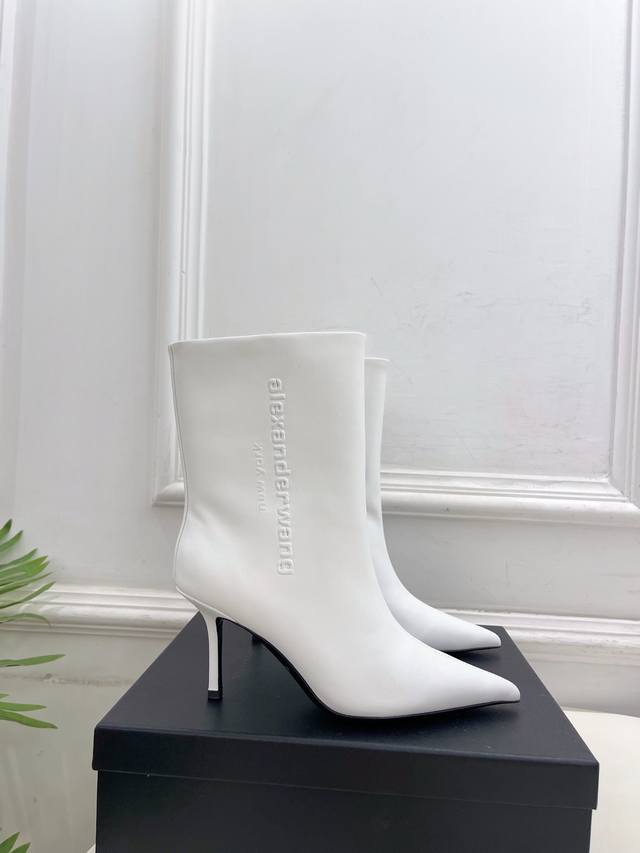 Alexander Wang 2025 Autumn/Winter New Arrival - Pointed Toe Letter High-Heeled Ankle Boots/Long Boots. These shoes have been a hot item in European and American street style photos and have also become a hit on Instagram. This uniquely styled couple's style has undergone a month of adjustments to the last, maintaining the overall smooth lines consistent with the original. They're really cool! Material: Original high-quality custom calfskin. Lining: Imported mixed sheepskin. Outsole: Original imported genuine leather. Heel height: 8cm. Sizes: 35-39 (34, 40, 41 are custom-made and non-refundable). Factory price. (Note: The last part, "Ankle Boots/Long Boots," appears to be a separate product description and is not directly related to the product description.)