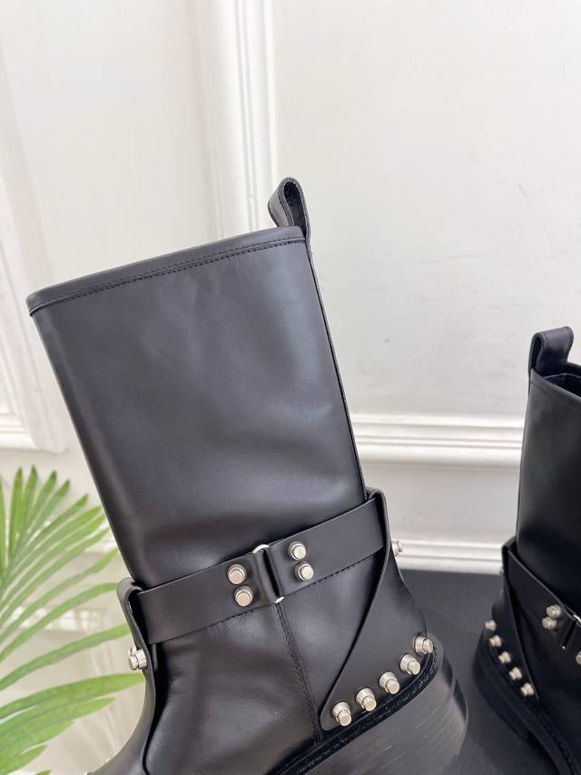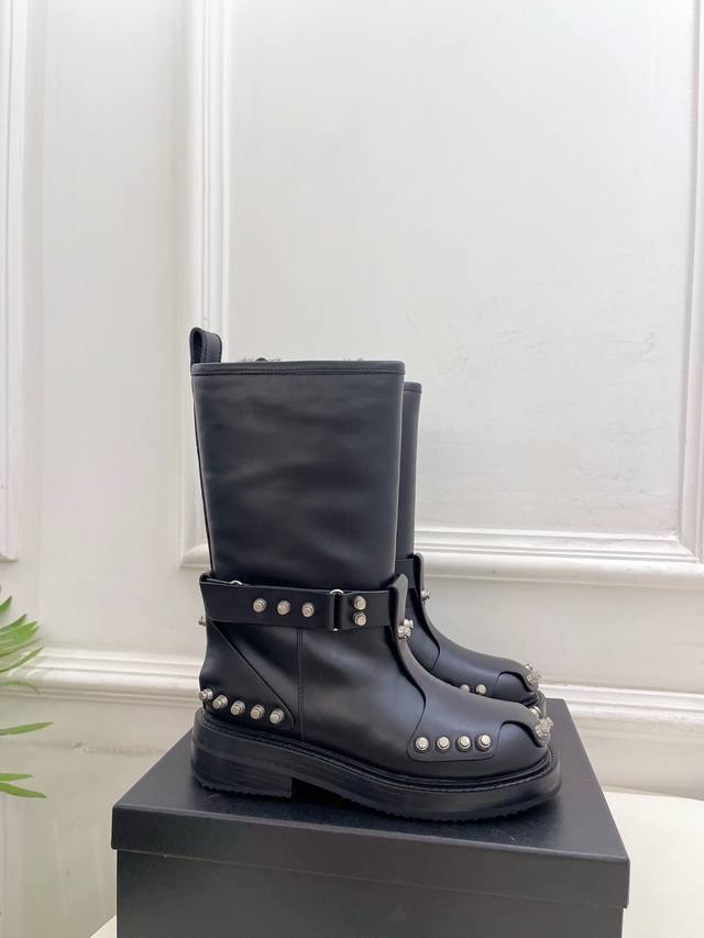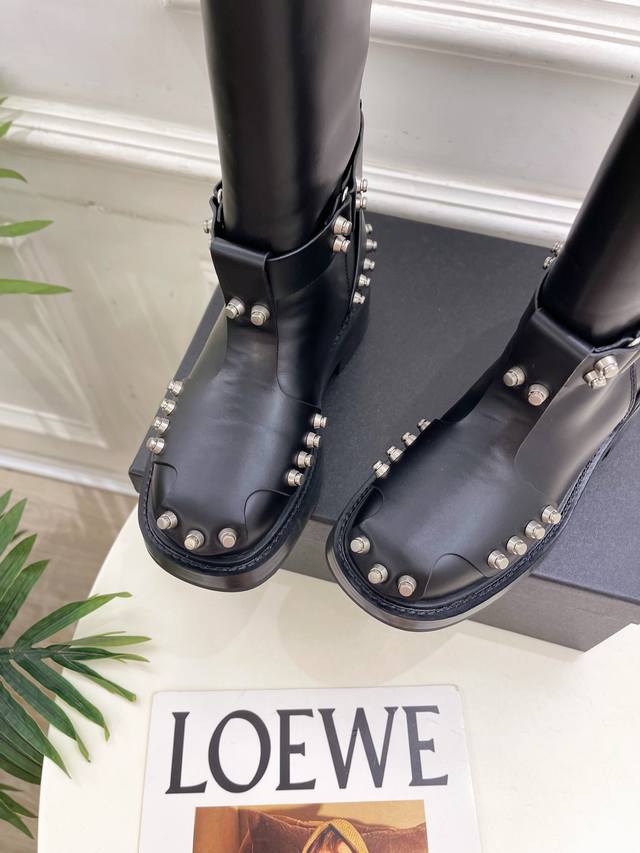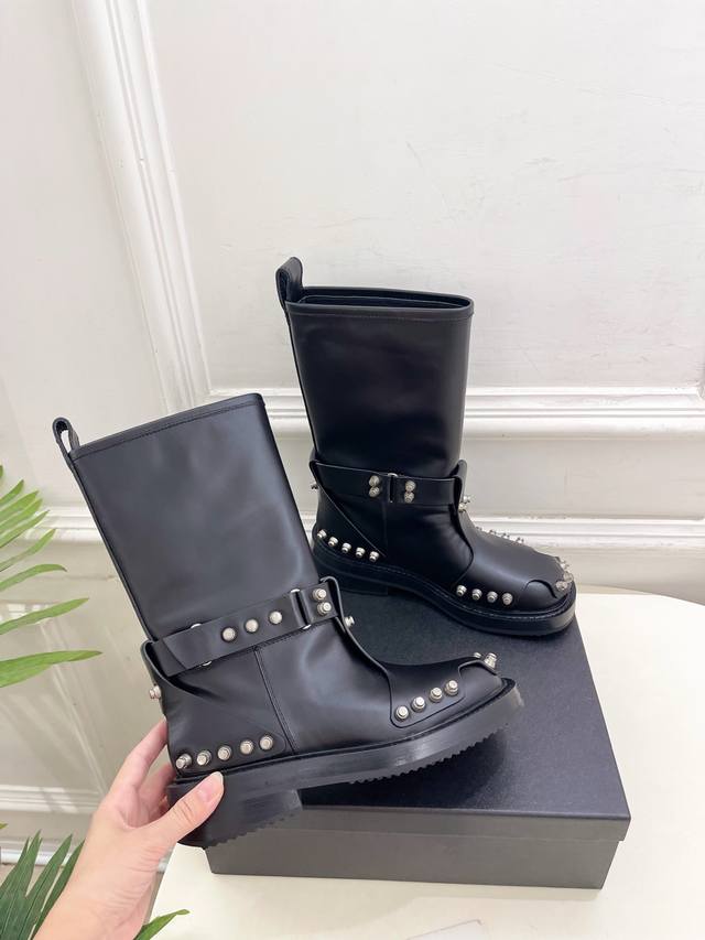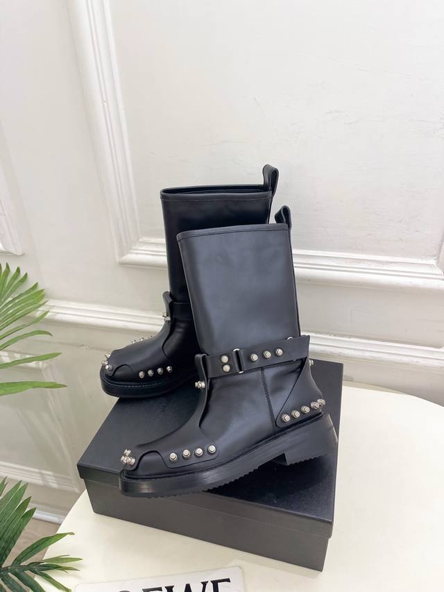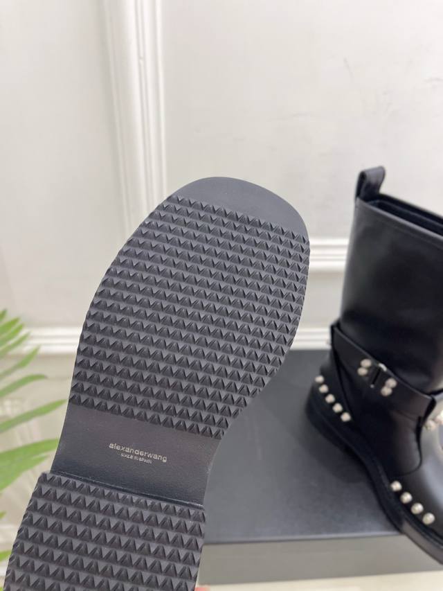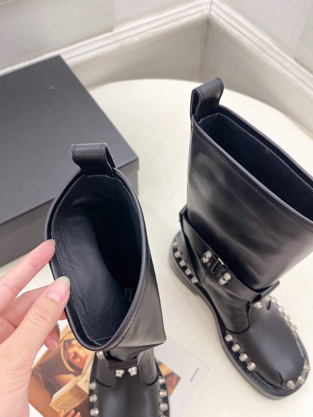 Alexander Wang 2025 Autumn/Winter New Arrival - Punk Style Mid-Calf Boots with Metal Rivets. These boots have been a hot item in European and American street style photos and have also become a hit on Instagram. This uniquely styled couple's boot has undergone a month of adjustments to the last, maintaining a smooth overall line consistent with the original. They're really cool! Material: Original high-quality custom calfskin. Lining: Imported cowhide and wool. Outsole: Original mold-made genuine leather combination outsole. Heel height: 4cm. Sizes: 35-39, 40.41. Custom orders are non-refundable and non-exchangeable. Factory price: Leather lining and wool lining 410.