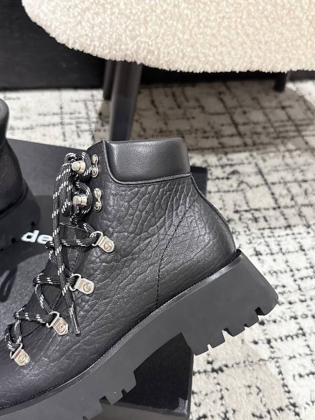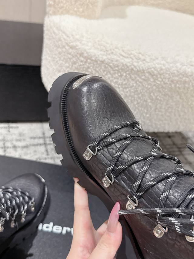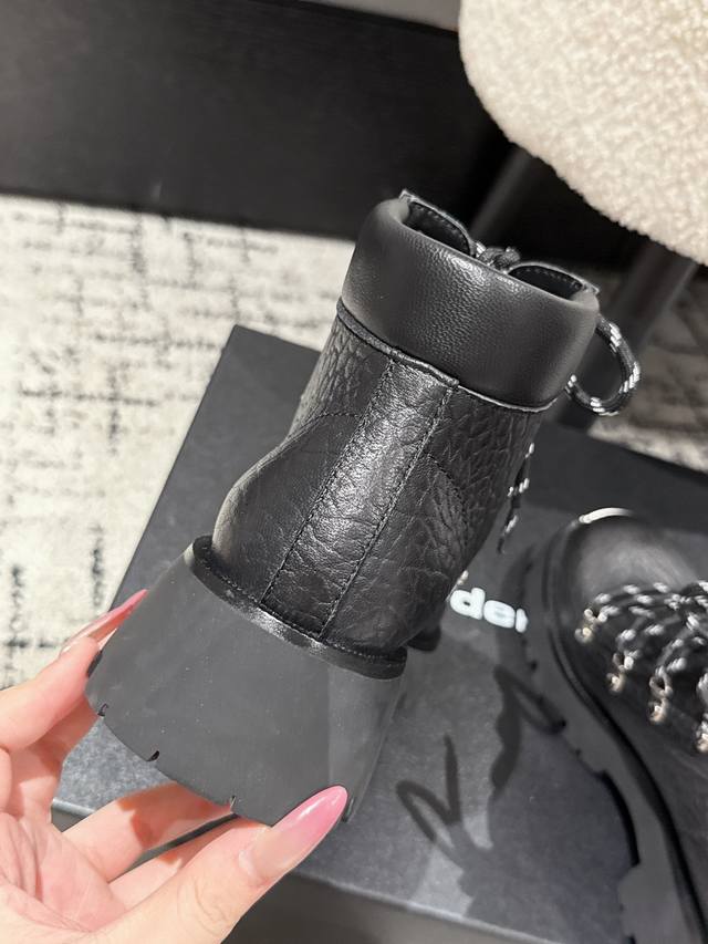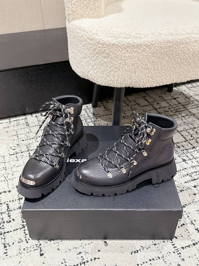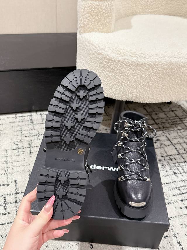 ) These Alexander Wang platform ankle boots are an absolute must-have for those with great legs! They make you look taller and slimmer. The classic black color is incredibly versatile. The leather upper features a laser-engraved logo, and the lace-up design combined with the 7cm platform sole easily gives you long legs! Material: Cowhide Lining: Sheepskin lining Outsole: Non-slip rubber outsole Size: #35-41 40 & 41 are custom-made and non-refundable.