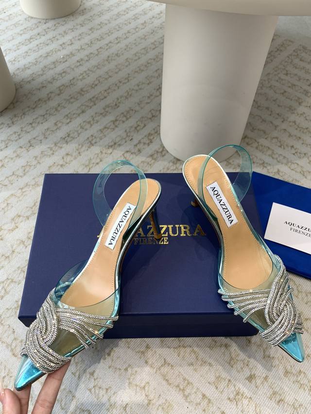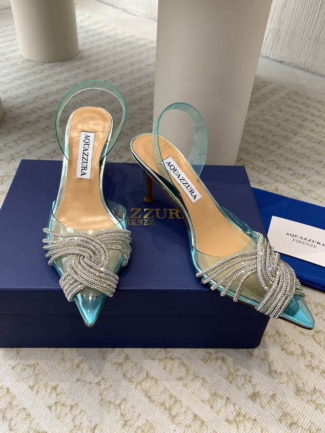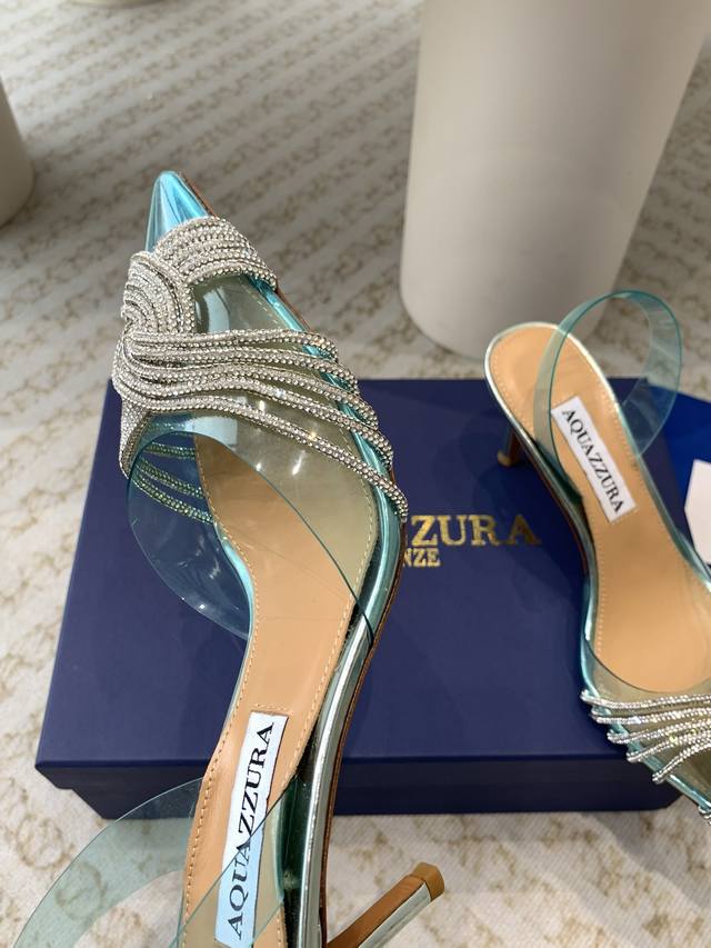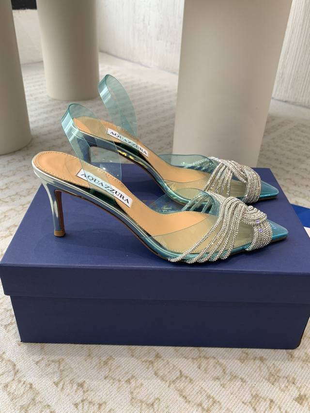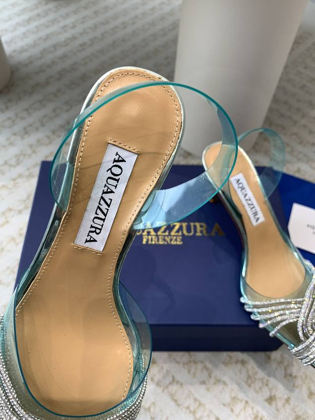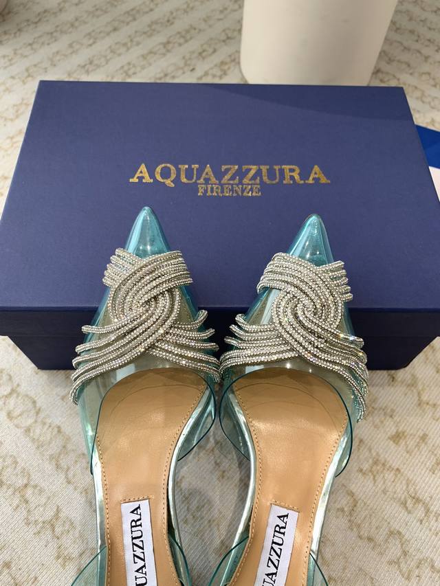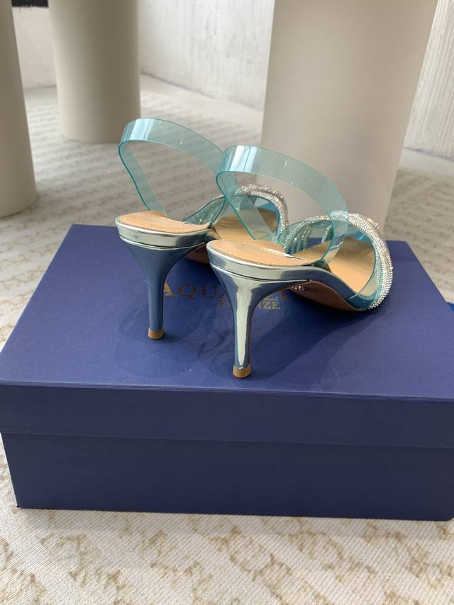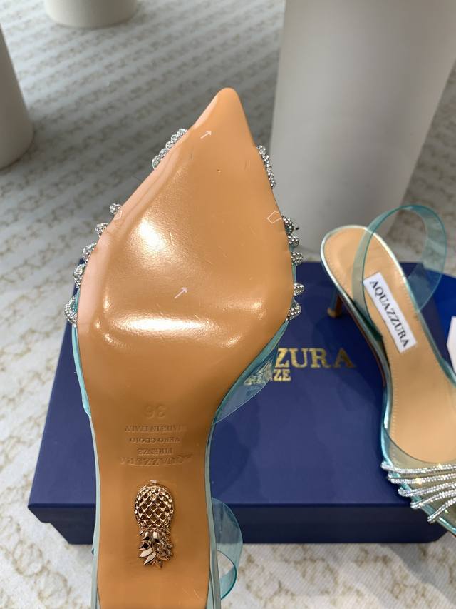 Aquazzura 24Ss, a stunning and popular model, a favorite of pineapple royalty. Luxurious and elegant, picture-quality. Made with imported silk PVC translucent fabric. Sparkling rhinestone buckle, lambskin lining, and Italian genuine A-grade leather outsole. Heel height: 10cm - 7.5cm. Sizes: #34-42. 34, 40, 41, 42. Made to order, no returns or exchanges.