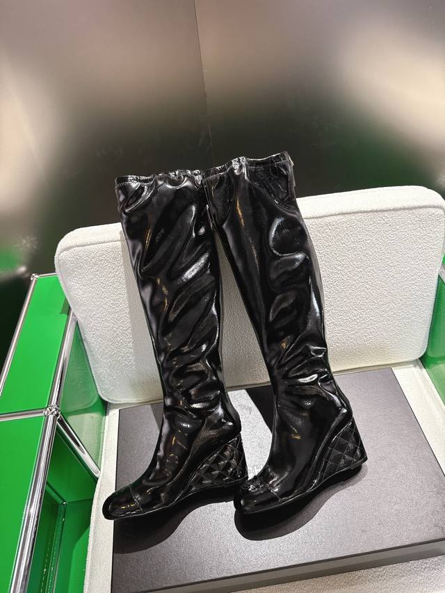 Autumn/Winter New Arrival Double C Diamond Pattern High Boots with Top Quality Wedge Heel and Elastic Cuff. The elastic material is cleverly pieced together to fit the leg curves, ensuring freedom of movement while adding a touch of casual elegance. The 7cm wedge heel design is exquisite, and the 18-inch height is just right. The upper is made of original patent leather, and the inner lining and insole are both made of silk sheepskin. It features an original Italian imported genuine leather outsole. Sizes 34-42 [34, 40, 41, 42 custom sizes available].