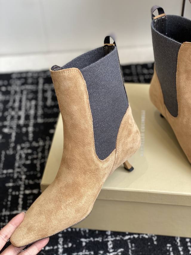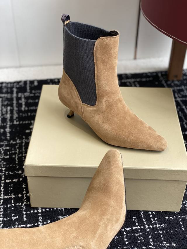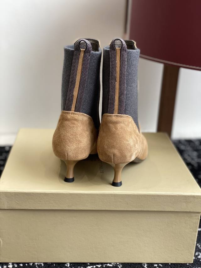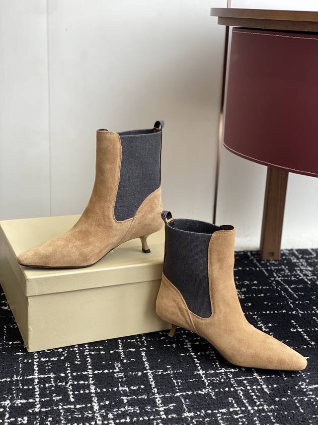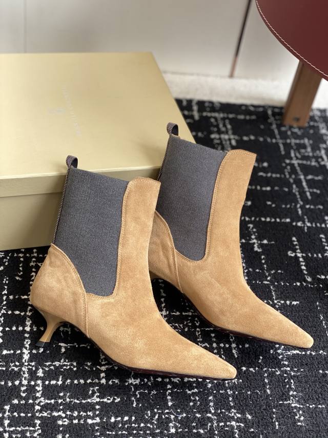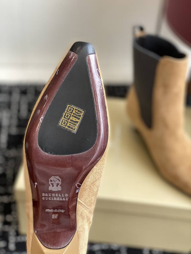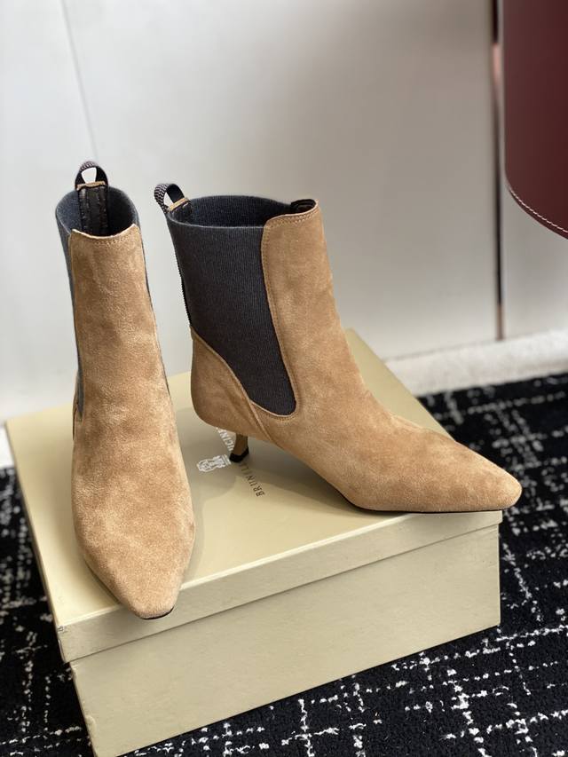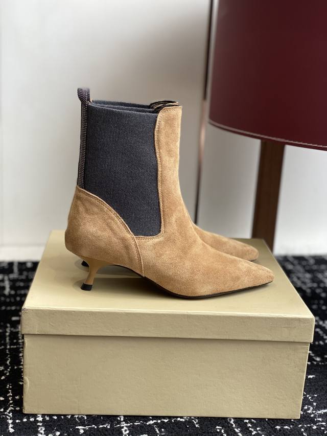 Available on-site! Brunello Cucinelli's exquisitely crafted, stylish, versatile, and casual, slim-fitting Chelsea boots are a must-have for fall and winter. These Chelsea boots are the ultimate evolution of the mule. If our slippers hadn't received countless rave reviews, how could we have created these ankle boots? The minimalist, elegant square toe design eschews unnecessary embellishments, embodying the ultimate in understated luxury. The moment you slip them on, only your toes will experience the secret comfort. The golden shaft height: precisely positioned at the slenderest point of the calf, visually elongating the leg. The minimalist silhouette: a 5cm, stable kitten heel, ensuring a smooth, effortless walk yet exuding a powerful presence. The upper is crafted from high-merced suede with a soft matte finish for a velvety, comfortable feel. The boots offer a rich visual effect, creating subtle shifts in light and shadow depending on the lighting angle. They are not only exceptionally durable and wear-resistant, but also require minimal maintenance: simply smoothing along the nap to maintain optimal condition.