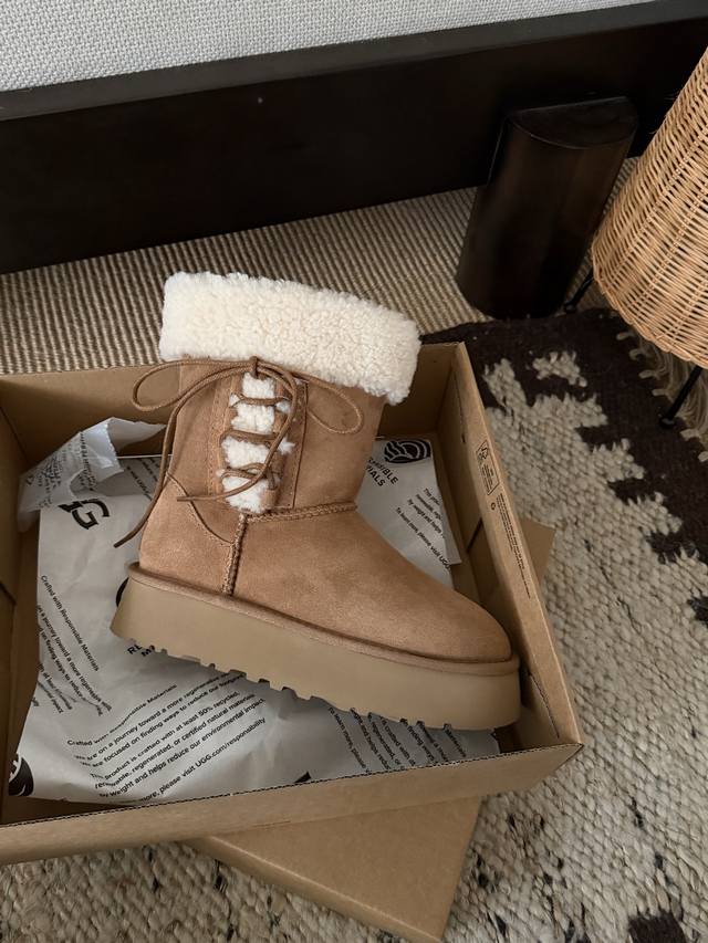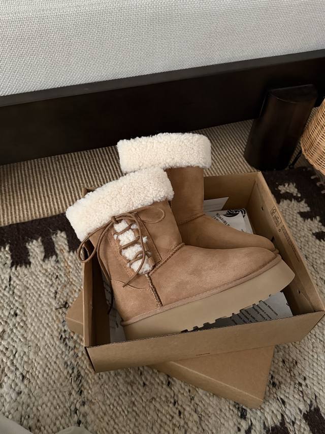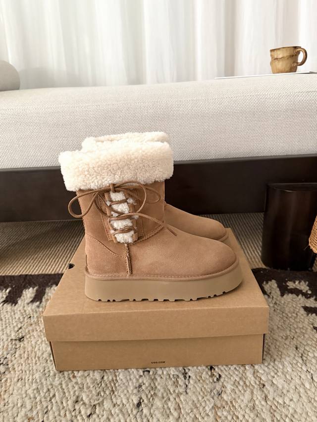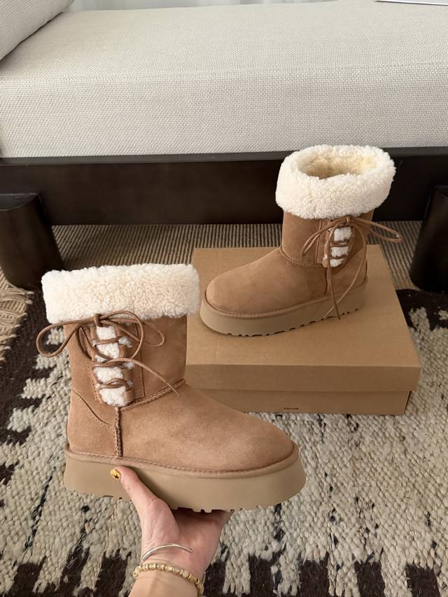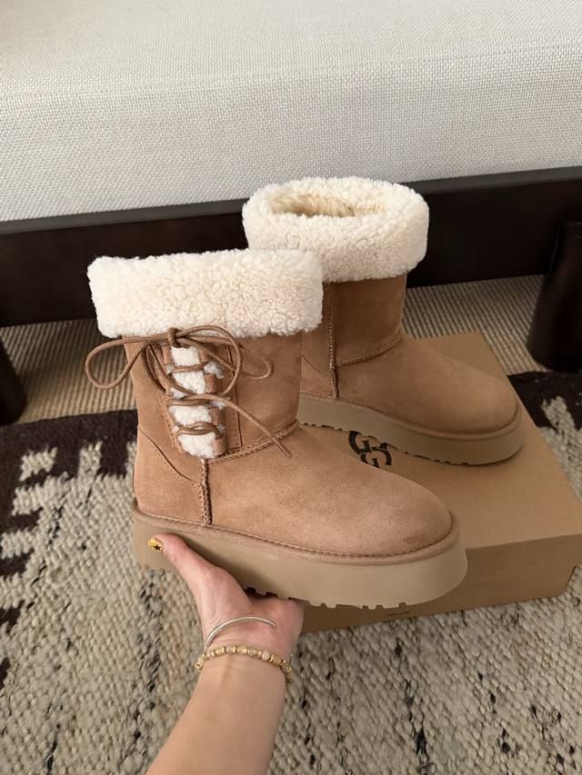 Ballet Lace-up Platform Boots, Mid-Calf Style. Adorably cute with teddy bear curls at the opening. Versatile mid-calf style that elongates the legs. Made of sheepskin, perfect for winter! Sizes: 35-40