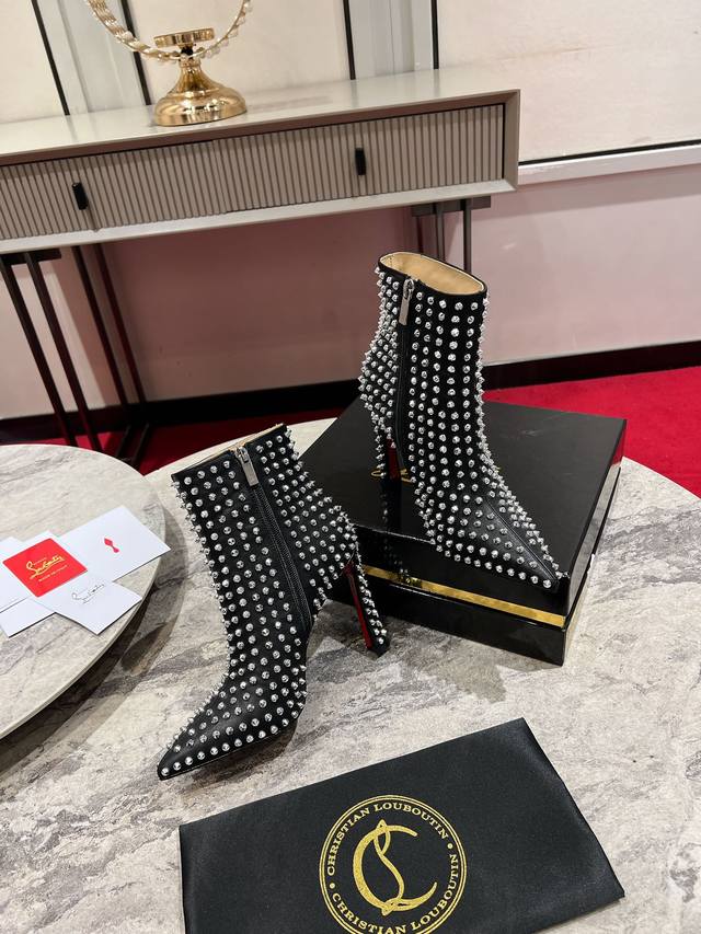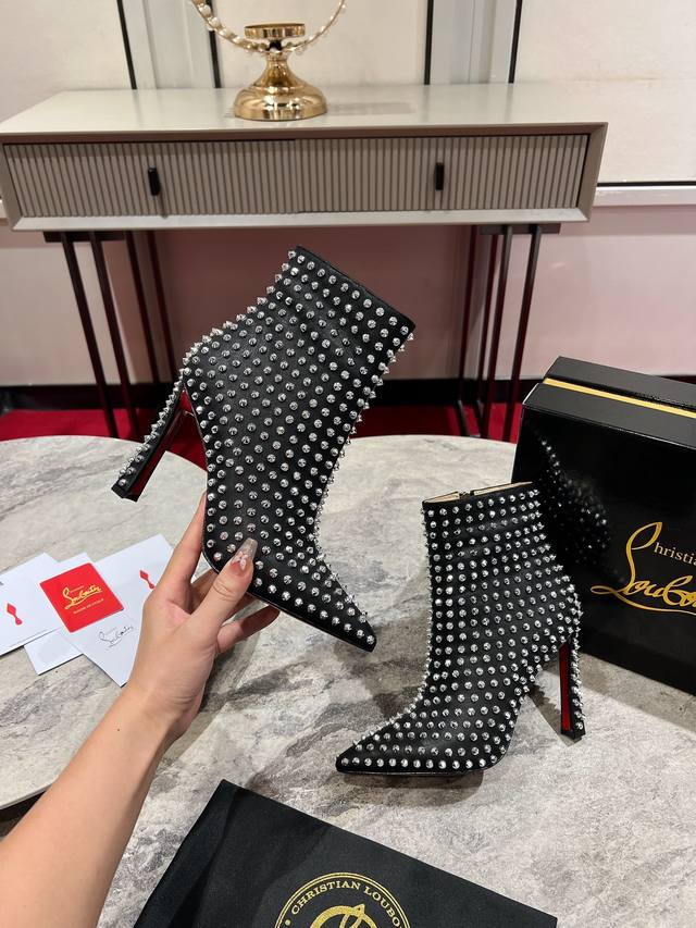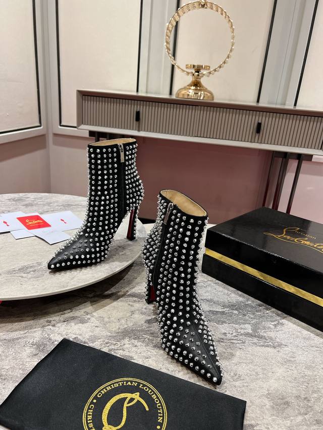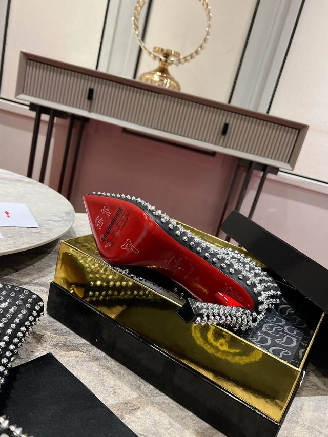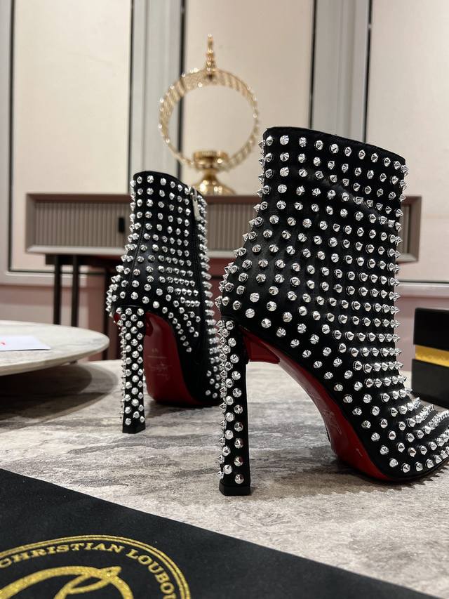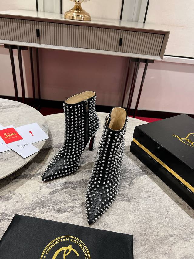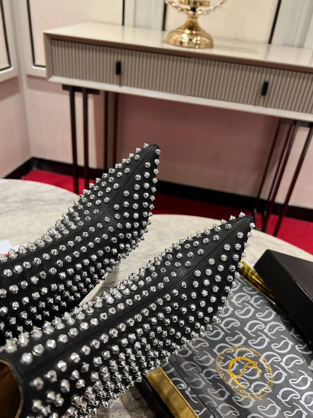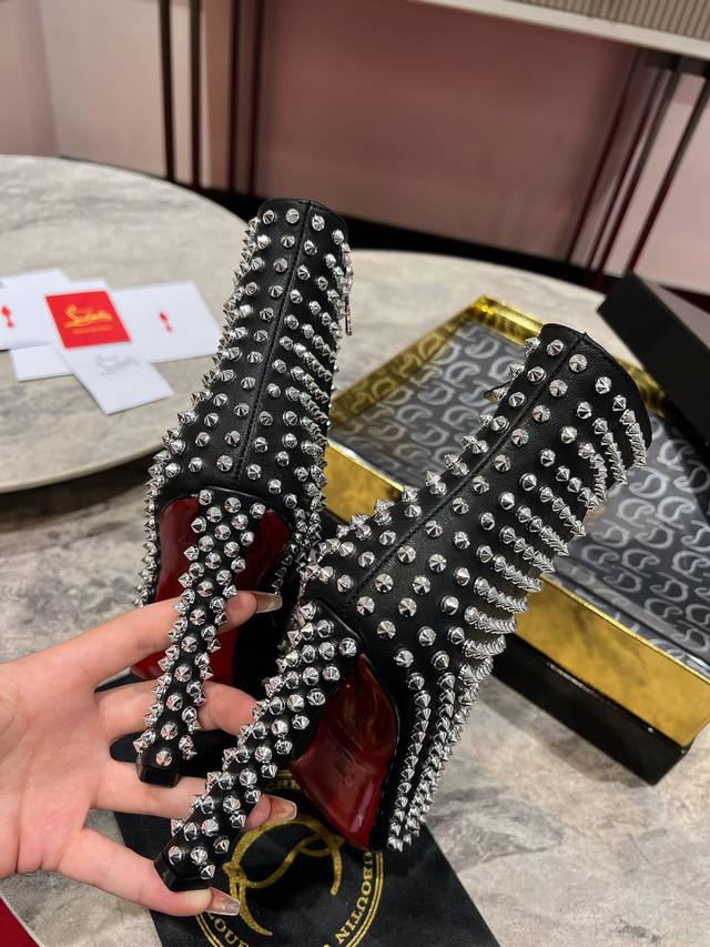 Its beak-like point. This sophisticated style in black Nappa leather features a bold low-cut faux shoe that exposes the foot. It has a 100mm sloping heel and signature metal spikes.