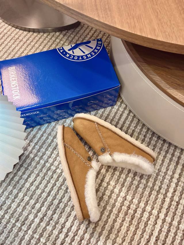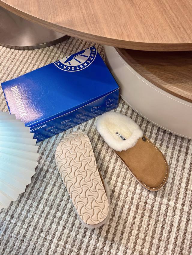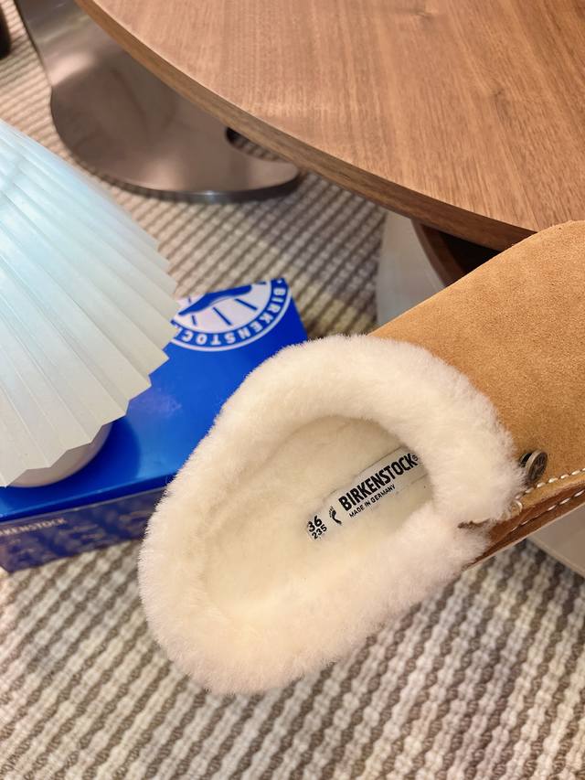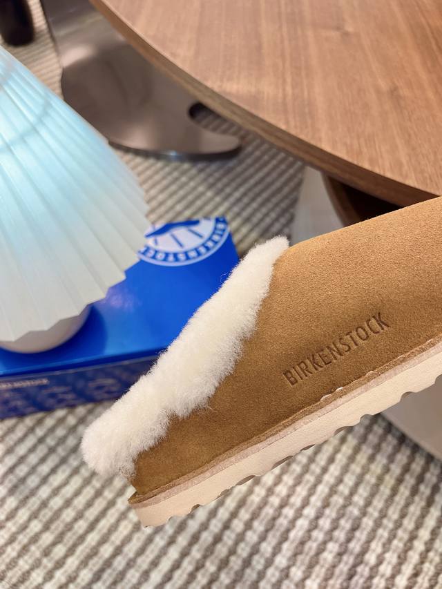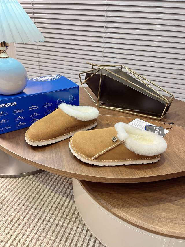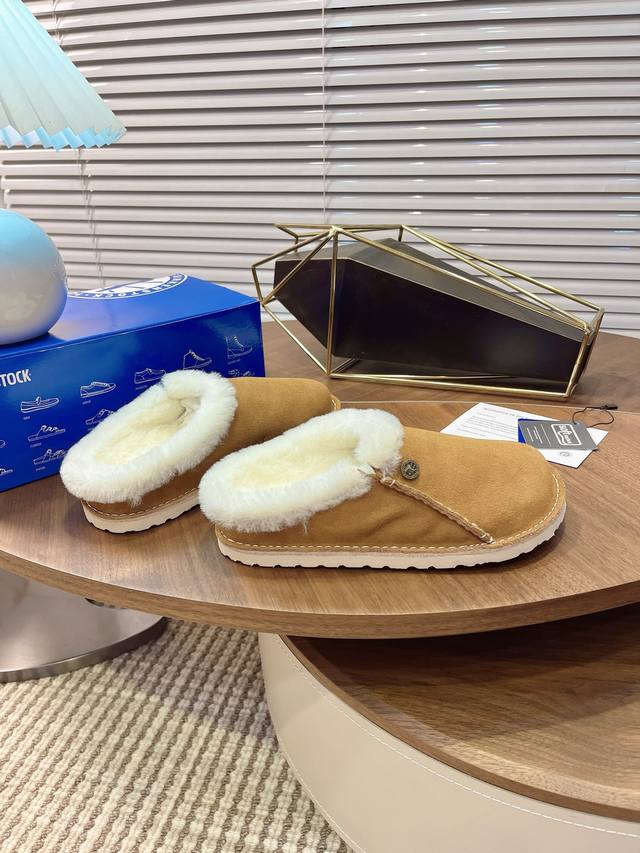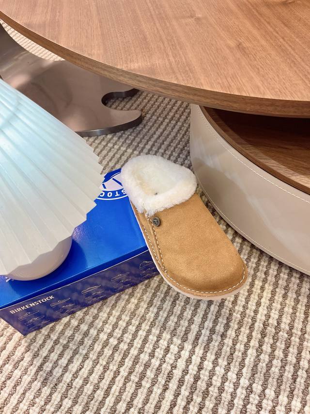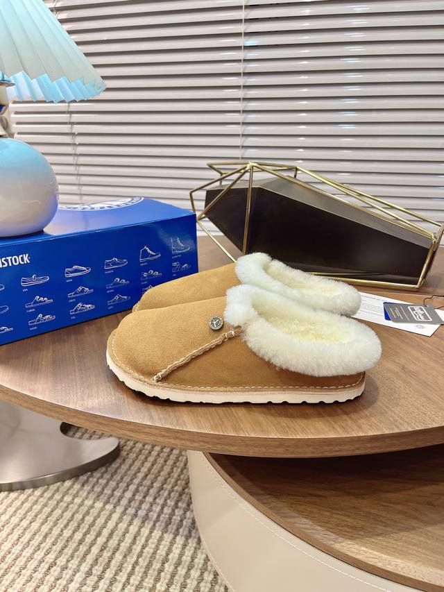 closed-toe furry slippers with velvet and cork are available for outdoor wear. The Buckley Shearling series