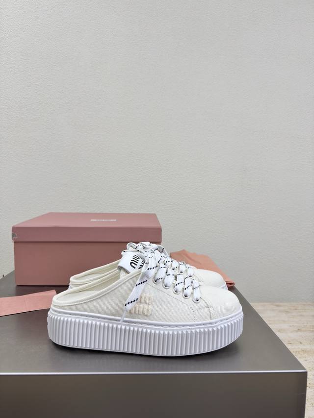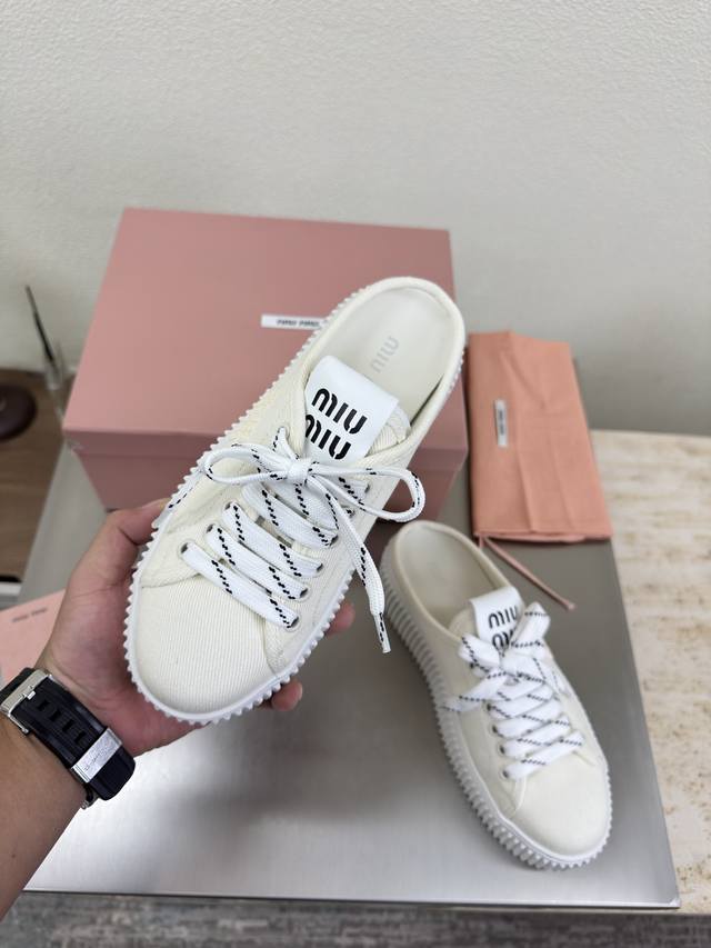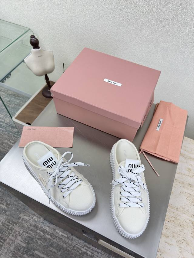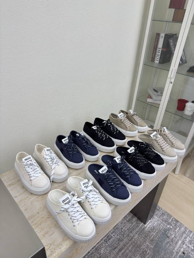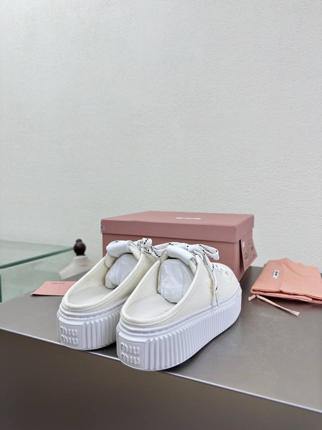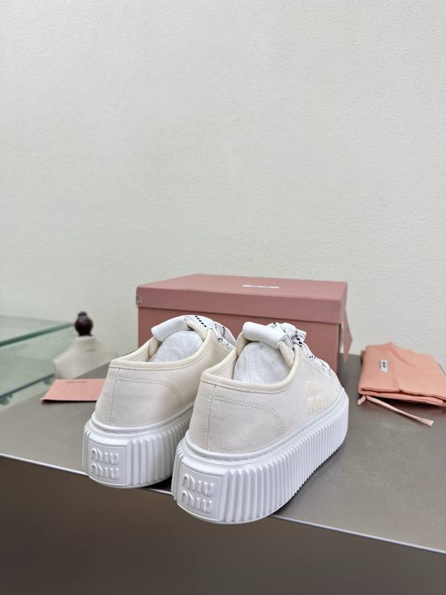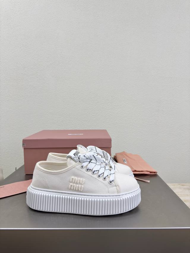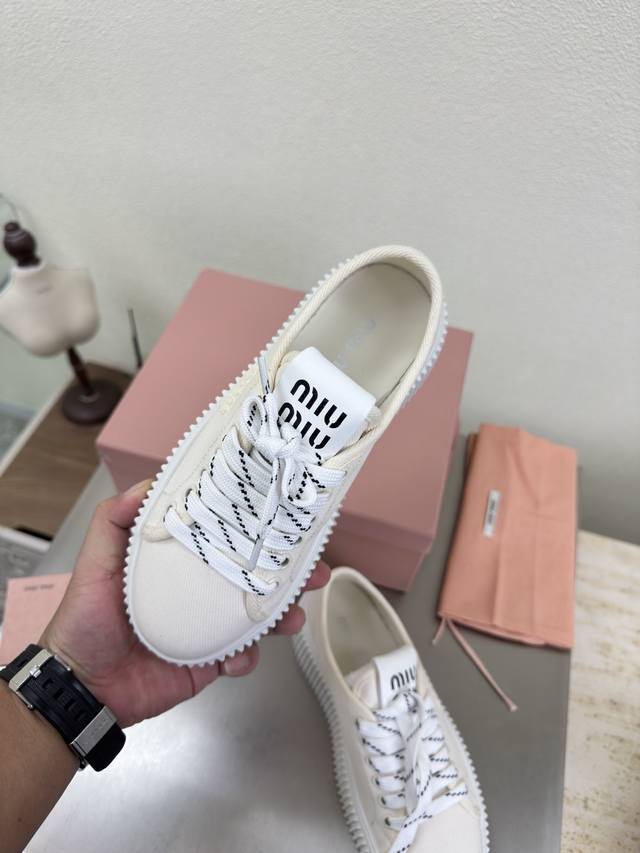 Biscuit-soled sneakers, classic Miu'miu, off-white, thick sole design, terry cloth embroidered logo on the side, Miu'miu classic and comfortable construction, original molded outsole, high-quality material, original washed canvas lining, 3D stitching, original molded outsole, non-slip and durable, original design, girlish and comfortable, size 35, 36, 37, 38, 39, 40, 40 (custom sizes available), original packaging included.