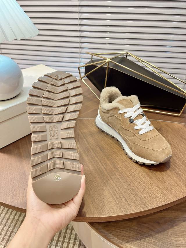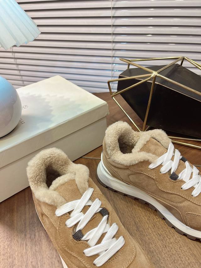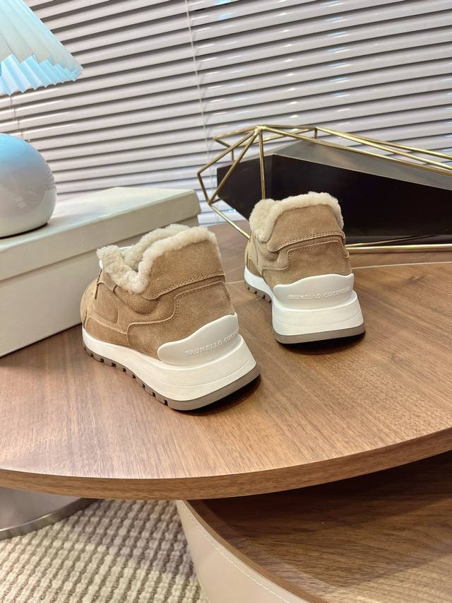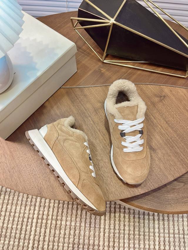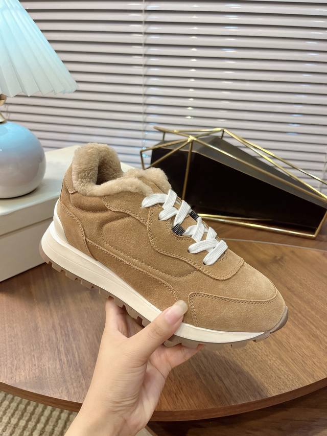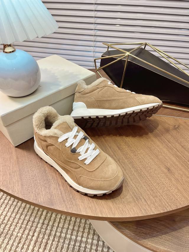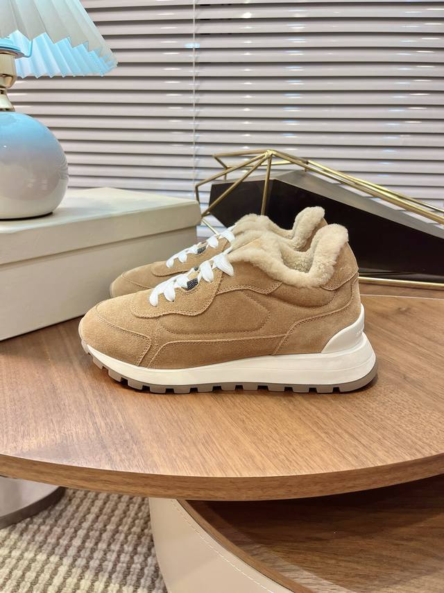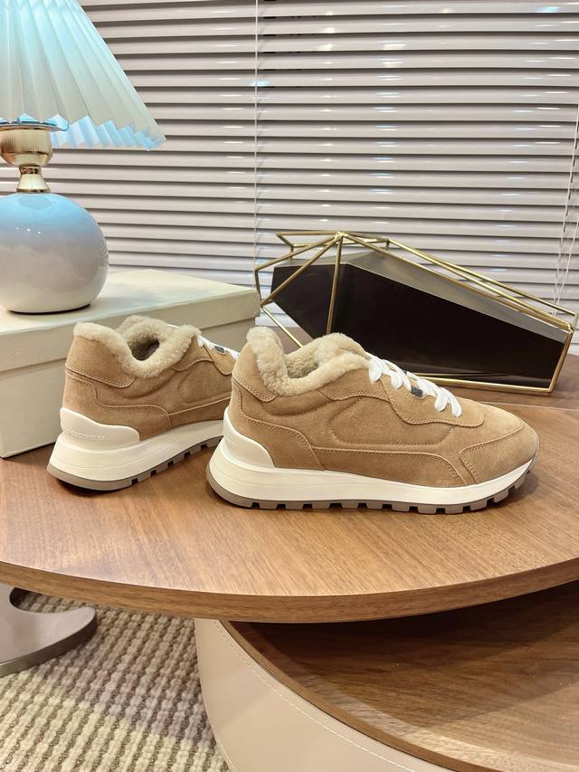 Brunello Cucinelli Winter Wool-Lined Casual Sneakers. Upper: Imported high-gloss cow suede. Meticulously crafted, each process is inspected by specialists, resulting in high-quality shoes. The outsole is a 1:1 mold. All materials, including the outer fabric (sheep's wool), imported top-grain cowhide, and the inner lining (lamb's wool), are customized to the original 1:1 standard. Truly comfortable, beautiful, breathable, stylish, and versatile high-end shoes. Sizes: 35-42. Sizes 35, 41, and 42 are custom-made and non-refundable.