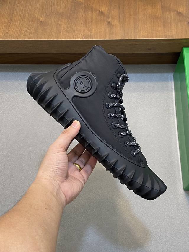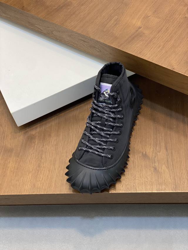 Top-quality original purchase! Nylon high-top lace-up sneakers with wax-effect rubber logo interior and original rubber sole!