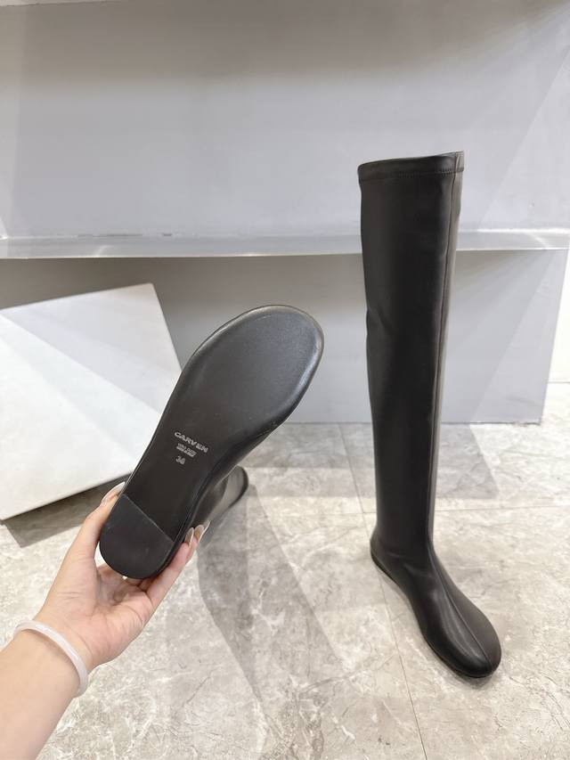 Carven , a brand with a French elegant style, typically combines fashionable design with practical functionality in its women's stretch boots. Made from high-quality stretch sheepskin, which is soft, breathable, and durable, these boots ensure comfort and longevity. The stretch design makes the boots fit the foot shape better, providing greater comfort and making them easy to put on and take off. Materials: Silk satin, imported stretch Lycra, imported stretch leather. Sole: Genuine leather. Sizes: 35-39, 40 (custom made). Short boots: 390. Long boots: [Other sizes not specified].
