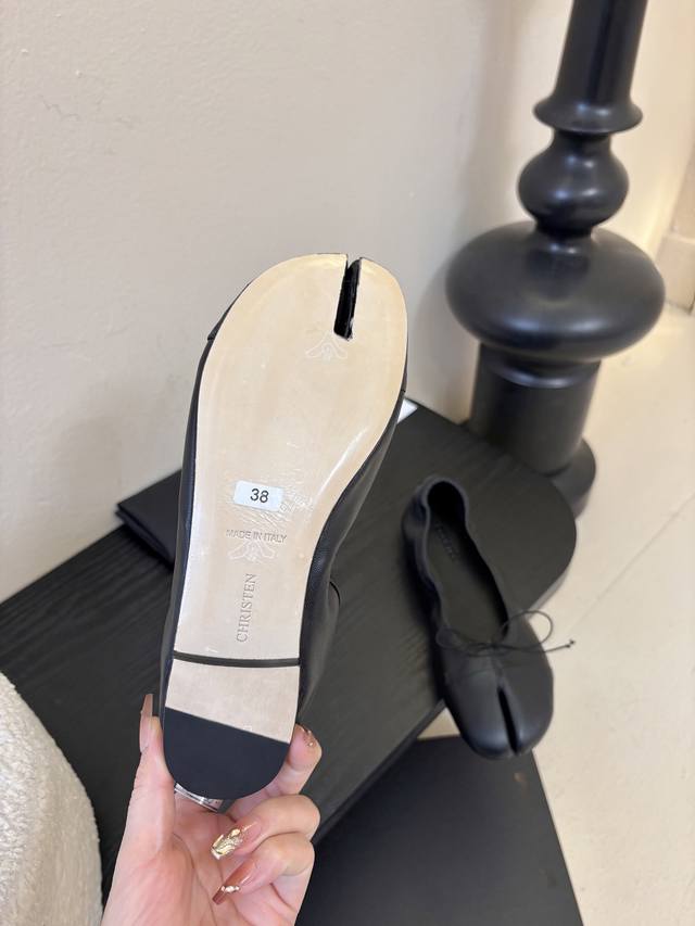 Christe* Spring/Summer New Ballet Flat Split-Toe Shoes DDD These shoes can be paired with casual wear or formal, elegant looks, suitable for various occasions. Made with premium leather, the shoe features a simple Mary Jane design with a heel strap and brand logo on the laces, combining quality and style. DDD Upper: Sheepskin Ddd Lining: Sheepskin Lining Ddd Outsole: Genuine Leather Outsole Ddd Size: 35-40 40 (Custom Size) DDD