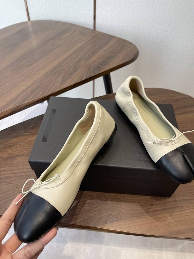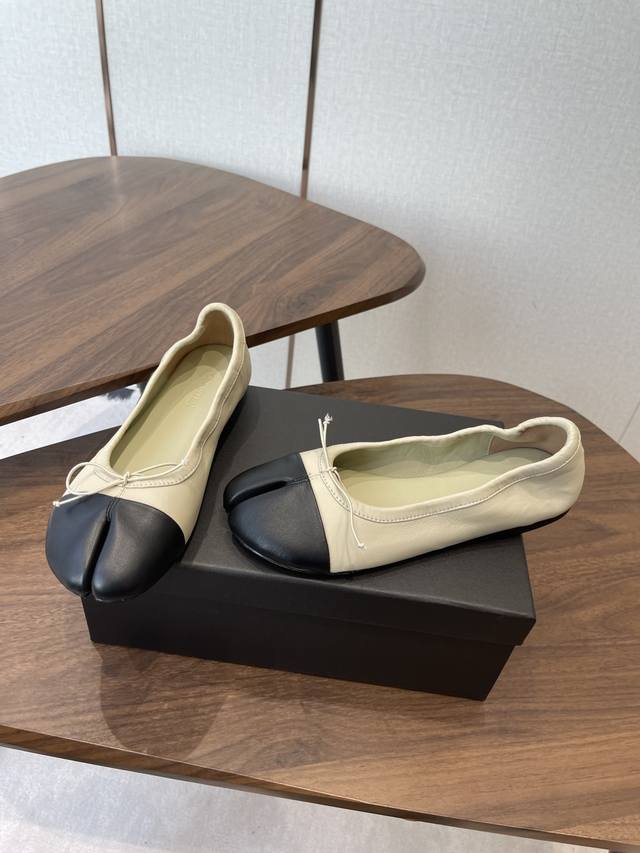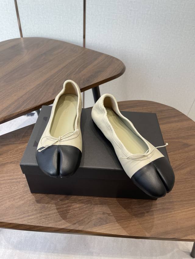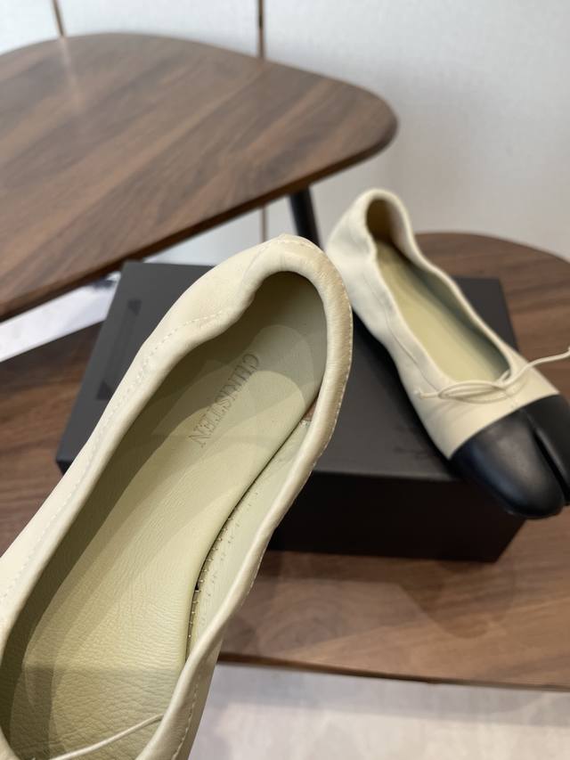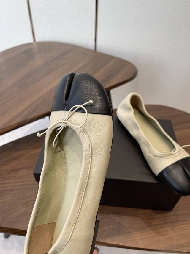 Christen Split-Toe Ballet Flats DDD These ballet flats feature a split-toe design inspired by traditional Japanese tabi socks, separating the big toe from the other toes for a highly distinctive look. They adopt the heelless design of ballet flats, using soft sheepskin for the upper. The shoe body has a pleated, elastic design that conforms to the foot shape, balancing elegance with everyday comfort. DDD A delicate bow embellishment adorns the toe. Available in black and white color blocking and all-black, the minimalist design is suitable for various occasions, from casual everyday wear to slightly formal occasions. The sole and stitching details are exquisite; incorporating the brand's century-old shoemaking expertise, the ergonomic design is optimized for Asian foot shapes. DDD Upper: Sheepskin Ddd Lining Ddd Outsole: Genuine Leather Outsole Ddd Height Increase: 1.5cm Ddd Size: 35-40, Size 40 is custom-made and non-refundable DDD