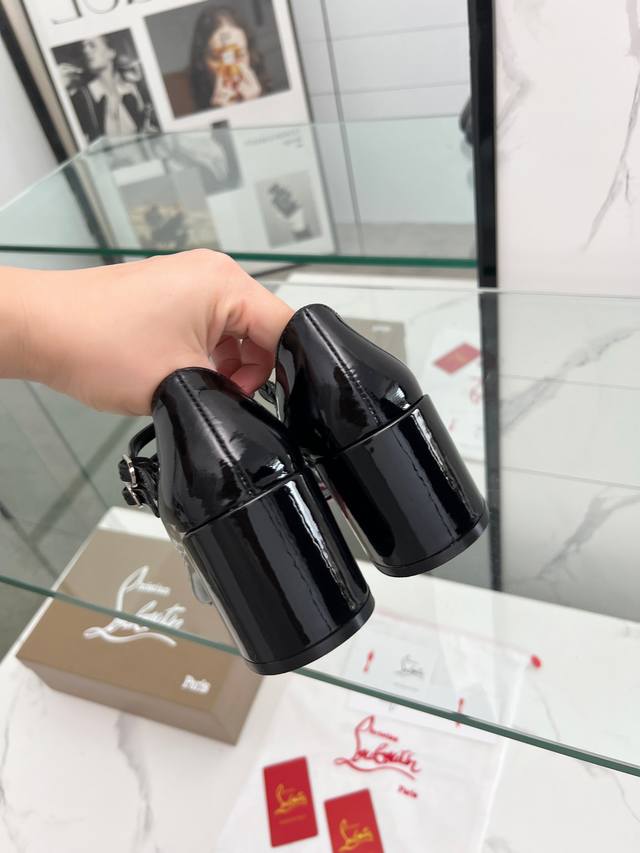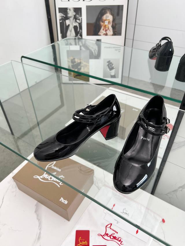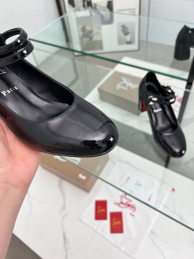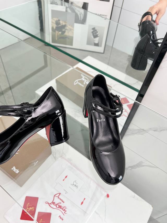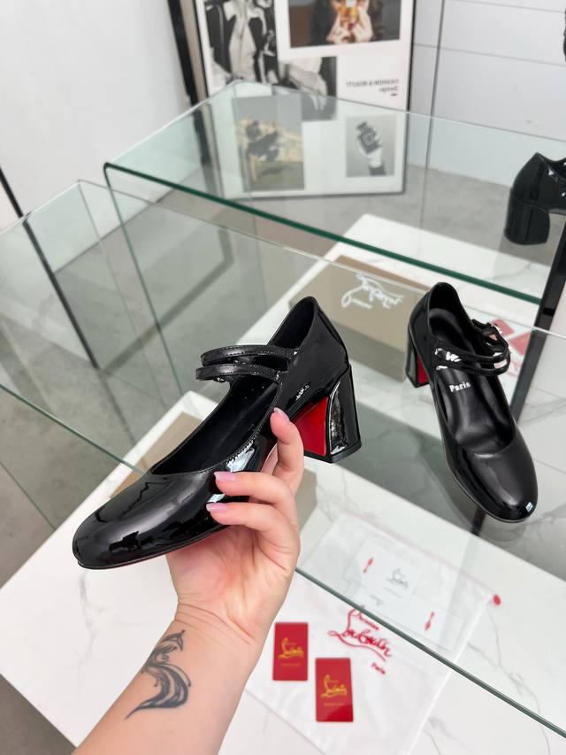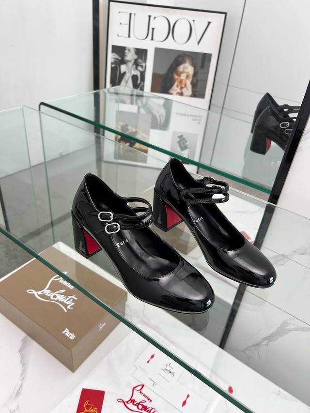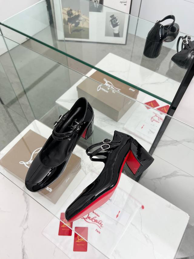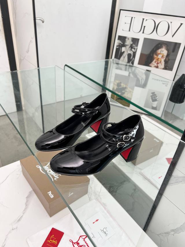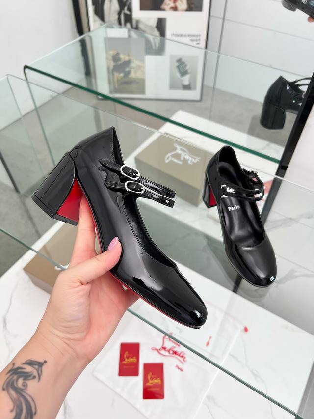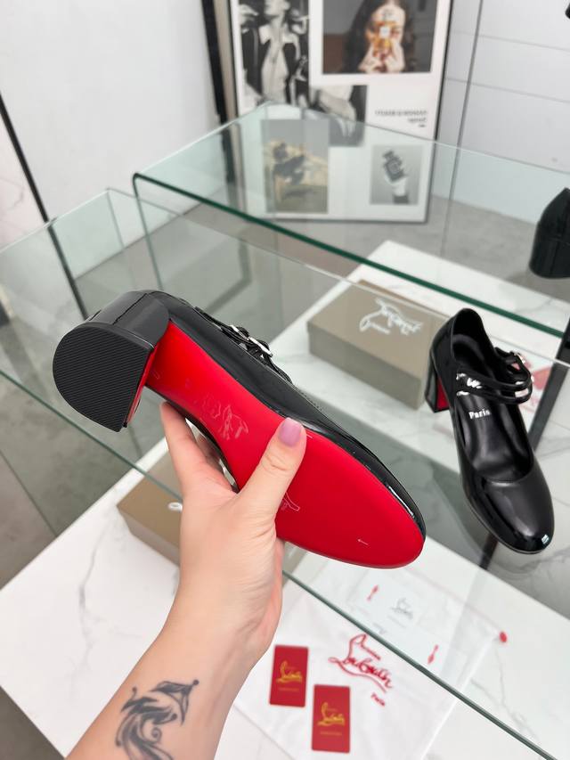 Christian Louboutin's latest Mary Jane block-heeled stilettos with red soles feature refined lines, elegantly rounded toes and a shallow cut. They convey true love at the point of eye contact. Slimming and narrow, their sculpted lines accentuate a voluptuous and alluring silhouette. A classic and popular style, these retro, elegant dream shoes are a must-have. Fabric: Patent leather, Lining: Sheepskin, Outsole: Genuine leather, Heel height: 5.5 cm. Color: Black, Champagne, and Red. Sizes: 35-39, 40, 41, 42, and 43. Custom-made, non-refundable, standard sizes. Packaging: Includes a fabric bag and card.