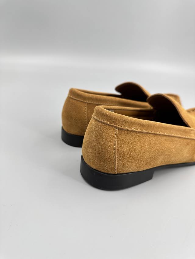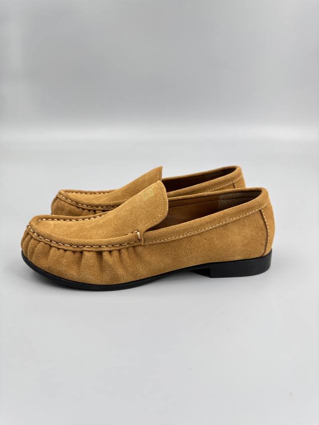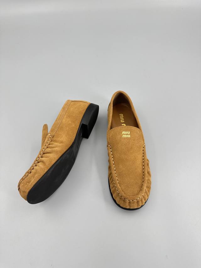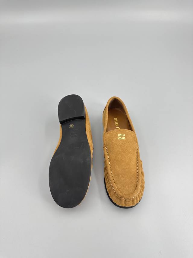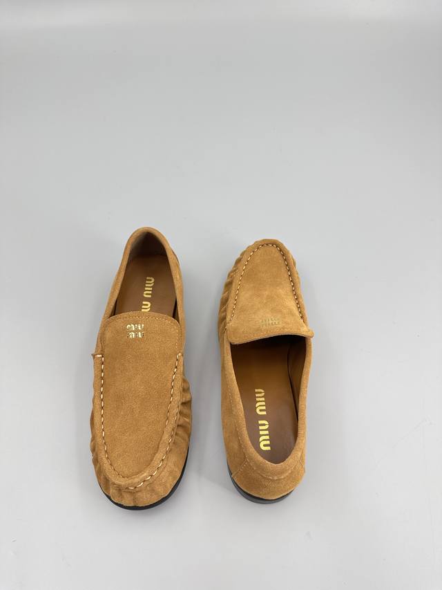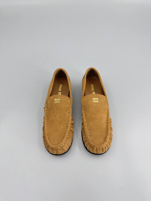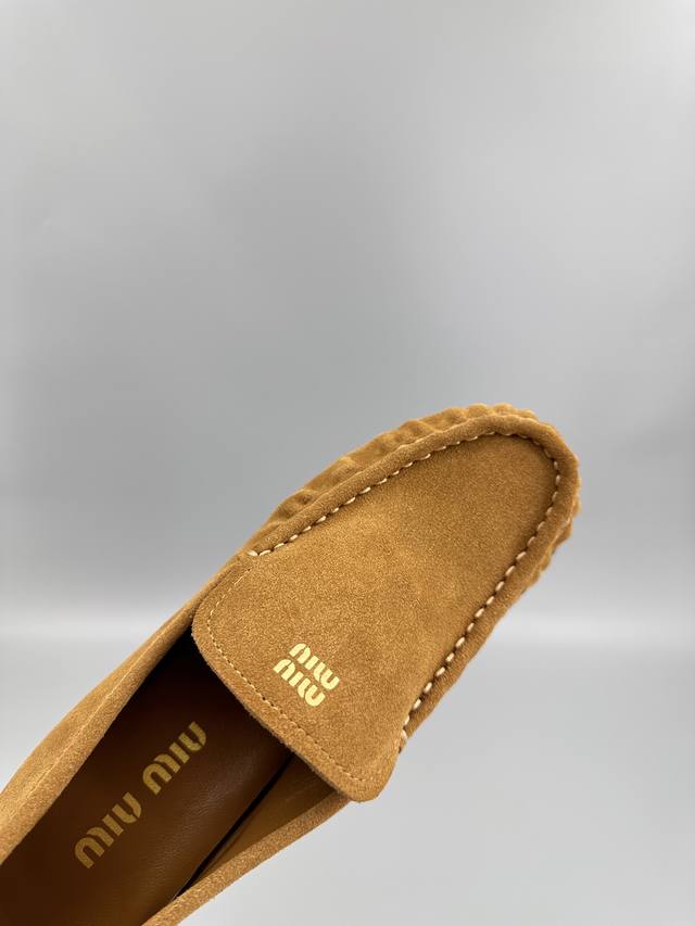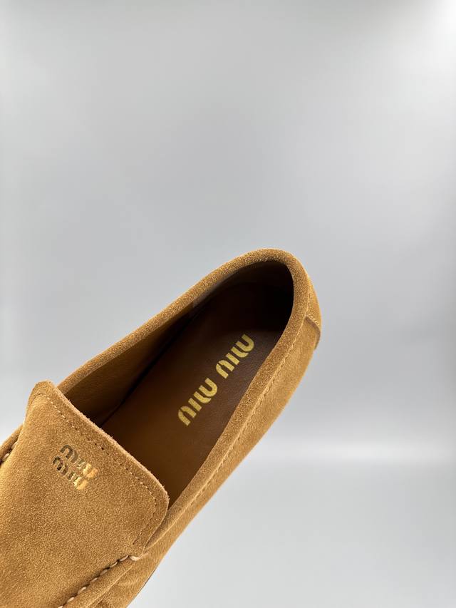 Correct version factory release. Miu Mi* * Spring/Summer 2025 New Suede Loafers in three colors. Miu gold foil suede series is a hot trend. Celebrities have tried them on and ordered them. Super casual and versatile. You won't regret buying them. Authentic design, genuine fit. Upper: Custom imported suede calfskin. Sole: Authentic molded outsole. Colors: Brown, Yellow, Black. Sizes: 35-39. Size 40 can be customized, no returns or exchanges. Full packaging.