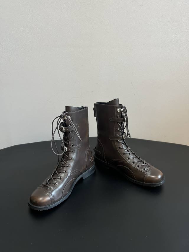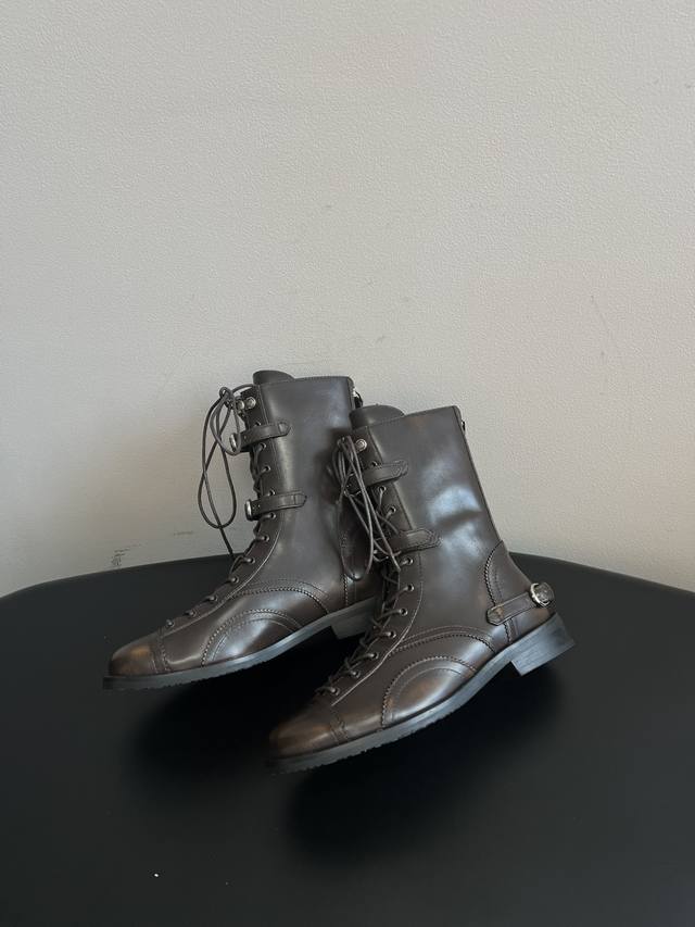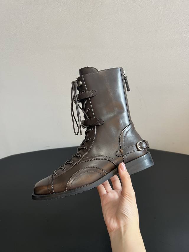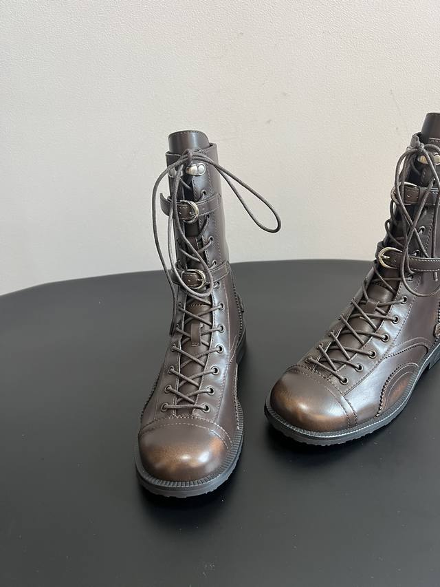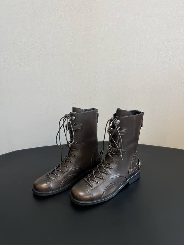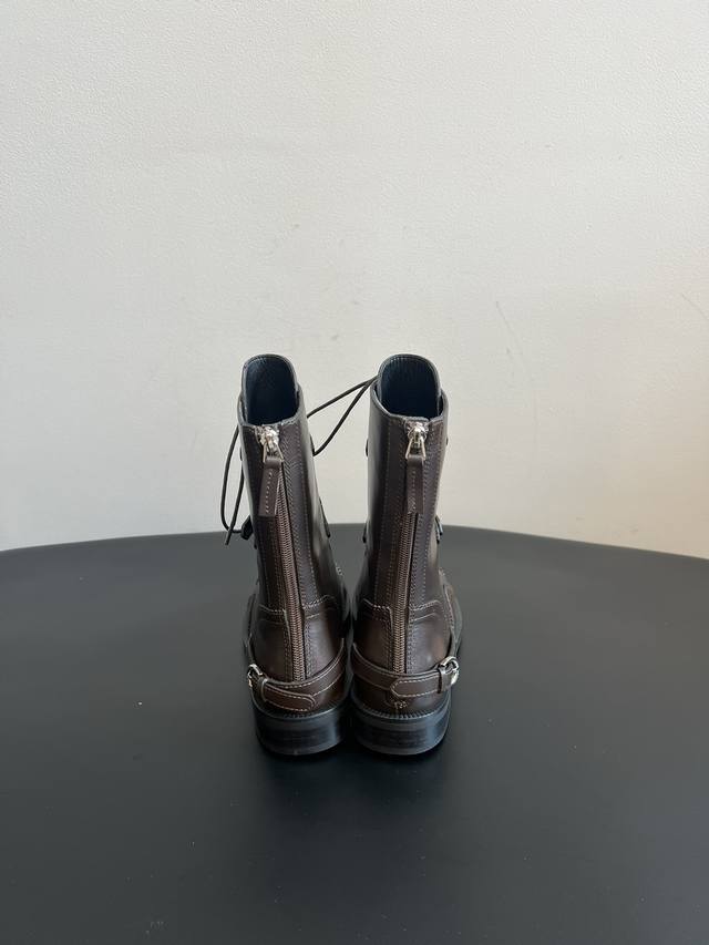 The shoe body adopts a lace-up design, decorated with metal buckles, adding elements of workwear and punk style, making the shoes more personalized; the toe is rounded, comfortable to wear and full of retro feel. The mid-calf boot shape can well modify the leg lines, and the zipper design on the side is easy to put on and take off, taking into account both beauty and practicality.