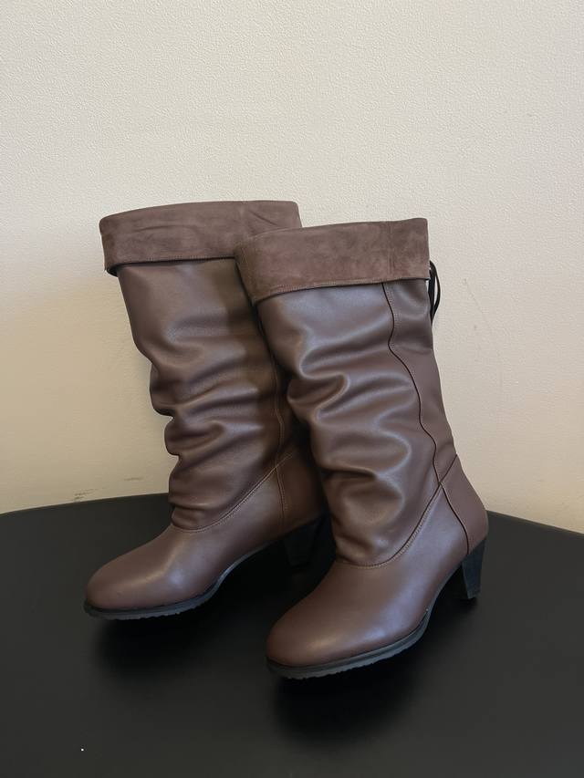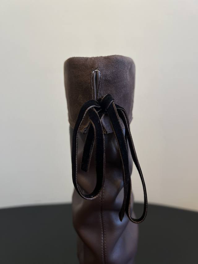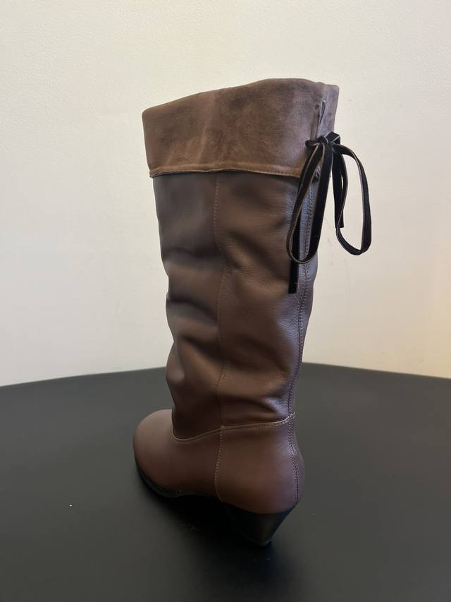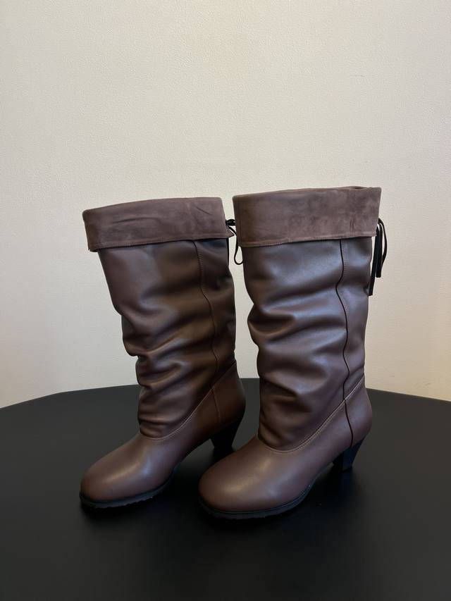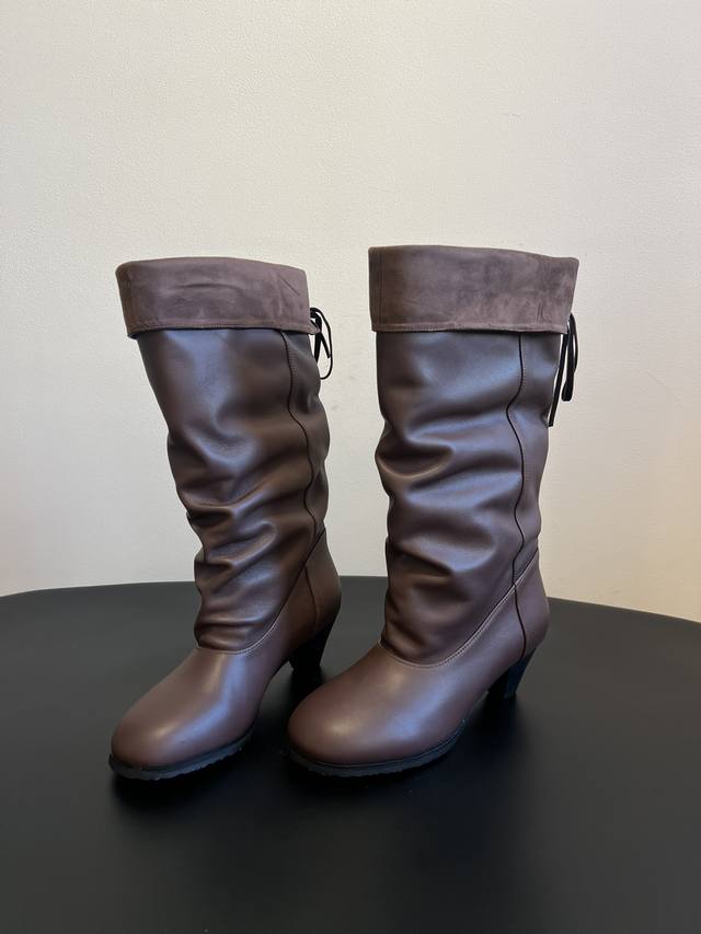 is made of leather and has a natural pleated design on the boot shaft, adding a sense of casualness. The boot opening has a suede material turning up and a small lace-up decoration, which is exquisite and unique. It can be paired with a dress to show an elegant and individual temperament.