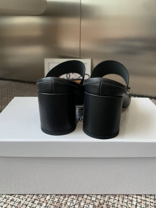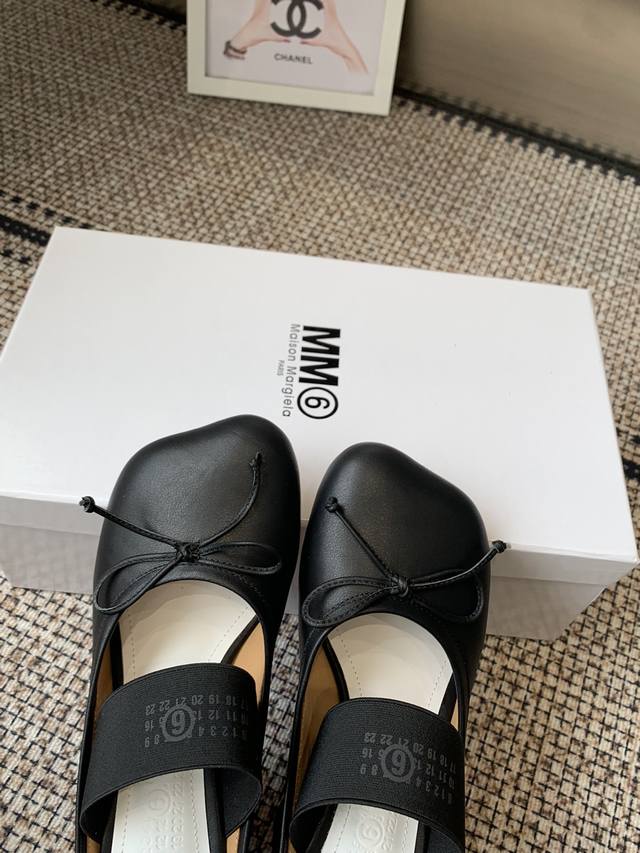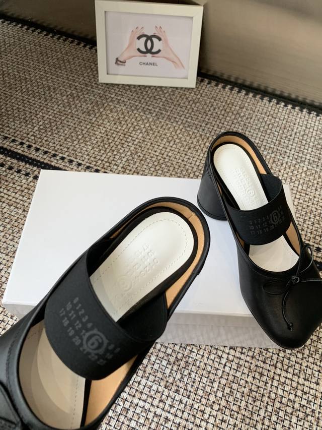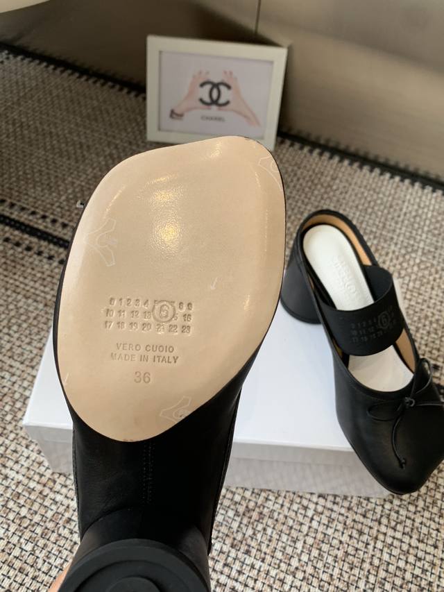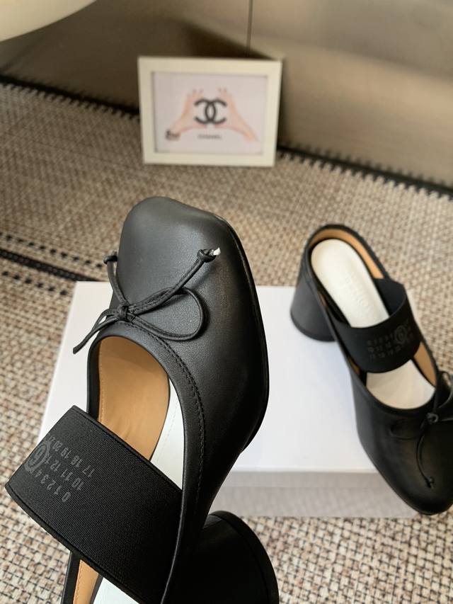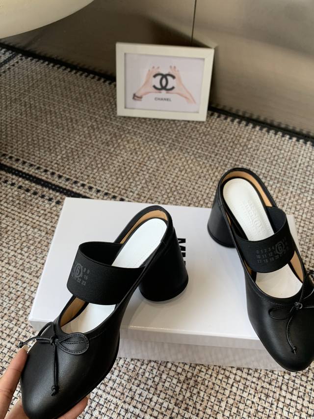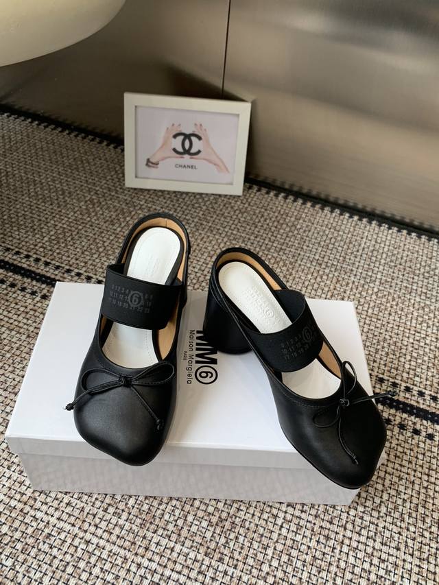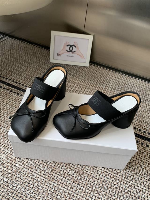 Cowhide leather surface Mm6 Margiela 25Ss latest high-heeled apple-head bow single shoes and half slippers