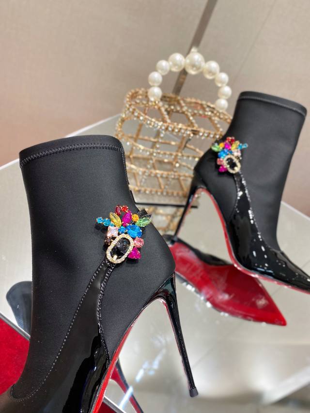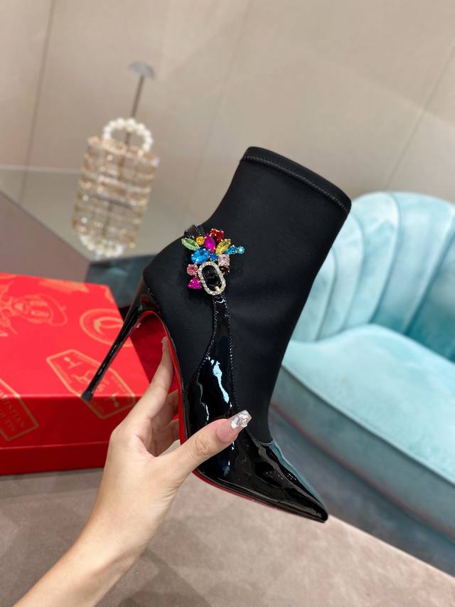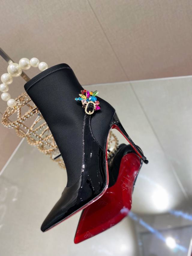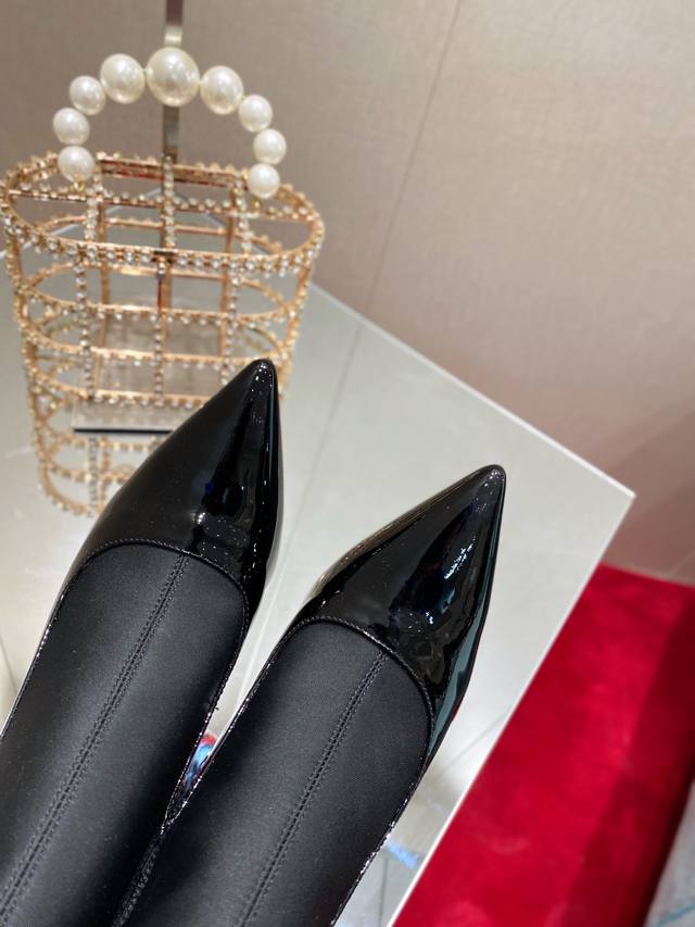 Glossy leather paired with soft satin, adorned with sparkling crystals, shimmering with light as you stride with elegance.