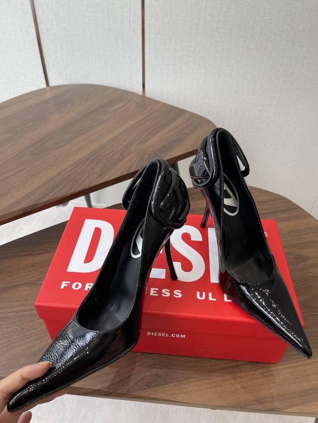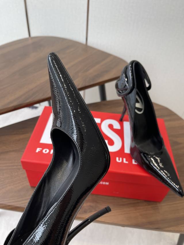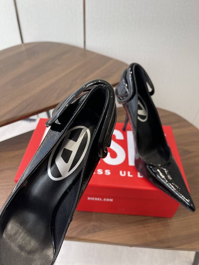 Diesel 2026 New D-buckle High-Heeled Pointed-Toe Shoes. Diesel's designs this year are absolutely amazing! This season subverts traditional designs, creating a rebellious yet fun show. The classic shoe shape outlines sexy charm. The textured logo adds a touch of casual playfulness. The whole series is casual yet restrained, full of playfulness. You'll fall in love at first sight with these high heels. A must-have for cool and hot girls! Upper: Tumbled patent leather; Lining: Cowhide; Outsole: Genuine leather. Size: #35-40. Size 40 is custom-made and non-refundable.