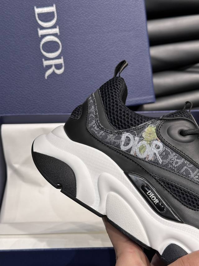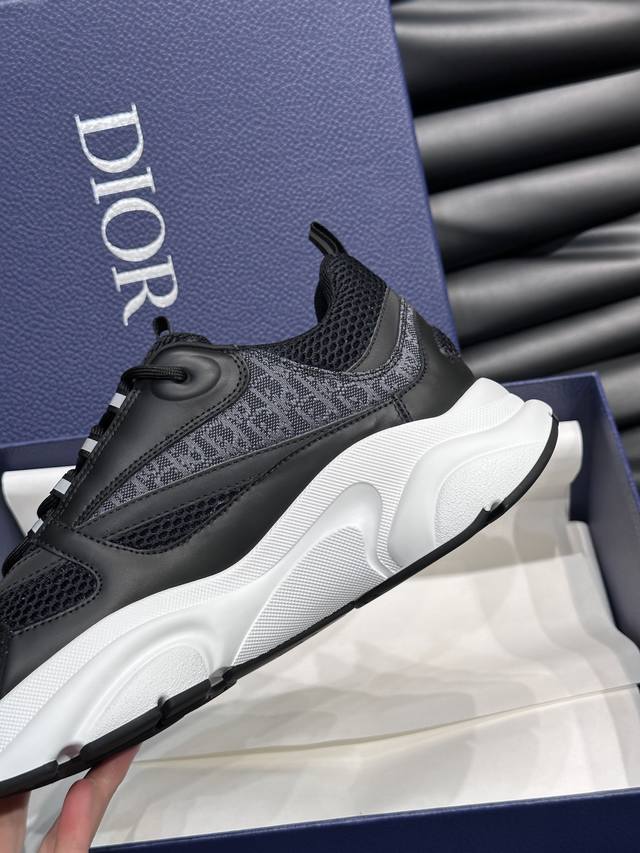 Dio* B22 men's fashionable jogging sneakers, this item draws inspiration from retro jogging shoes. It adopts a thick low-top design, with a black cowhide and mesh fabric upper, paired with a black and white engraved rubber sole. The black mesh fabric tongue and heel support complement the black shoelaces, and the side is decorated with an embossed "Di~R" logo. This sneaker can be mixed and matched with a classic suit to add a sporty and fashionable touch!