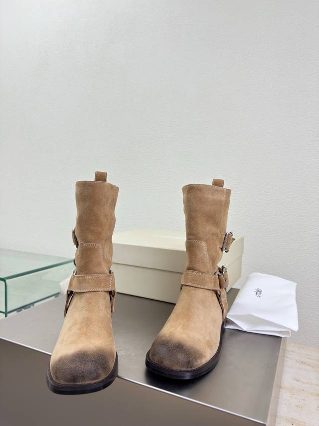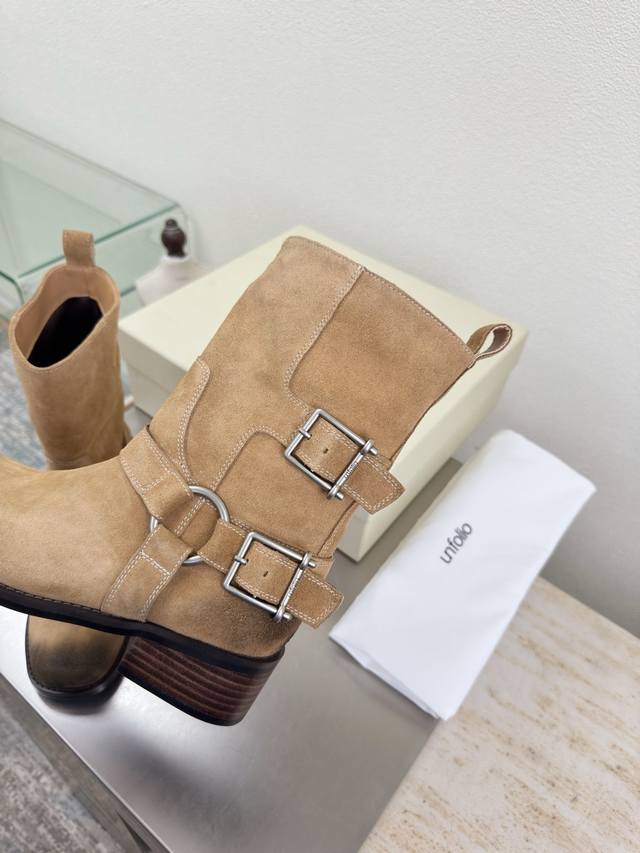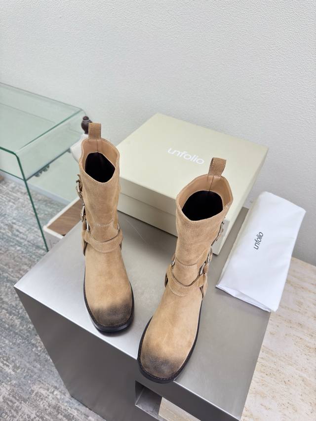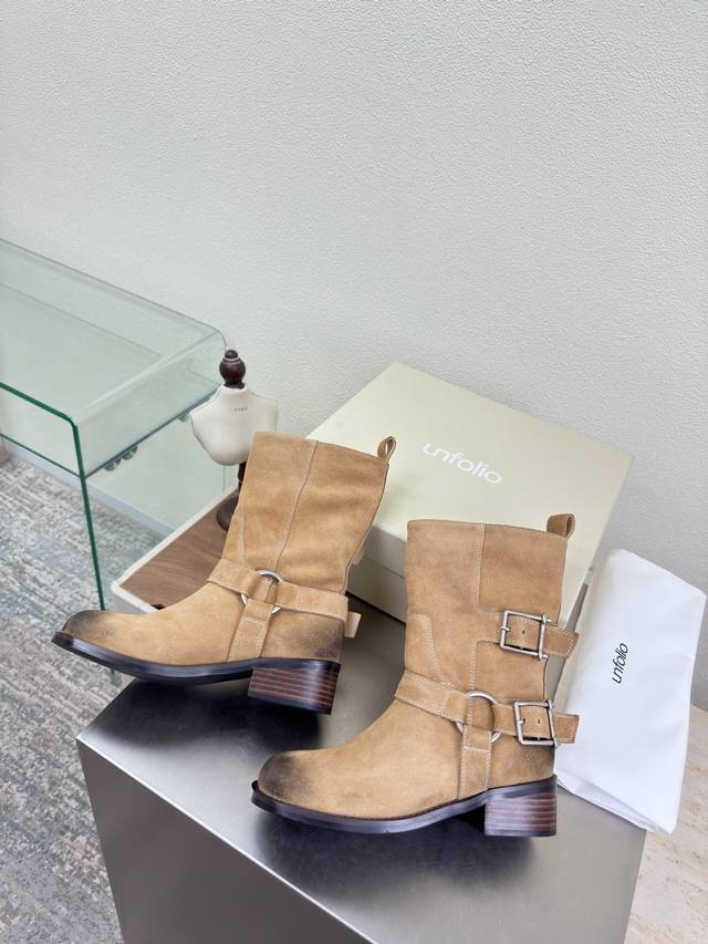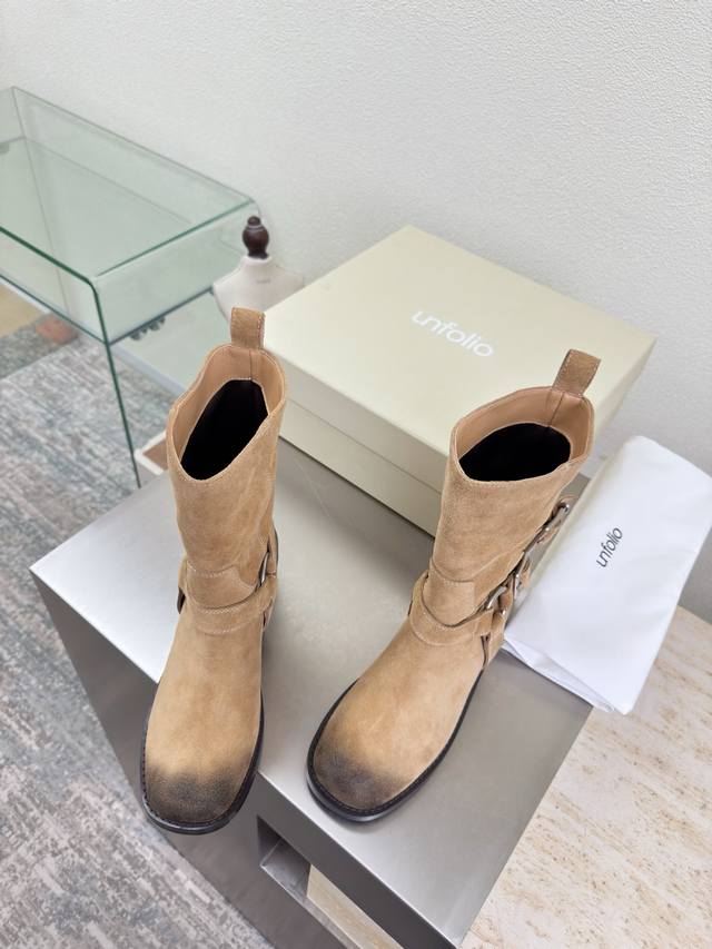 Distressed motorcycle boots, Unfolio boutique ankle boots. New arrival from the 25th Anniversary Fashion Show by a niche designer. Made with high-gloss camel-colored calfskin. Comfortable sheepskin lining. Original recyclable material. Slim fit with rubber outsole. Sizes 35, 36, 37, 38, 39, 40, 41, 40, 41 (custom sizes available). Original packaging included.