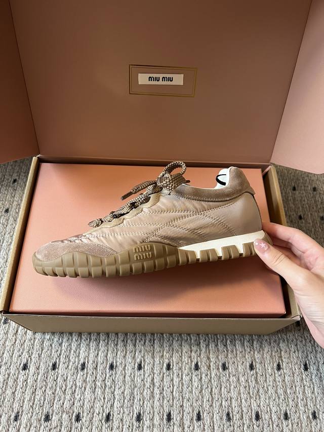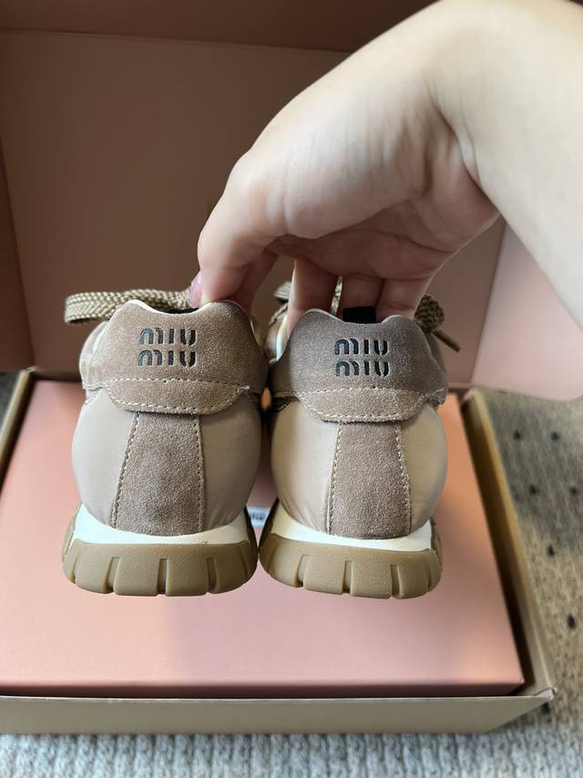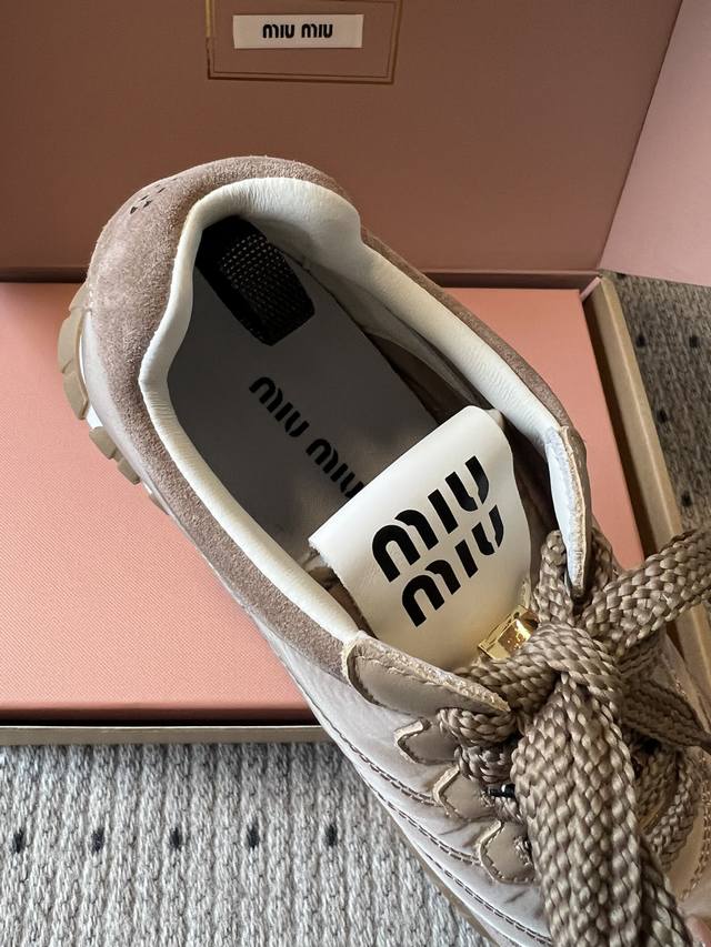 Dongguan-made, high-quality Miu Miu 25Fw Deck Shoes, new patchwork casual sneakers. The upper is made of a combination of nylon and suede, offering a rich texture and practicality. The shoelaces are exquisitely designed with metal embellishments, enhancing the shoe's sophistication. A retro sneaker style, the shoe features classic retro lines, and the thick sole adds a touch of fashion and provides a slight height boost. The brand logo is clearly visible on the tongue, showcasing the brand identity. Pair these pink shoes with a black leather mini skirt, a white cropped T-shirt, and a black leather mini skirt for a sweet and cool look that exudes personality and style. Alternatively, wear them with grey sweatpants and a loose hooded sweatshirt; both light brown and pink shoes create a relaxed and casual style. Upper: Nubuck Lining: Sheepskin Outsole: TPU Size: 35-40 (Size 40 is custom-made and non-refundable).