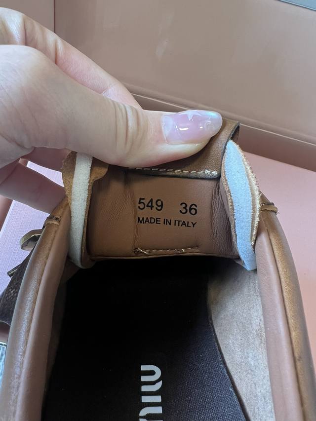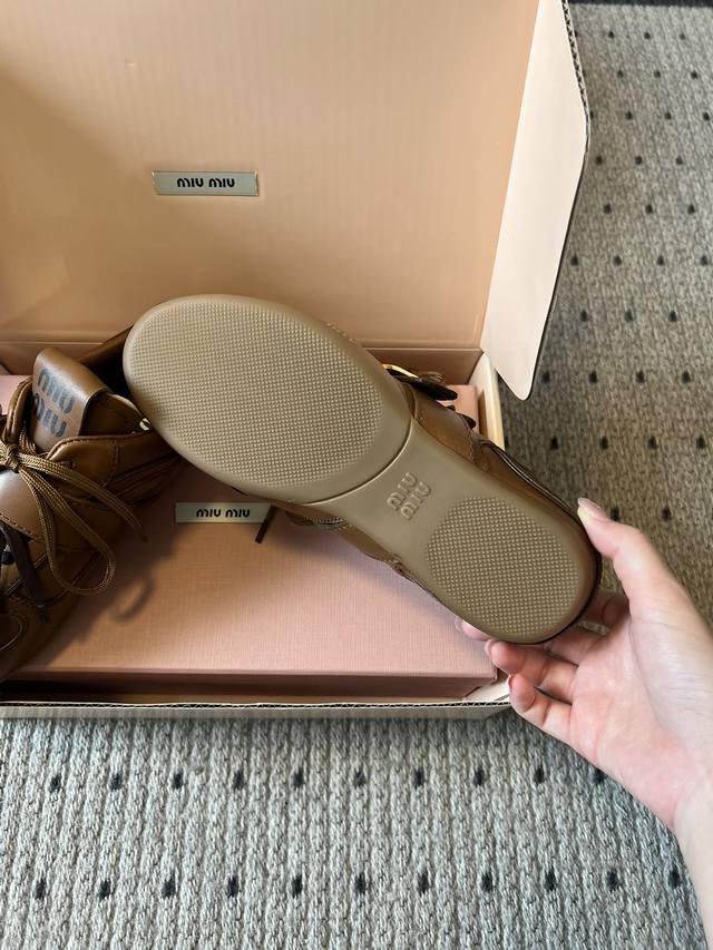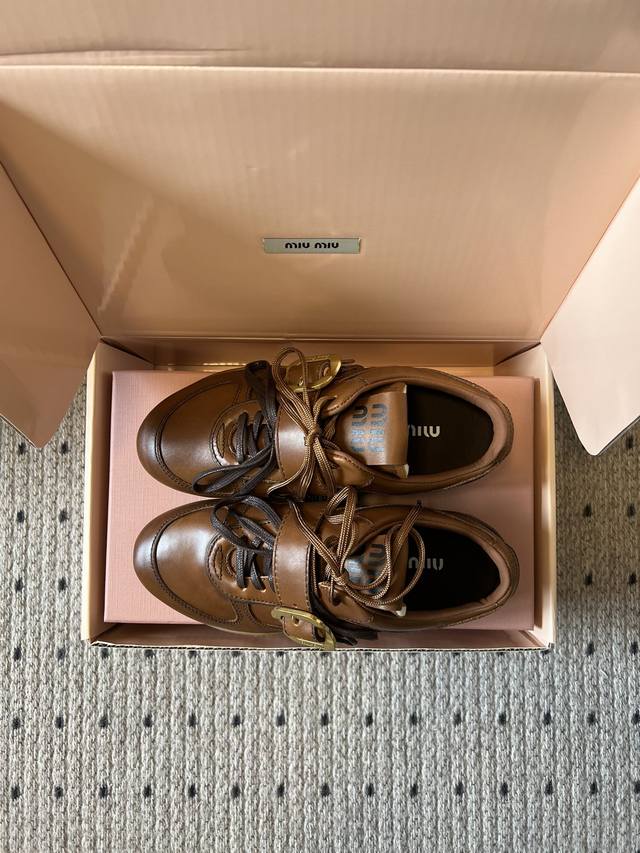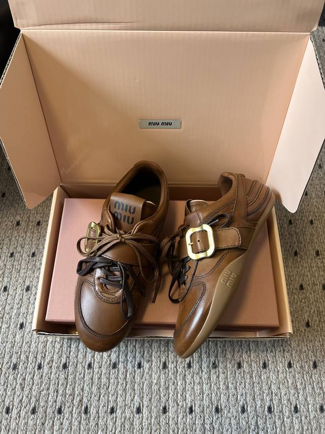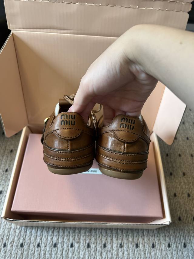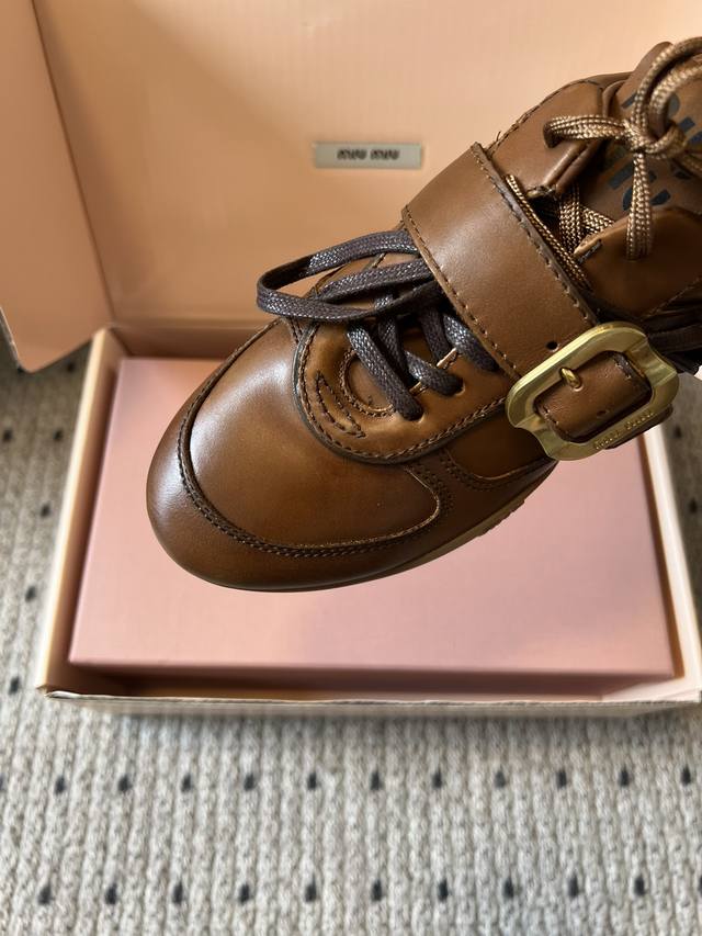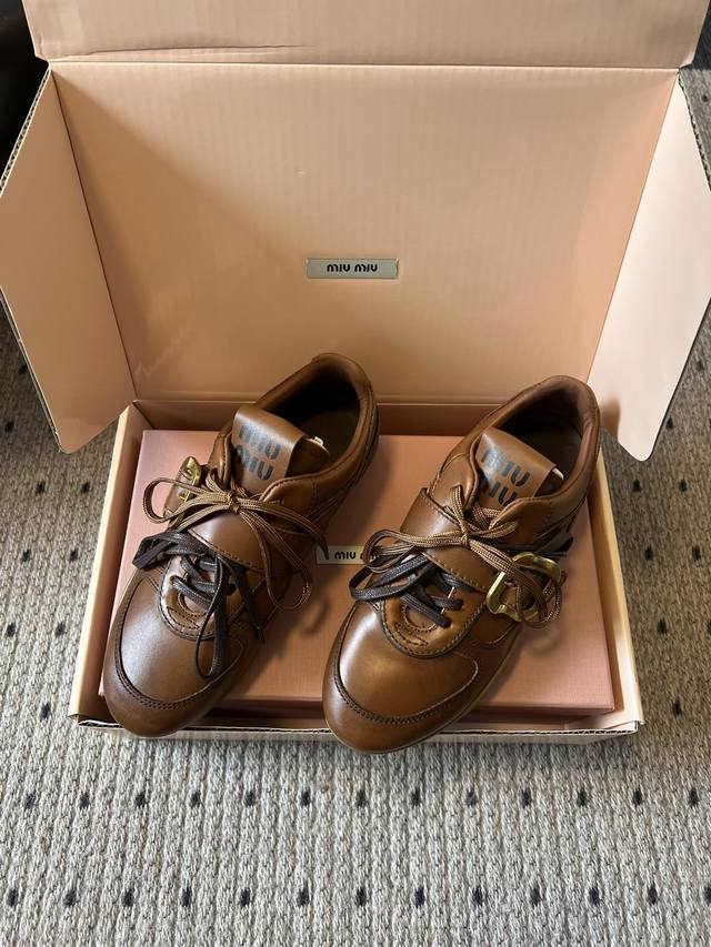 Dongguan-made Miu Mi* 25Fw Deck Shoes, retro leather thin-soled German training shoes. These shoes blend retro and understated luxury. The brown genuine leather upper features a delicate, distressed sheen. The double-layered design of the laces and metal buckles, along with the distressed brass buckles, makes them highly recognizable. The brand logo on the tongue reinforces the brand's identity. The overall design is retro yet sophisticated. Made of high-quality genuine leather, these shoes are soft to the touch and feature a distressed texture. The stitching is meticulous, and the distressed finish of the metal buckles complements the leather perfectly, offering both durability and aesthetic value. Upper: Worn waxed calfskin; Lining: Full sheepskin; Outsole: TPU; Size: 35-40.