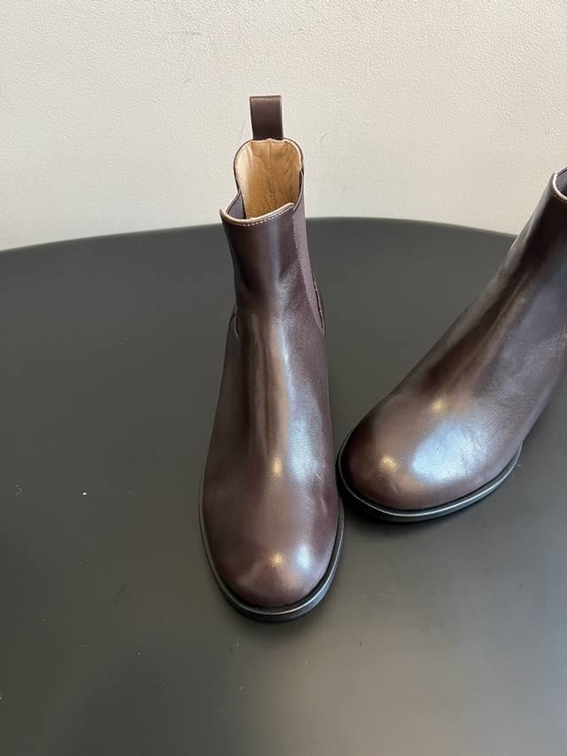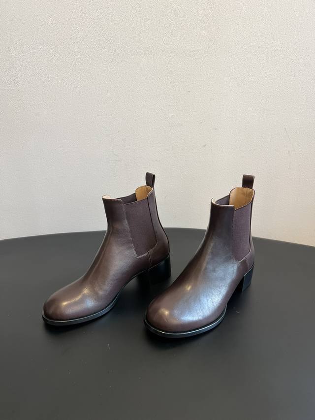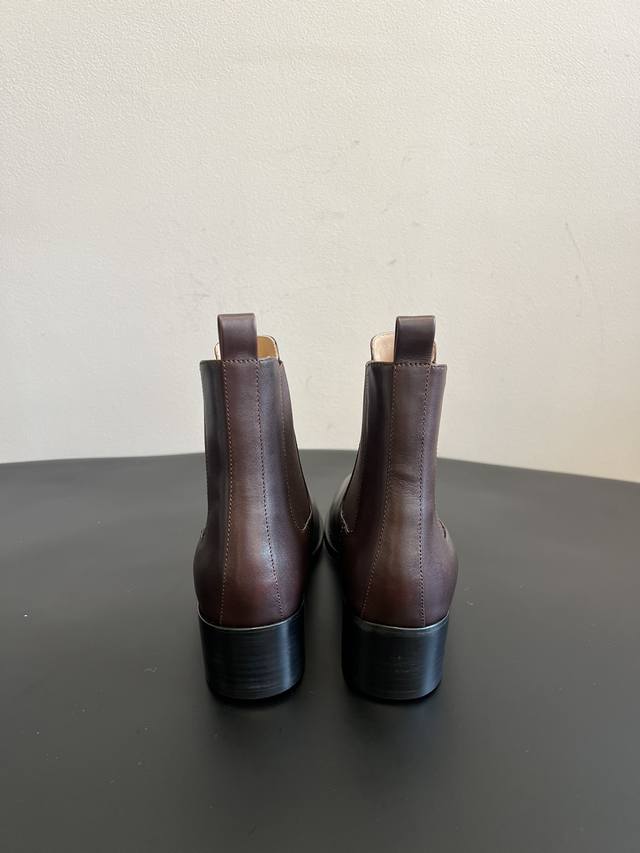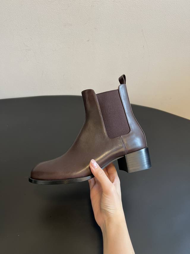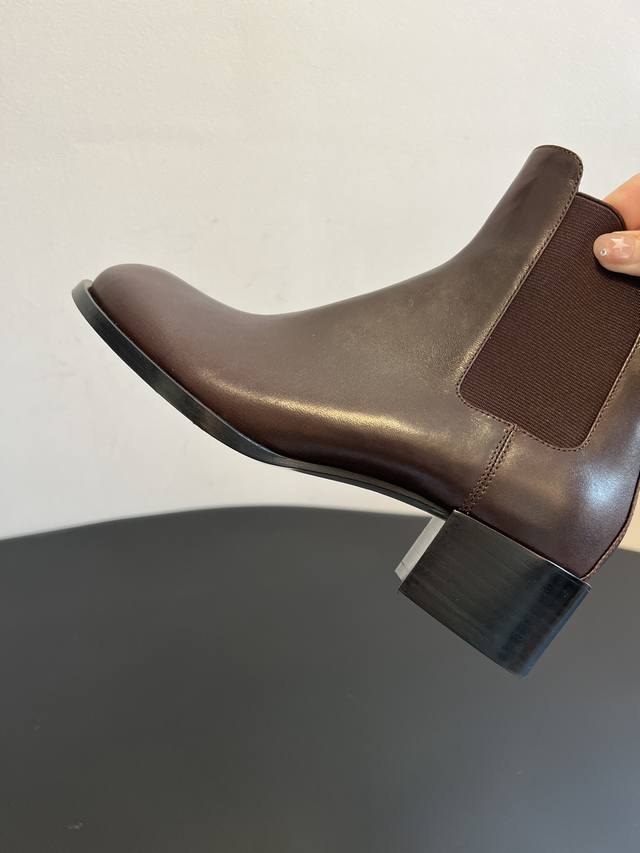 The Ro* Chelsea Leather Ankle Boots. Featuring a classic Chelsea boot design with no laces, these boots rely on elasticated sides for easy on and off. A pull tab at the heel adds both practicality and design detail. Made from high-quality leather, the boots are delicate and lustrous, with meticulous craftsmanship showcasing a premium feel and durability. The chunky mid-heel design provides a slight height boost while ensuring comfort, adding a touch of sophistication. Pair with straight-leg jeans; dark brown boots can be paired with light blue jeans, while black boots with dark blue jeans. Add a simple sweater or sweatshirt for a casual yet stylish look. Upper: Imported lambskin; Lining: Imported lambskin; Outsole: Italian genuine leather bottom layer and heel; Size: 35-40 (40 size custom orders are non-refundable).