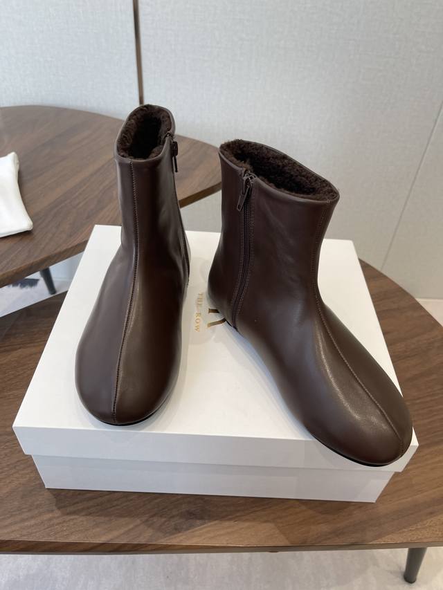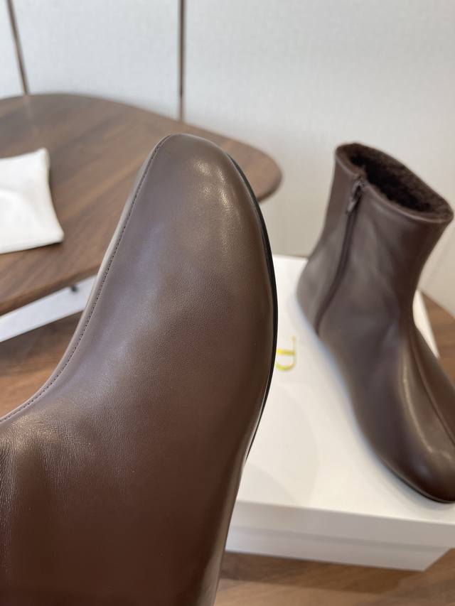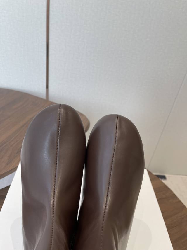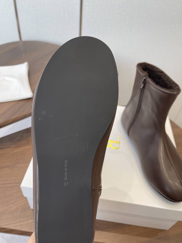 Dongguan-made The Row 25Ss Autumn/Winter New Minimalist Flat Leather Ankle Boots (DDD). Featuring an oval last with smooth lines and a comfortable fit, the narrow ankle boots visually lengthen the legs, creating a sleek and slimming silhouette. A side zipper closure makes them easy to put on and take off. The flat, basic design prioritizes everyday comfort, with minimal embellishments, aligning with the brand's "less is more" design philosophy. DDD primarily offers classic black, dark brown, and caramel brown earth tones, low-saturation and versatile, suitable for various autumn/winter styles, from casual to work attire. The craftsmanship between the upper and sole is meticulous, and the soft leather lining provides a comfortable, non-abrasive feel. DDD Upper: Imported lambskin Ddd Lining: Imported Australian lambskin Ddd Outsole: Rubber outsole Ddd Heel height: 1cm Ddd Size: 35-40, size 40 is custom-made and non-refundable DDD