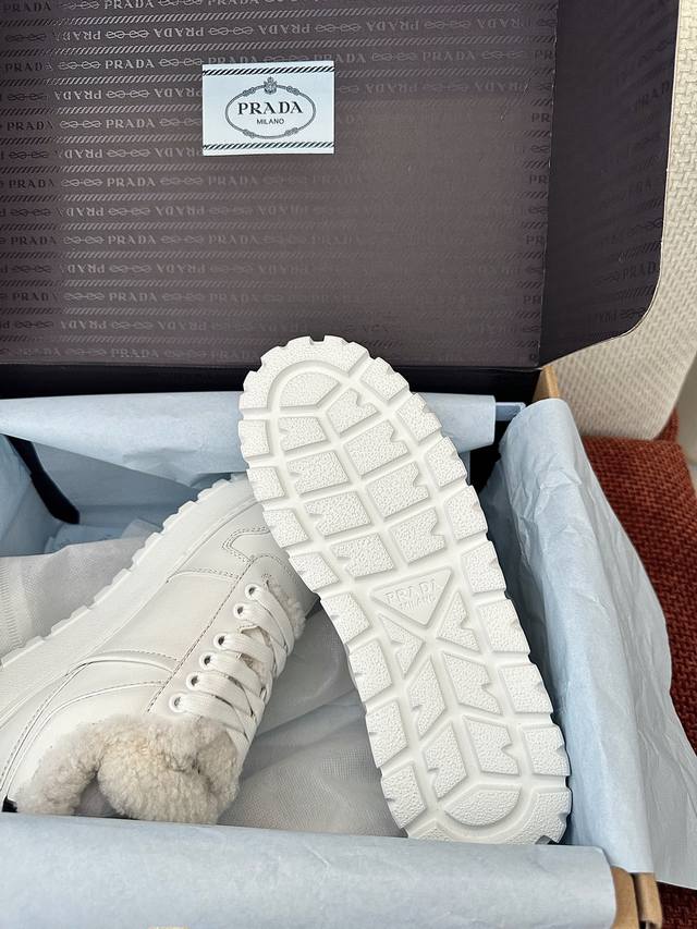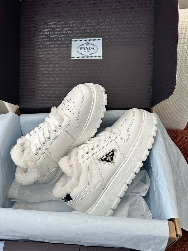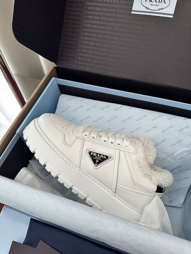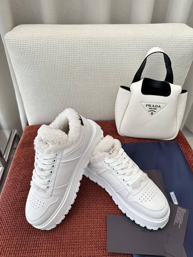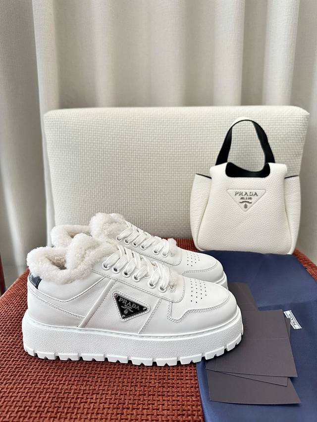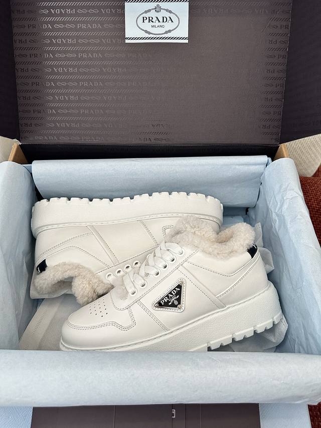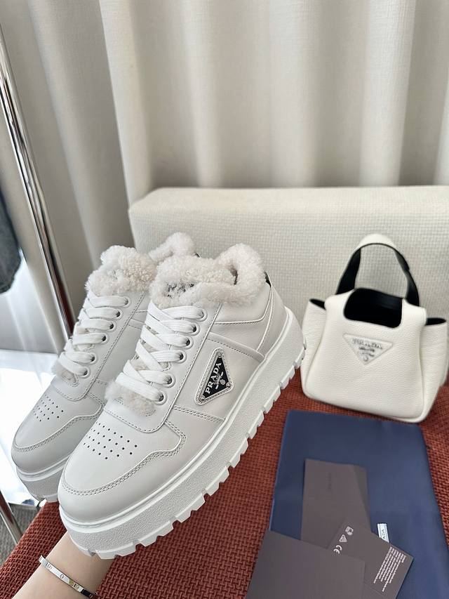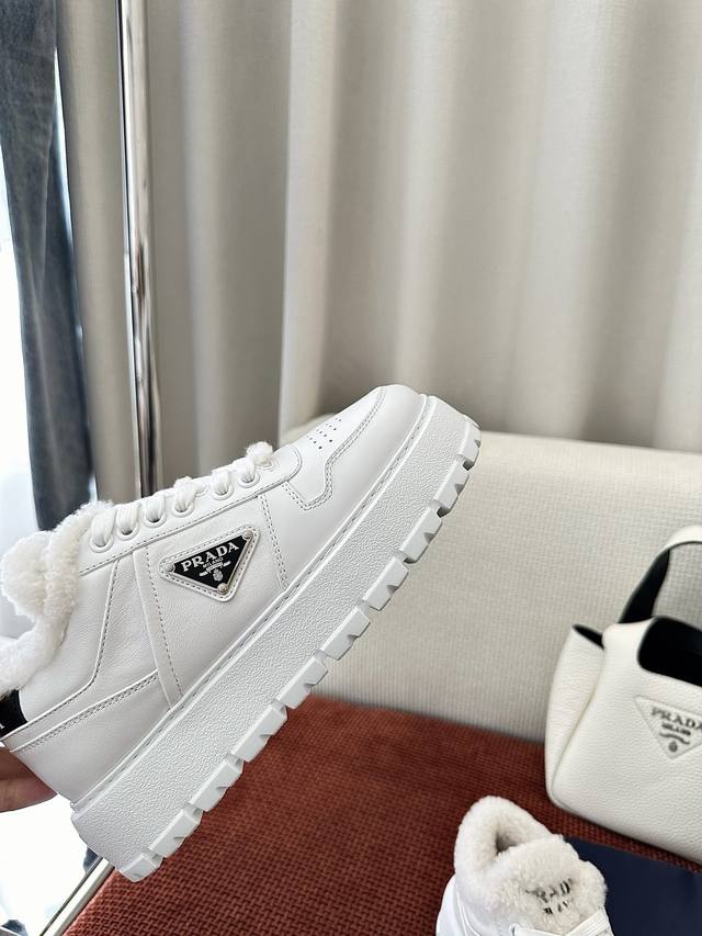 Dongguan-made *Triangle logo leather and lamb wool sneakers