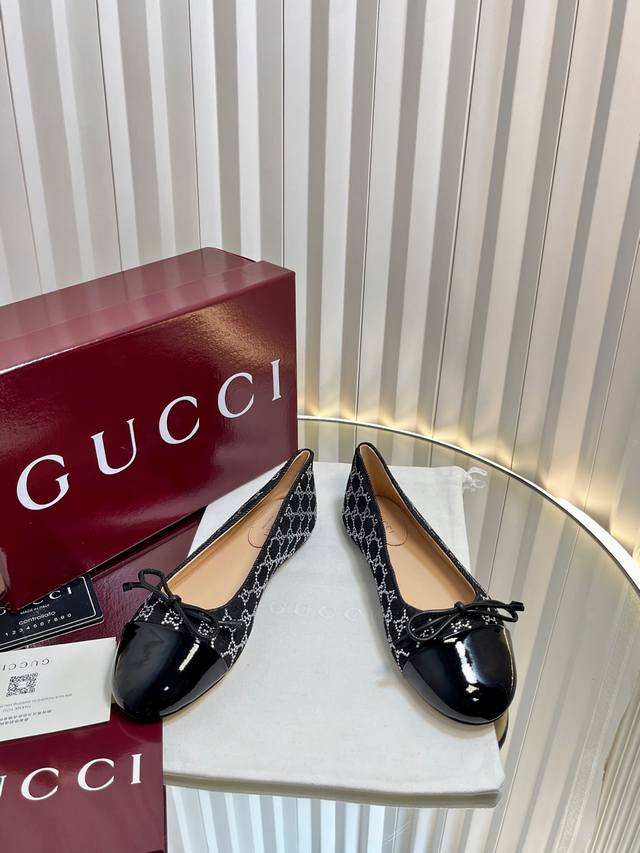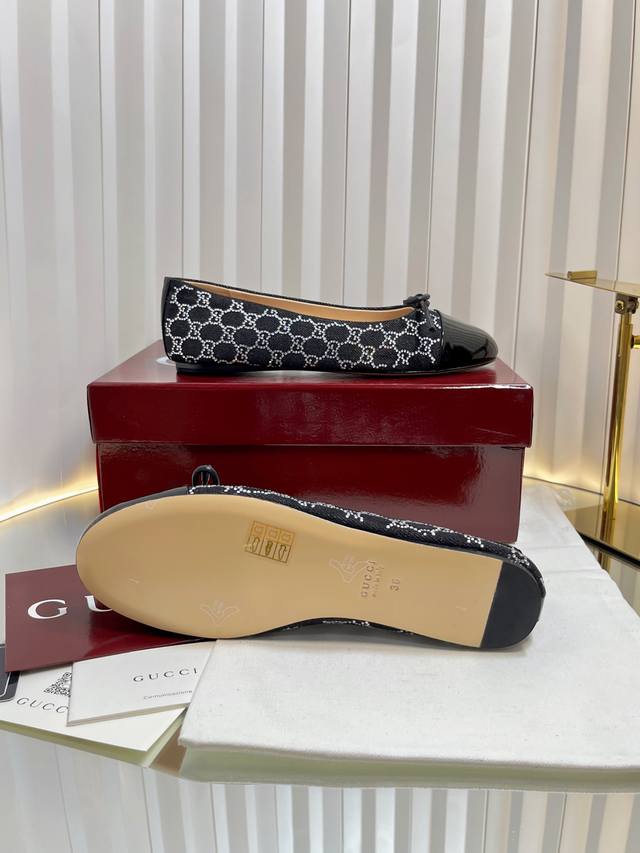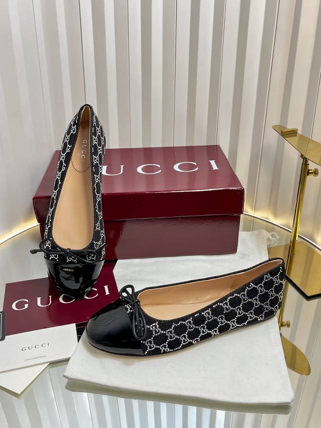 Double G rhinestone-embellished ballet flats. These ballet flats are crafted from canvas with GG rhinestones and a patent leather toe cap, embodying a timeless elegance. A delicate bow accentuates femininity, while light gold Double G hardware subtly echoes the brand's instantly recognizable logo. Italian leather sole. GG rhinestone canvas upper. Patent leather toe cap. Available in sizes 35 to 42. Custom sizes 40, 41, and 42 are non-refundable.