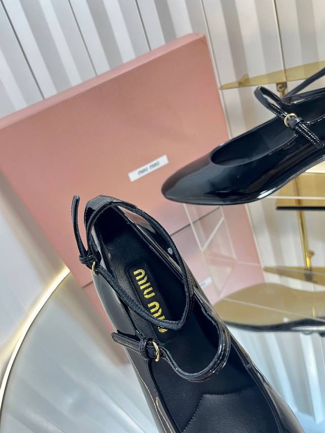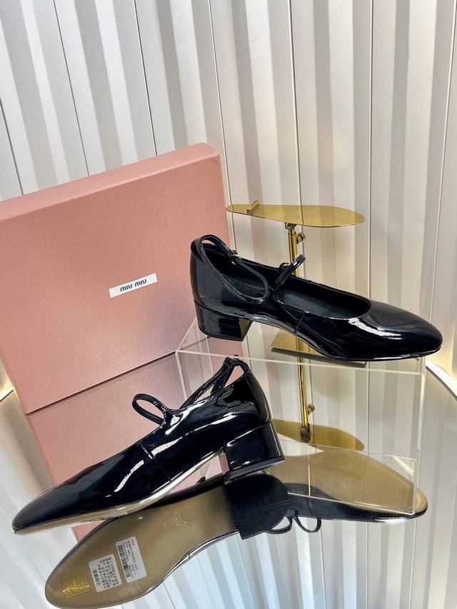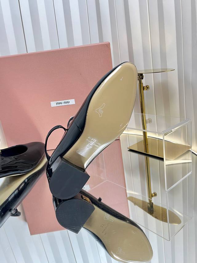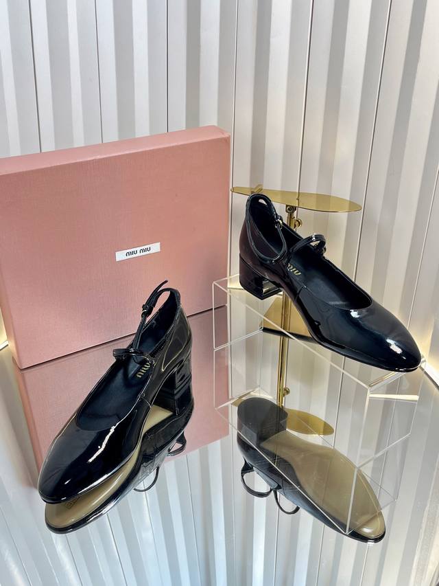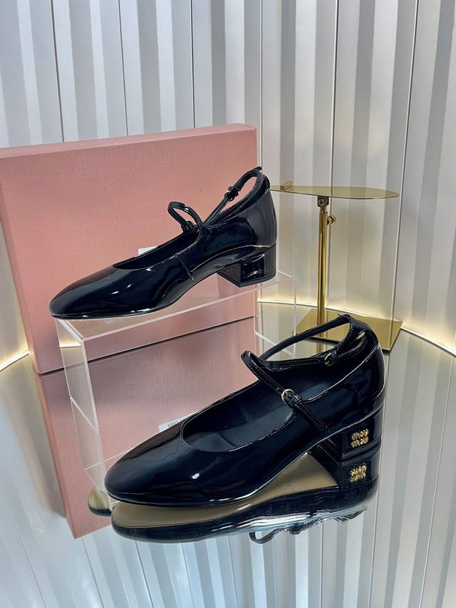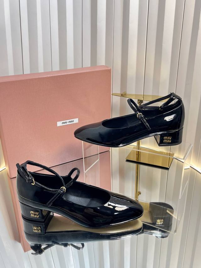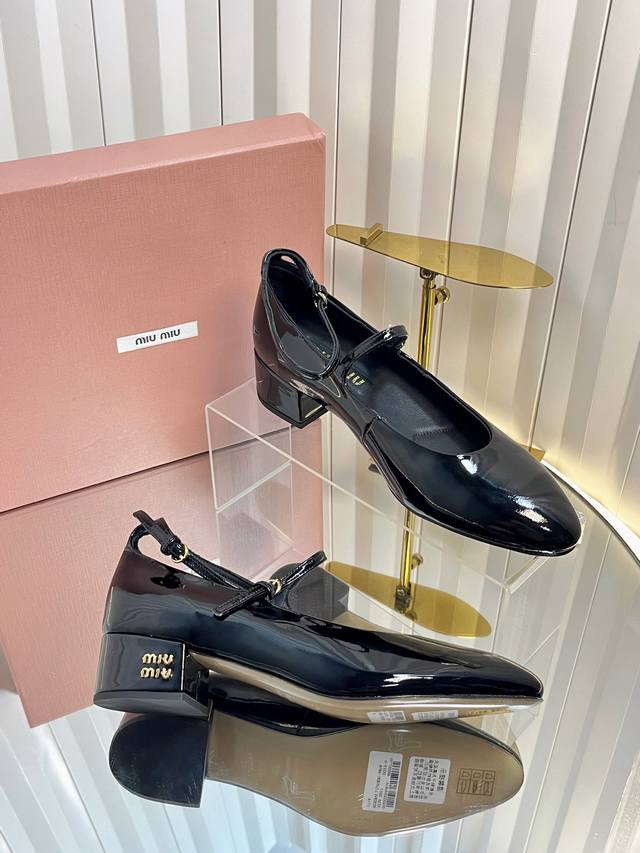 Exclusive New Arrival: Miu Ss25 New Arrival! Miu's 2025 Spring/Summer Chunky Heel Mary Jane shoes. Glossy patent leather upper with a single strap, adorned with a metal Miu logo on the heel, full of detail and texture
