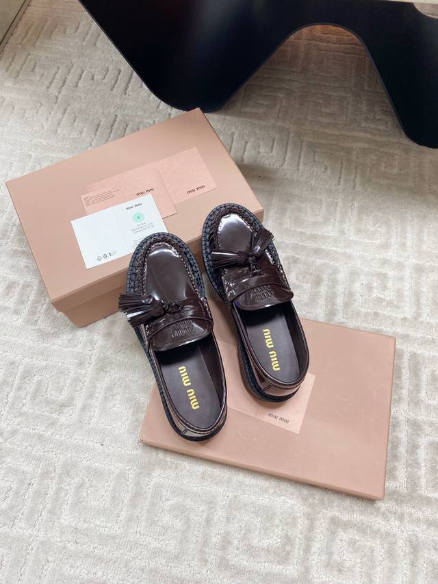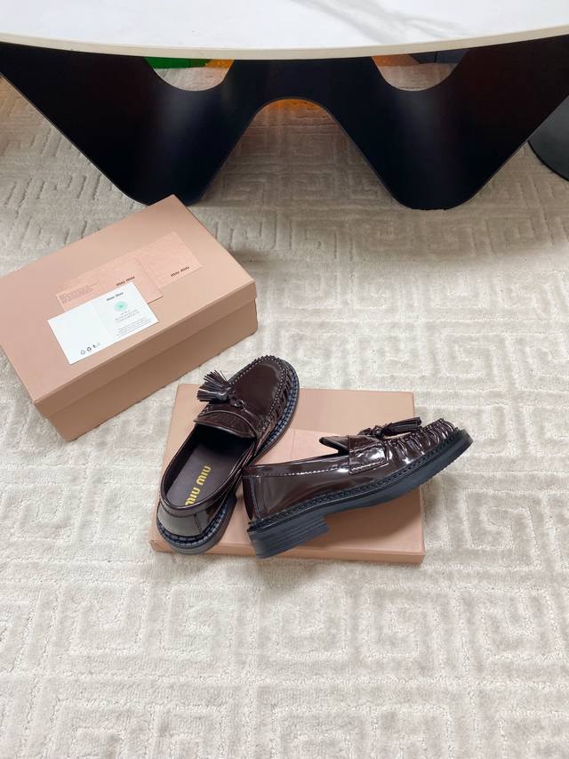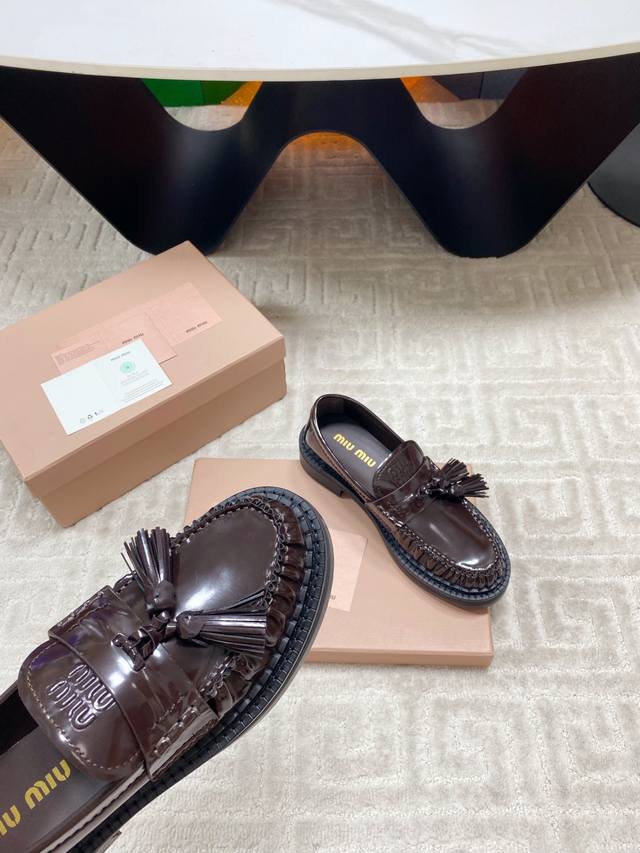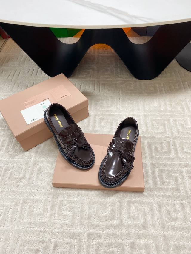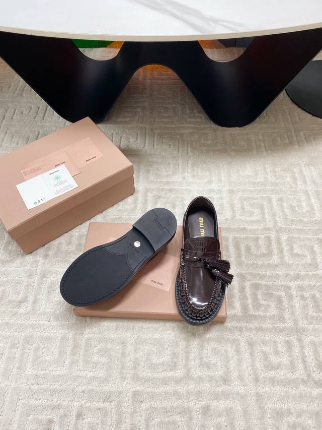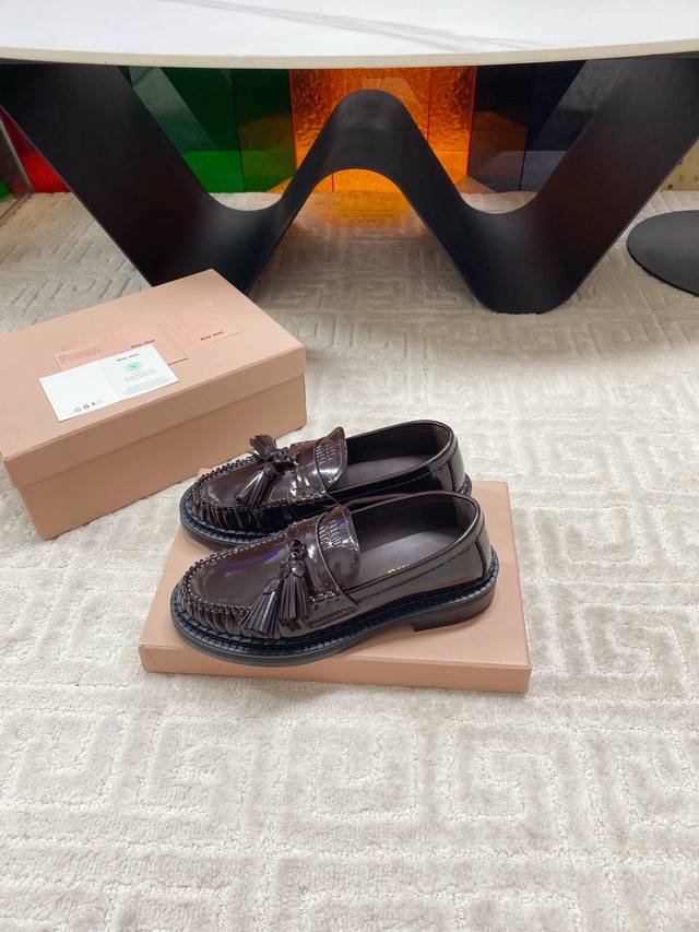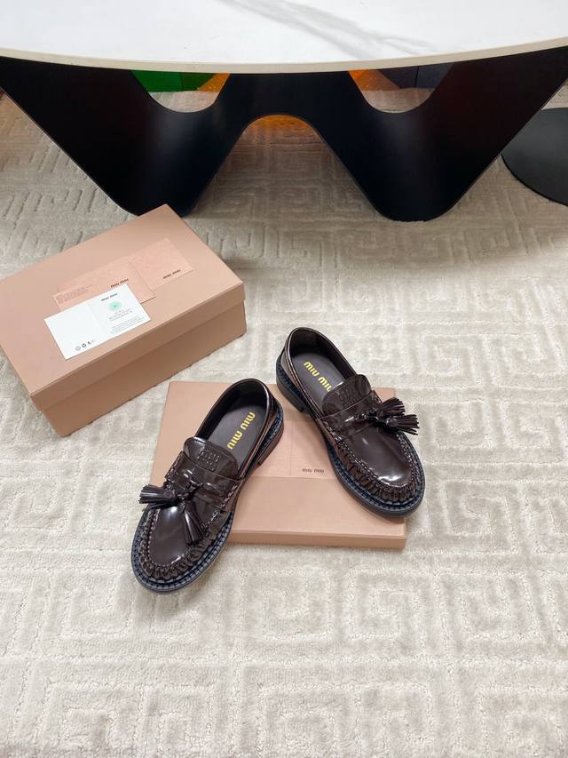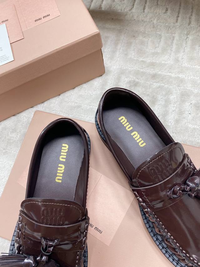 Factory 25Ss new autumn and winter Miu Miu tassel pendant loafers, retro old money style thick-soled single shoes. This brogue has simple lines and a classic design, decorated with Miu Miu printed two stripe details. The detailed design stands out among the other loafers. The overall shoe shape is sleek and delicate, not bulky at all, and can completely expose the ankle, which is in good proportion to the leg line.