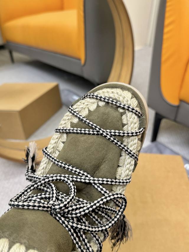 A stylish and warm fall/winter item! The upper is made of sheepskin imported from Australia, with understated rhinestones and hand-crocheted hem details. The unique design is full of craftsmanship! The thick, dense wool lining warms the entire foot. The sheepskin is dyed with eco-friendly dyes and made of EVA material. Sizes: 35-40.