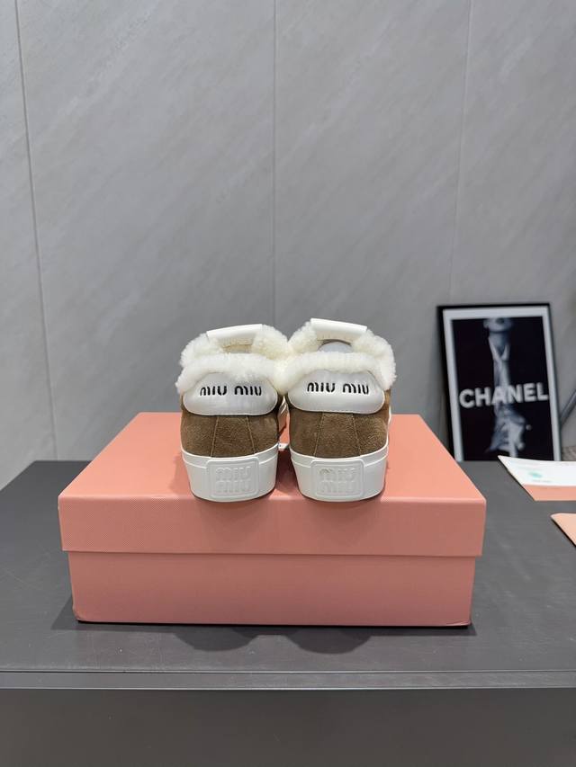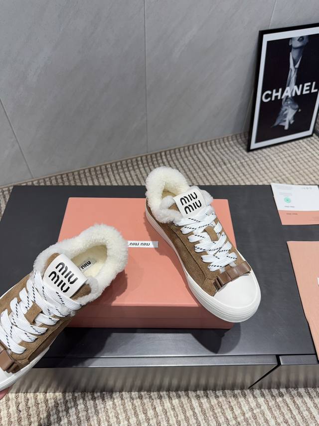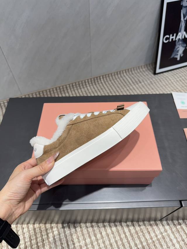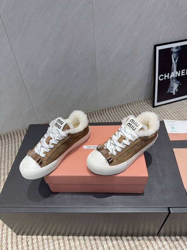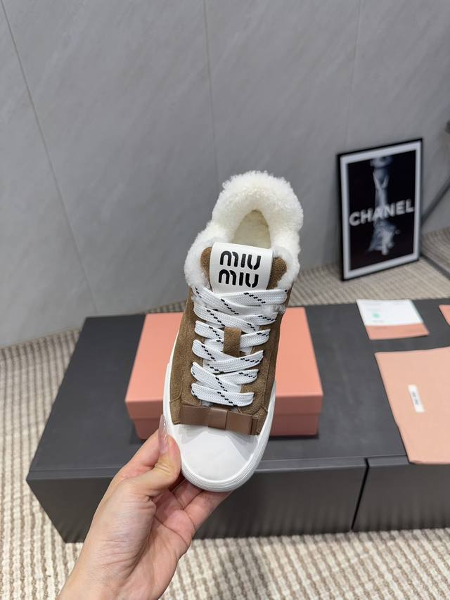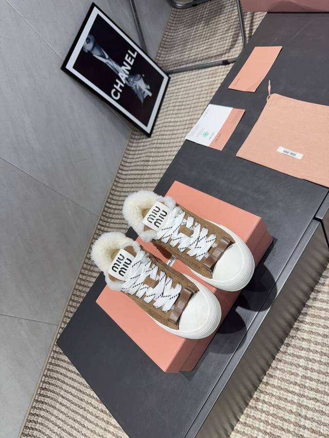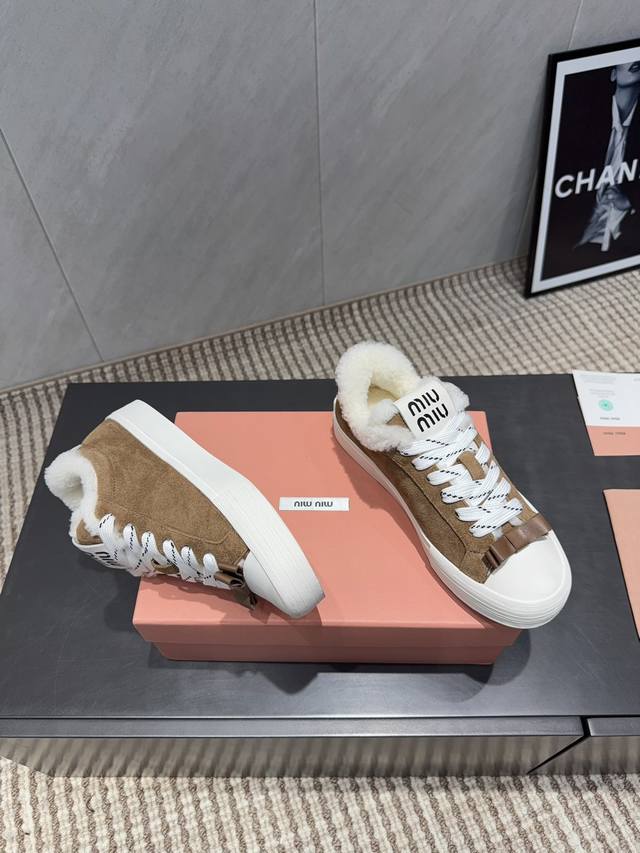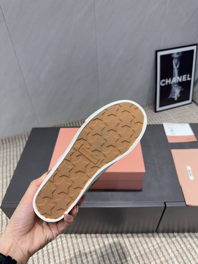 Factory Direct: Exclusive Top-Tier Version Miu Miu 2025 VS Latest Hot-Selling Casual Shoes Series Thick-Soled Fleece-Lined Casual Shoes Miu Miu's latest hot-selling style features a bold and avant-garde design. The Miu Miu style is integrated into the simple lines of this thick-soled canvas sneaker. Unique logos adorn the tongue and back, adding a retro touch and signature element! The thick-soled design defines a modern and avant-garde style. Material: Original custom cowhide and suede color-blocking process. Lining: Original custom wool. Insole: Original custom wool. Outsole: Original molded anti-slip sole. Packaging: Original full packaging. Sizes: 35-39, 40, 41. Customized. Colors: Updated simultaneously with the official website.