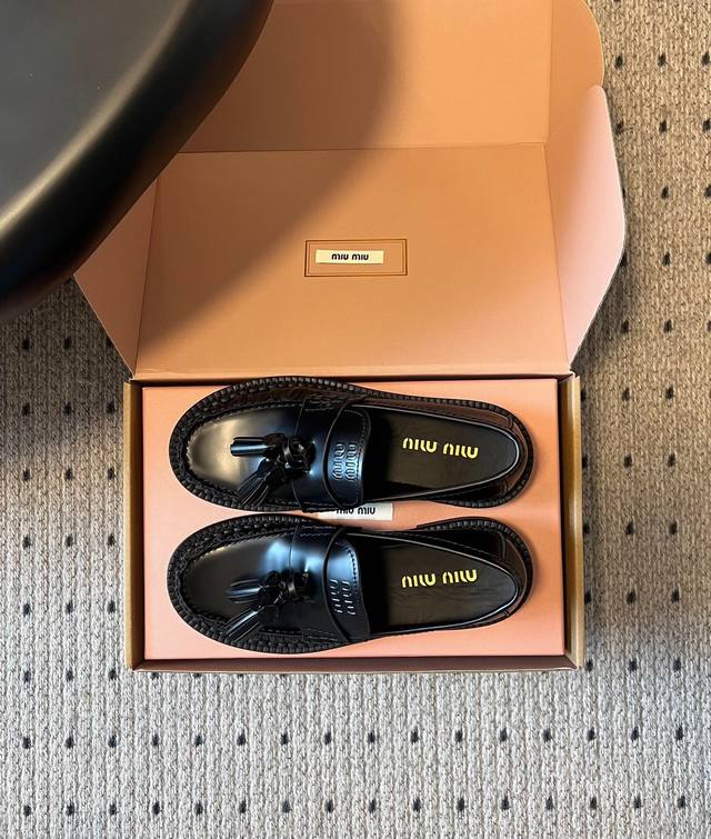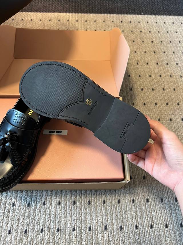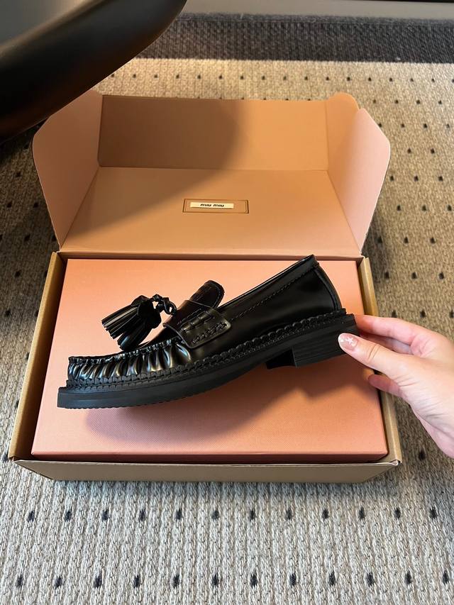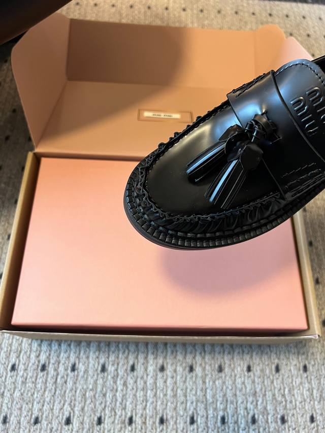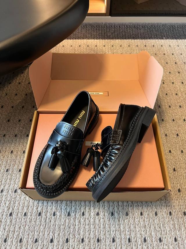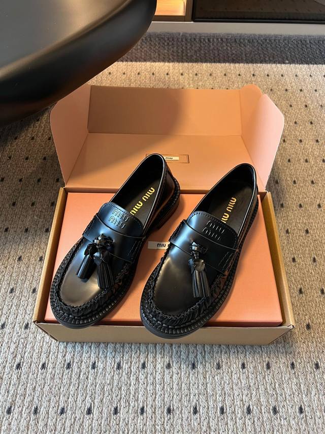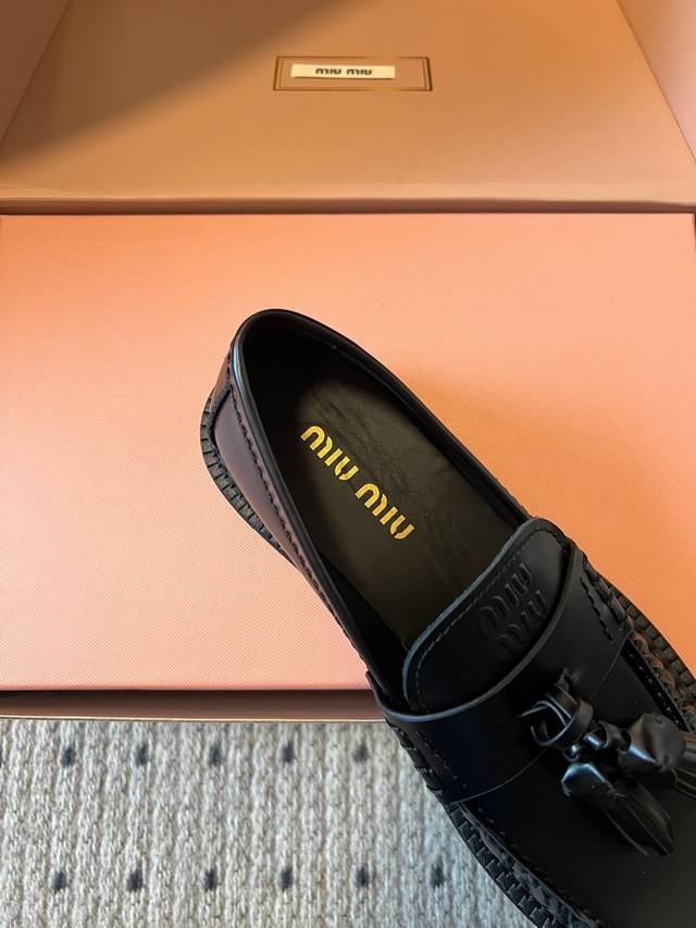 Factory Direct Miu Mi* 25Fw Deck Shoes New Tassel Loafers DDD Blending retro and modern styles, the classic loafer silhouette is adorned with tassel embellishments, adding a lively and playful touch; the platform design also brings a hint of retro British style, while enhancing the overall look. Made of high-quality leather, the shoes have a delicate texture and excellent luster. The stitching is exquisite, and the tassel details are meticulously crafted, showcasing the brand's refined workmanship. DDD Pair them with a pleated skirt and a white shirt, topped with a knitted cardigan, to create a fresh and youthful campus style. The tassel elements of the shoes complement the lively feel of the preppy look perfectly. DDD Upper: Cowhide DDD Lining: Cowhide DDD Outsole: Original mold outsole DDD Size: 35-40 DDD