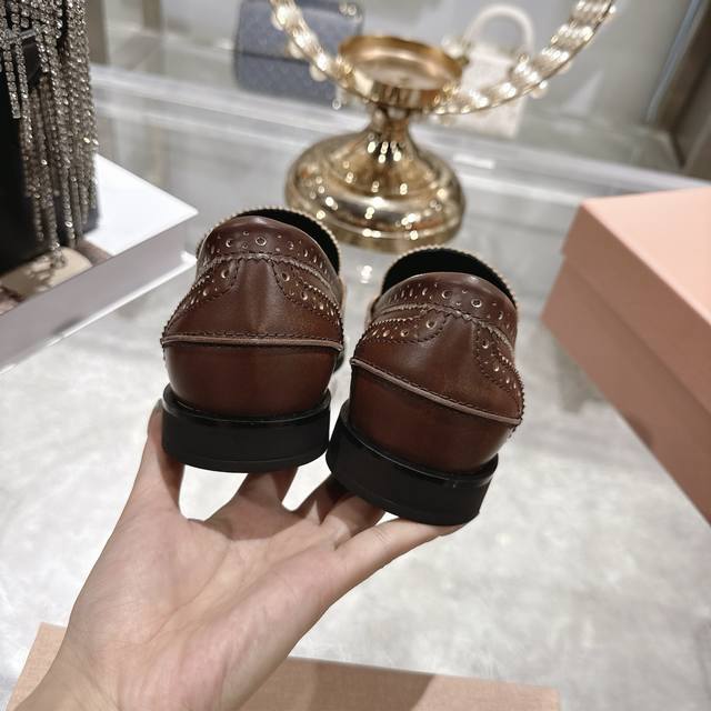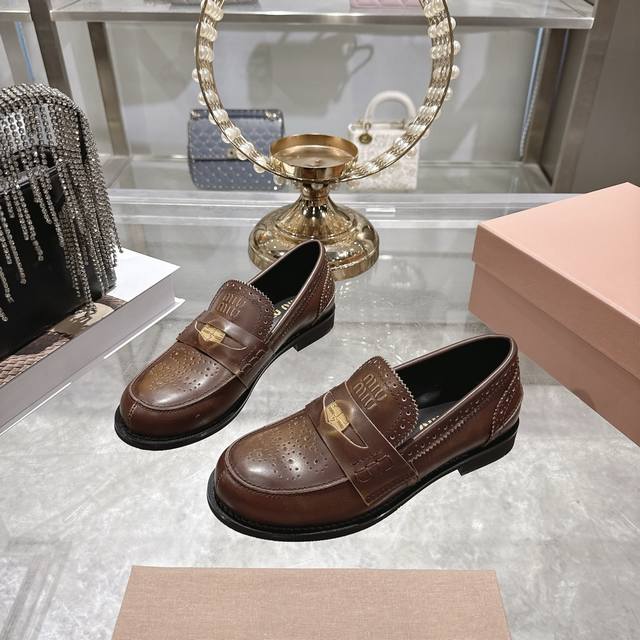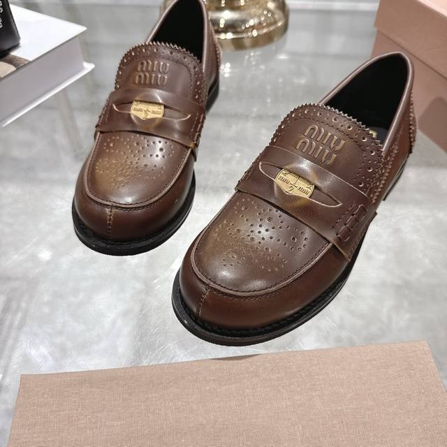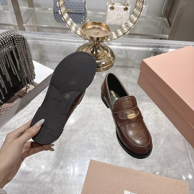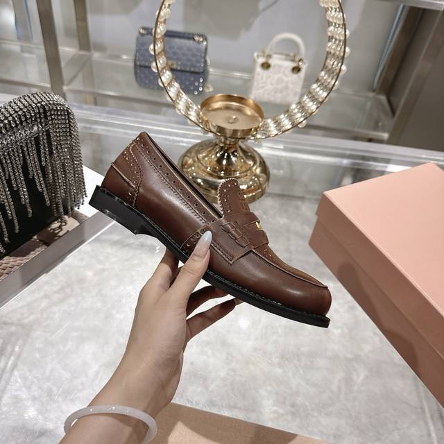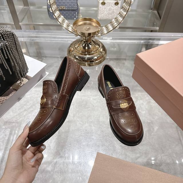Factory direct Miu Miu 25Ss Autumn/Winter New Distressed Half-Round Toe Shoes. Miu Miu's new autumn/winter style loafers stand out among other loafers with their detailed design. The overall shape is smooth and elegant, not bulky at all. They fully expose the ankle, flattering the leg proportions and making the shoes look particularly stylish. Material: Imported cowhide distressed leather with split edges. Lining: Sheepskin. Outsole: TPU outsole, wear-resistant and slip-resistant. Sizes: 35-40. Size 40 is custom-made and non-refundable.