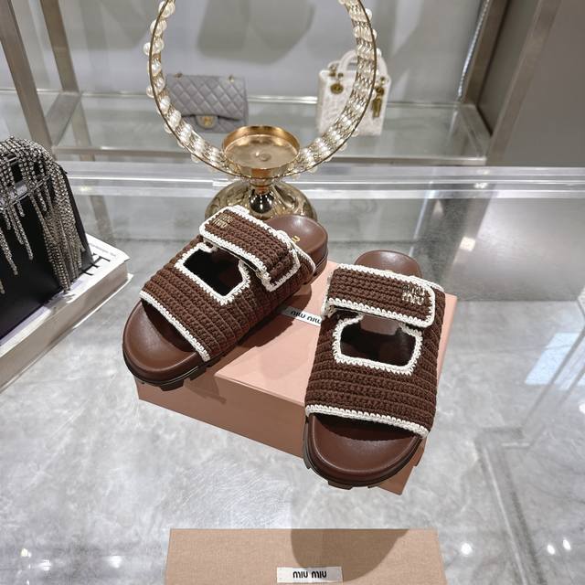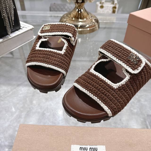 Factory direct Miu Miu two-strap Velcro woven platform flat sandals. Miu Miu 25 Summer New Sandal Collection. Latest runway style from Paris Fashion Week, retro and sophisticated, a brand new series that combines comfort and style. Designed to suit different style needs. Upper: Original custom woven fabric. Lining: Original custom sheepskin lining. Outsole: Original molded non-slip outsole. Sizes: 35-39. Size 40 is custom-made and non-refundable.