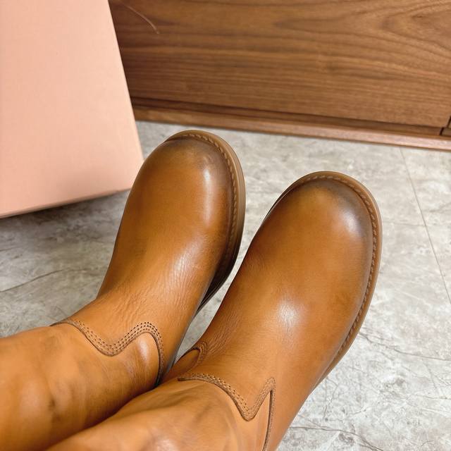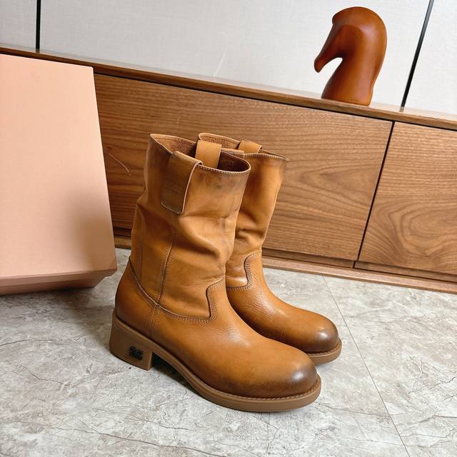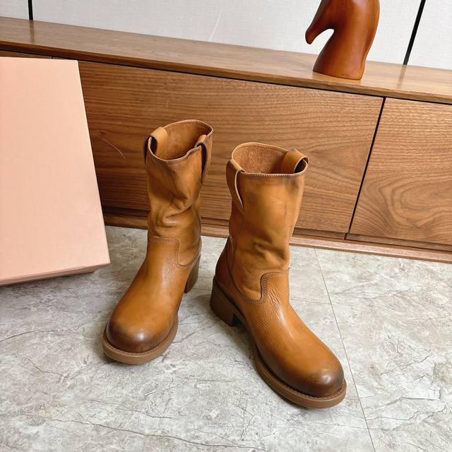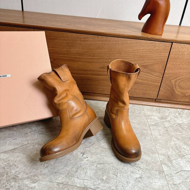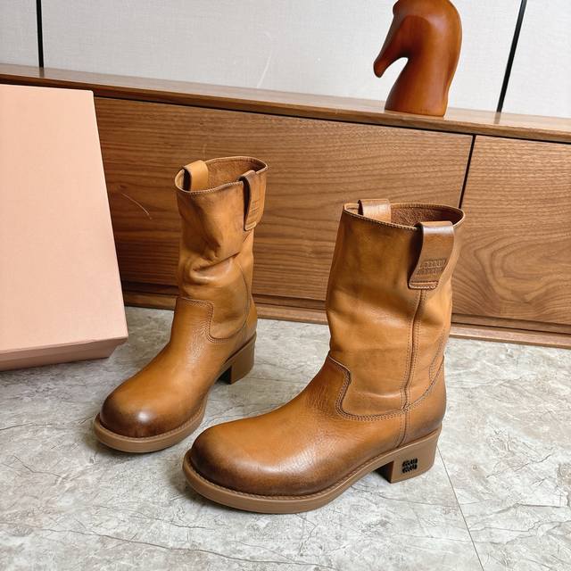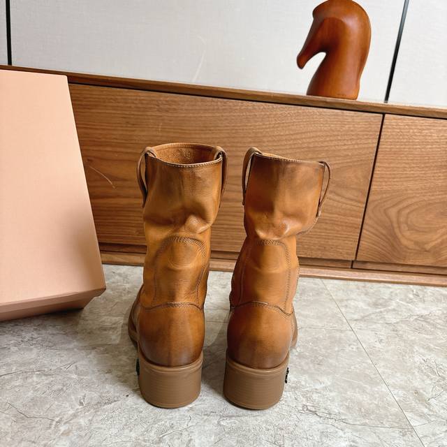 Factory direct Miumiu 2026 Spring/Summer runway style slouch boots, slip-on ankle boots with natural pleats on the shaft, exuding a relaxed and casual vibe. The semi-lining design is lightweight and not bulky, perfect for autumn and winter outfits. The soft insole ensures comfort even after long wear, suitable for city walks or everyday outings. Inspired by a blend of professional and casual styles, these boots are both practical and fashionable, making them one of the season's must-have items! Made with washed cowhide leather. Original molded rubber outsole for slip resistance and durability. Sizes 35-39, 40.41 (custom orders accepted).