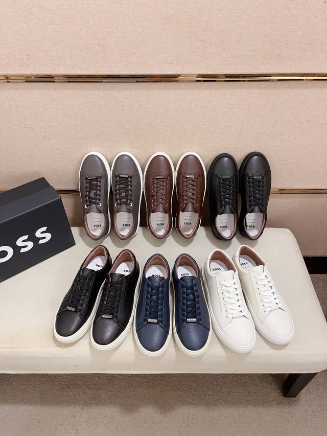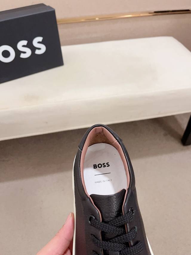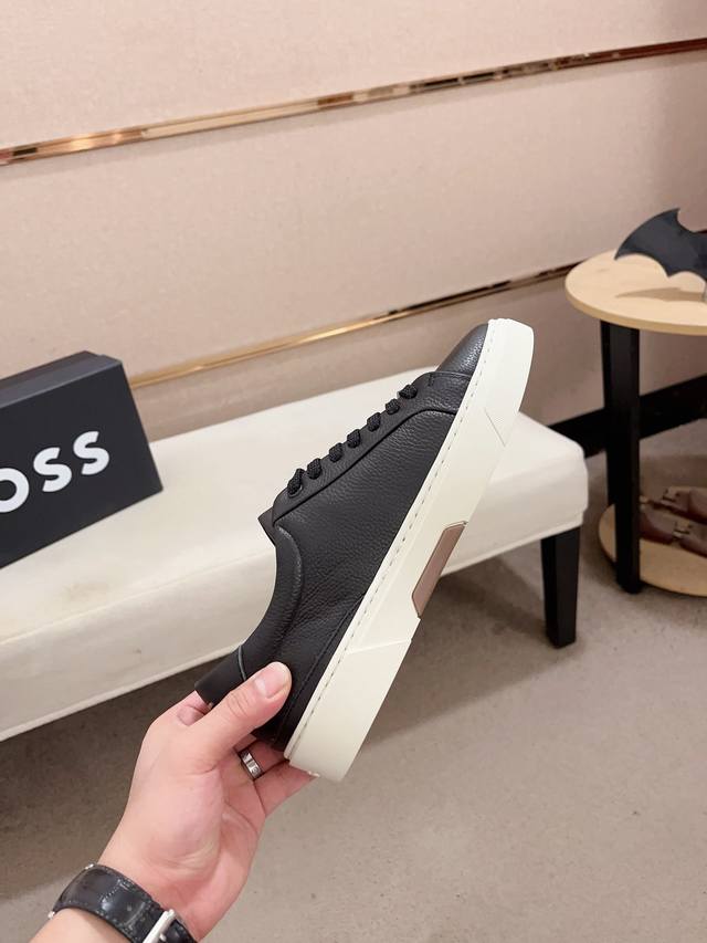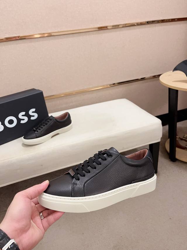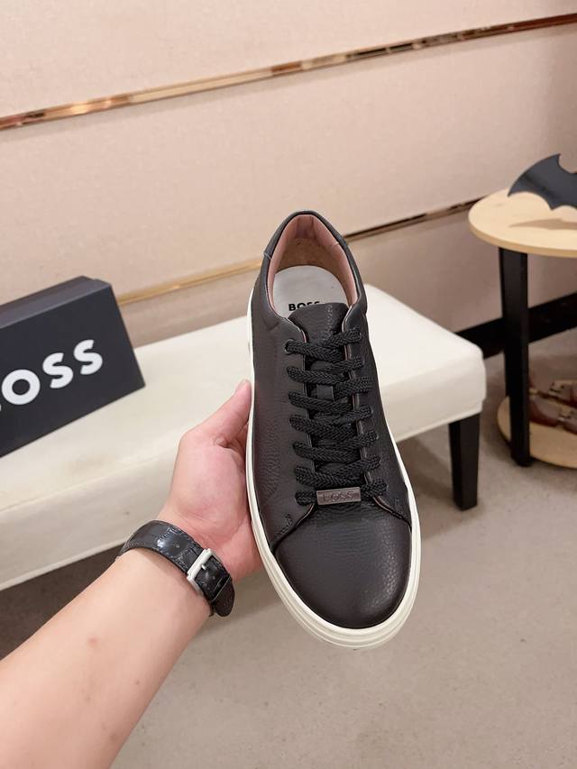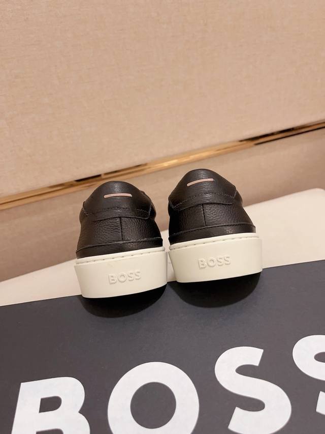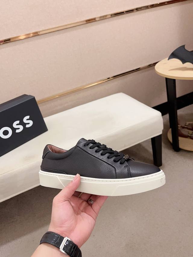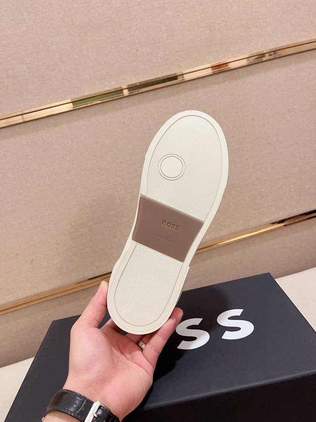 Factory direct price, high-quality Boss latest casual men's shoes. Welcome to compare 1:1. Hot-selling Boss Hong Kong boutique casual shoes, boutique quality, supports inspection, excellent workmanship, upper made of Italian imported lychee-patterned calfskin breathable leather lining, original fashionable sports outsole, casual and stylish, high-end quality. Sizes: 38-44, size 45 can be customized.