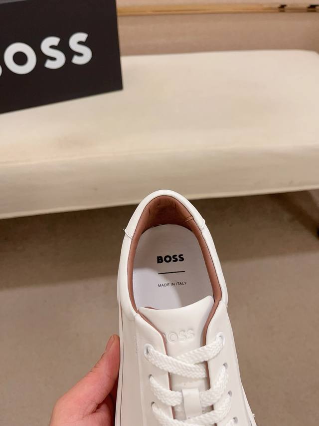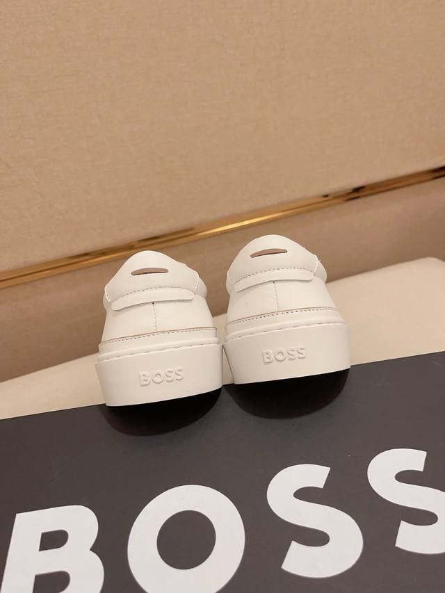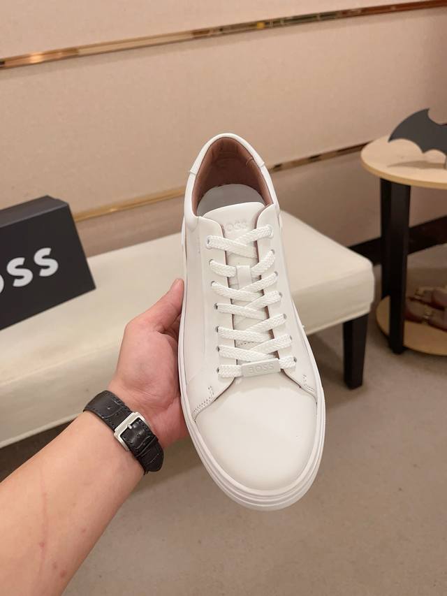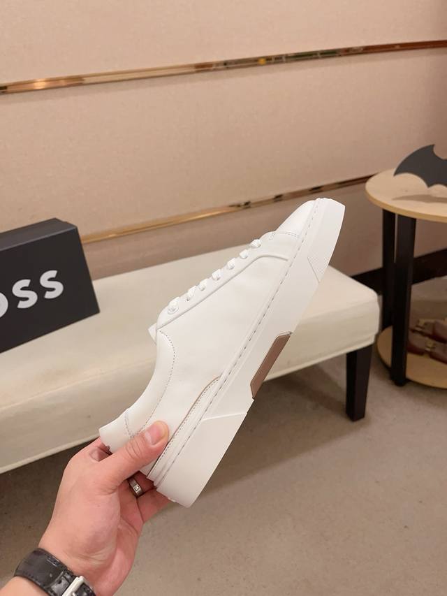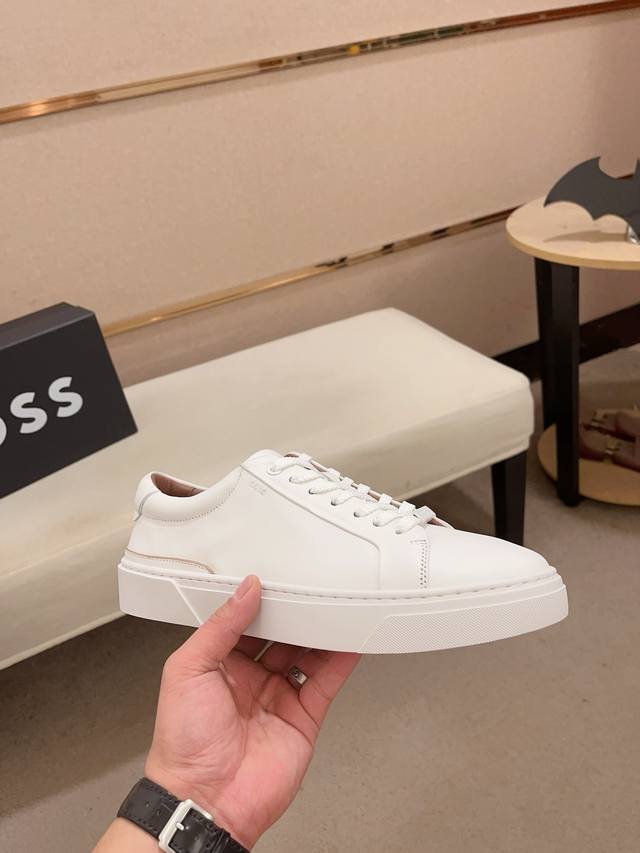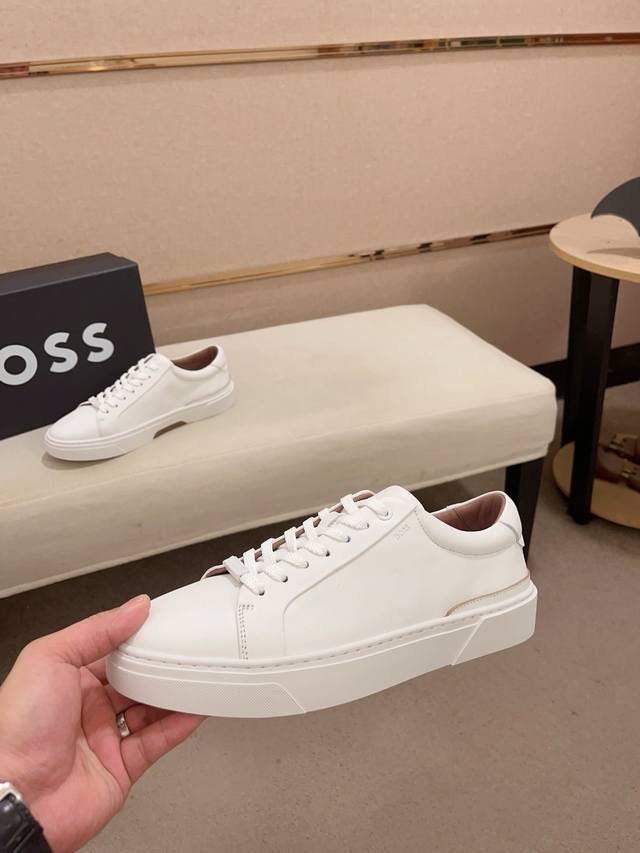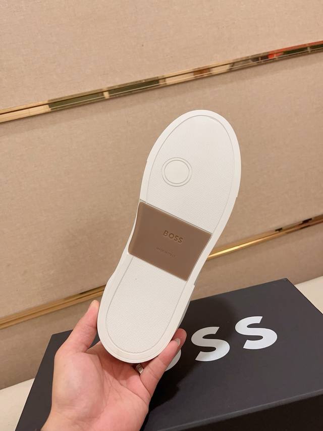 Factory direct price, high-quality Boss latest casual men's shoes. Welcome to compare 1:1. Bestselling Boss Hong Kong boutique casual shoes, boutique quality, support inspection, excellent workmanship, upper made of Italian imported calfskin breathable leather lining, original fashionable sports outsole, casual and stylish, high-end quality. Sizes: 38-44, size 45 can be customized.