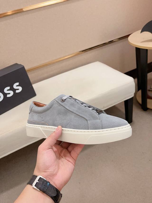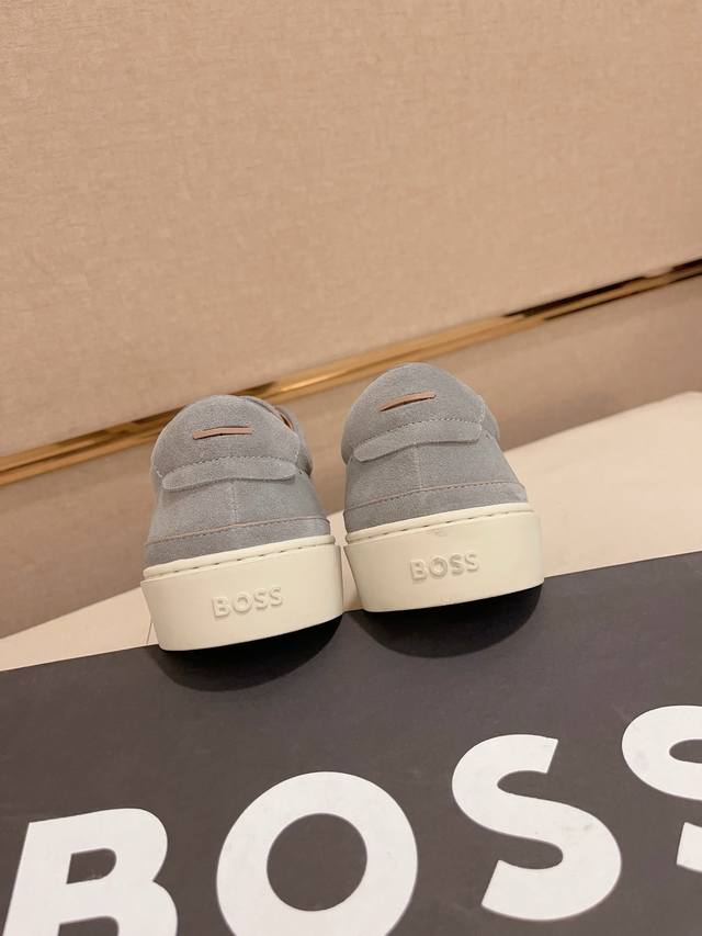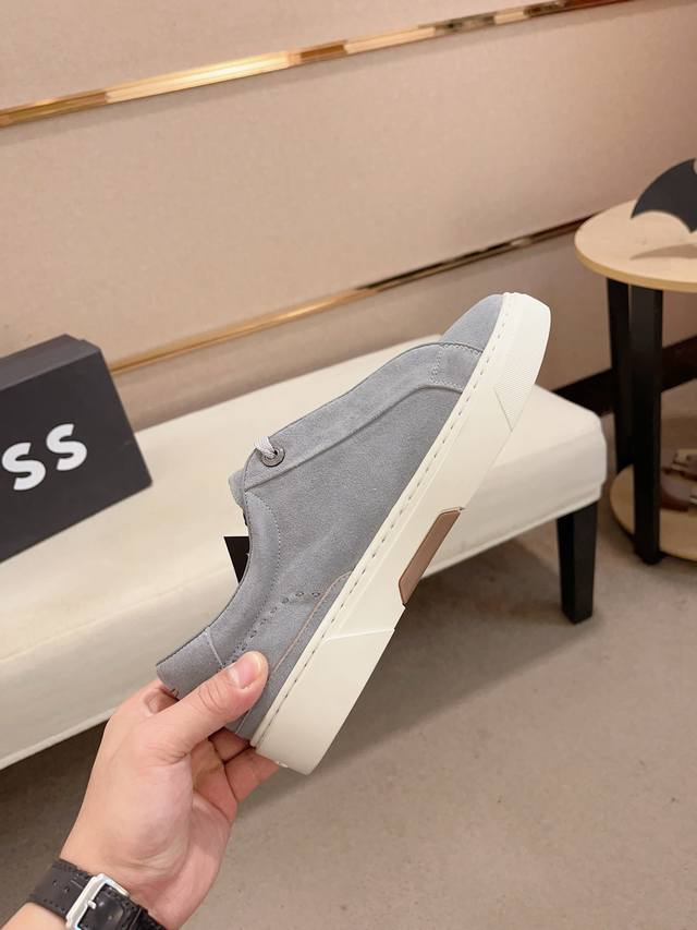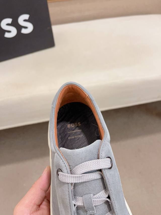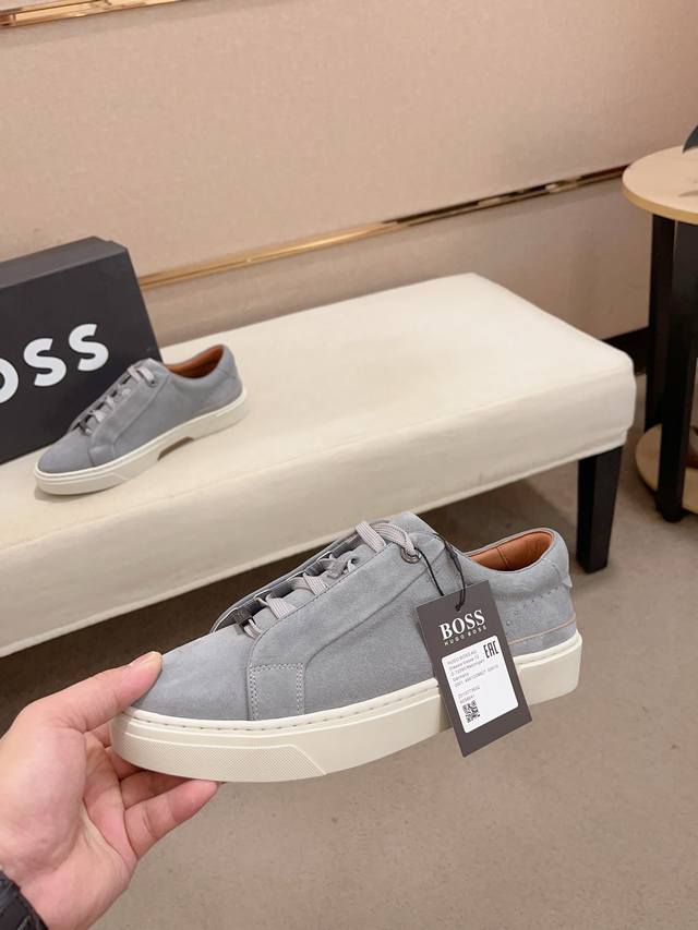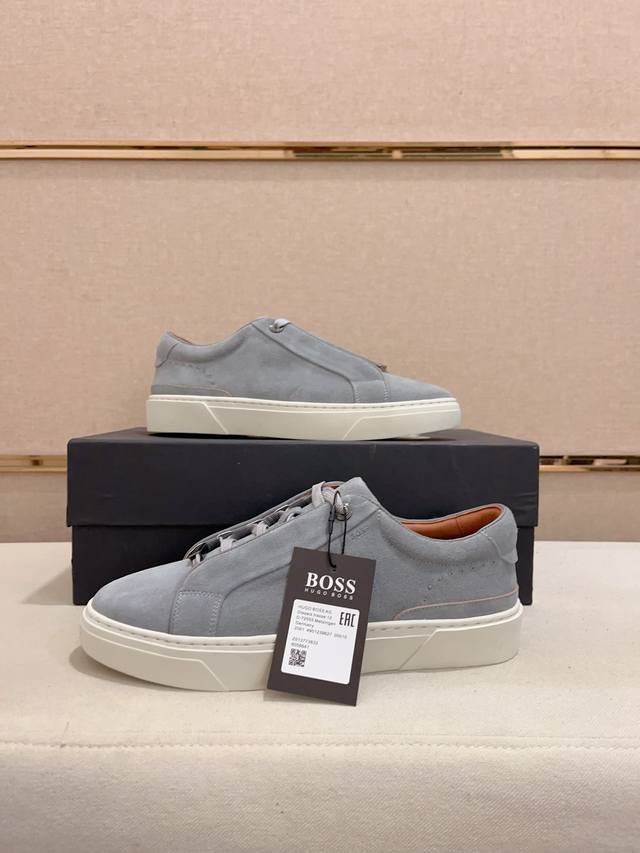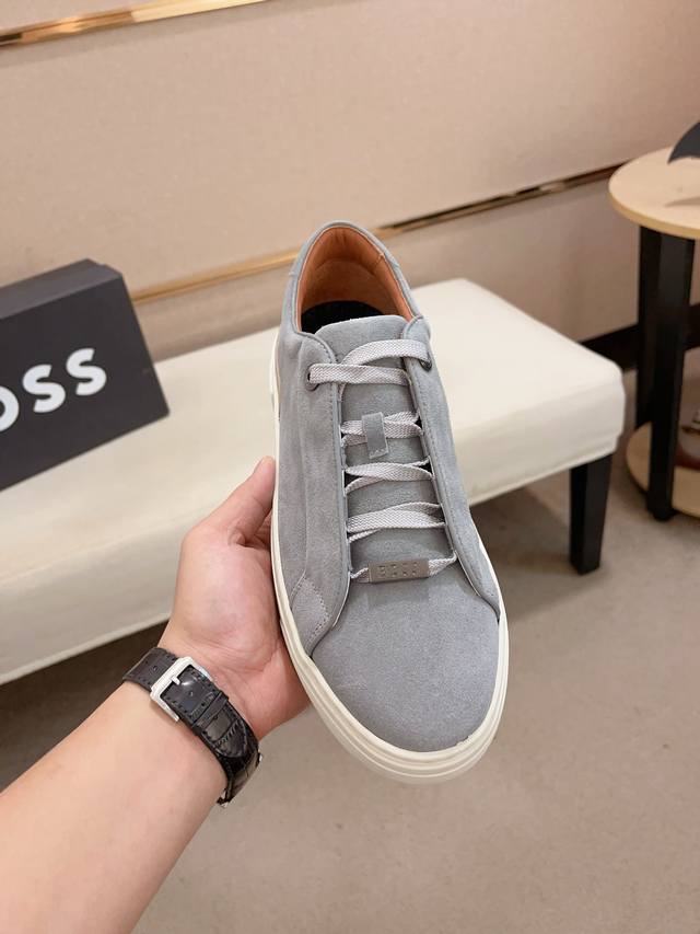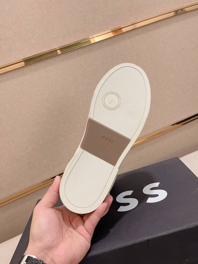 Factory direct price, high-quality Boss latest casual men's shoes. Welcome to compare 1:1. Bestselling Boss Hong Kong boutique casual shoes, boutique quality, supports inspection, excellent workmanship, upper made of Italian imported calfskin breathable leather lining, original fashionable sports outsole, casual and stylish, high-end quality. Sizes: 38-44, size 45 customizable.