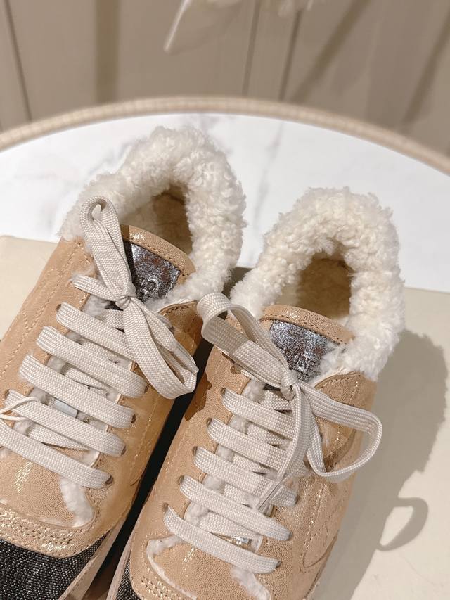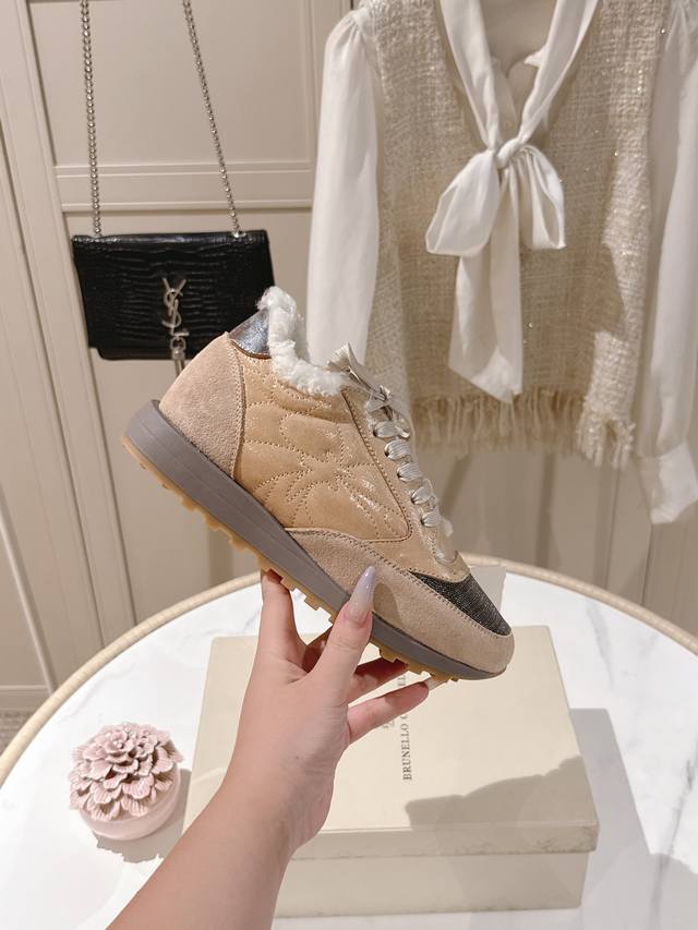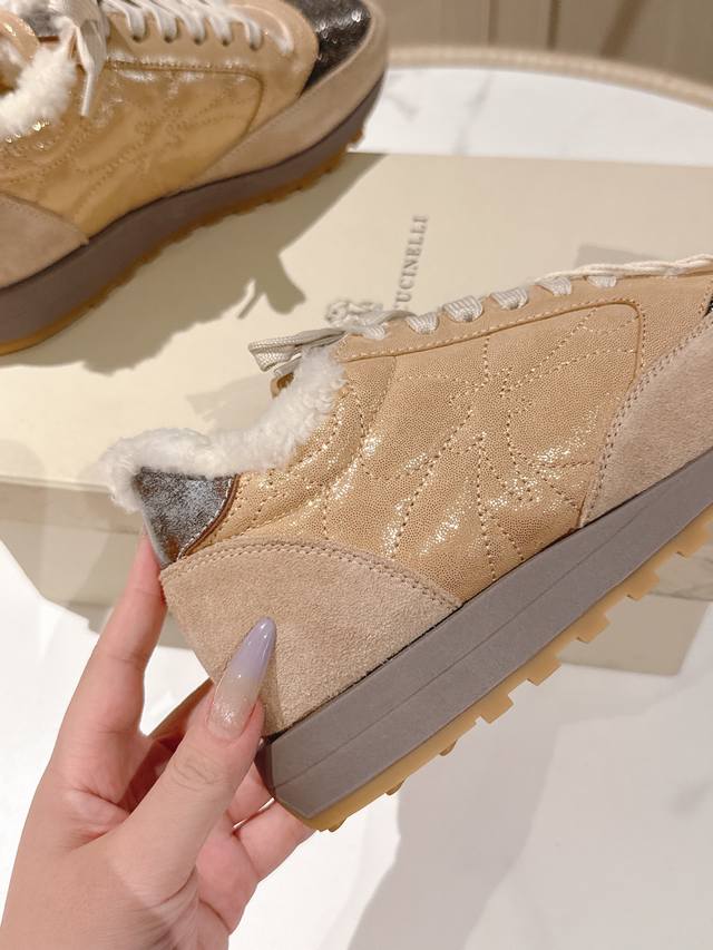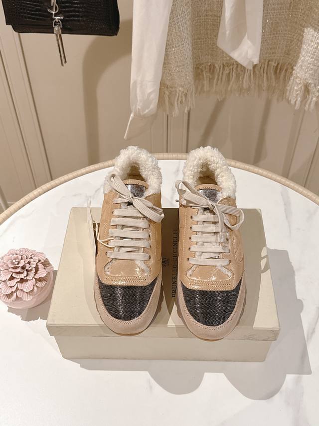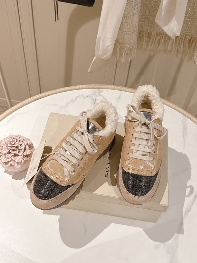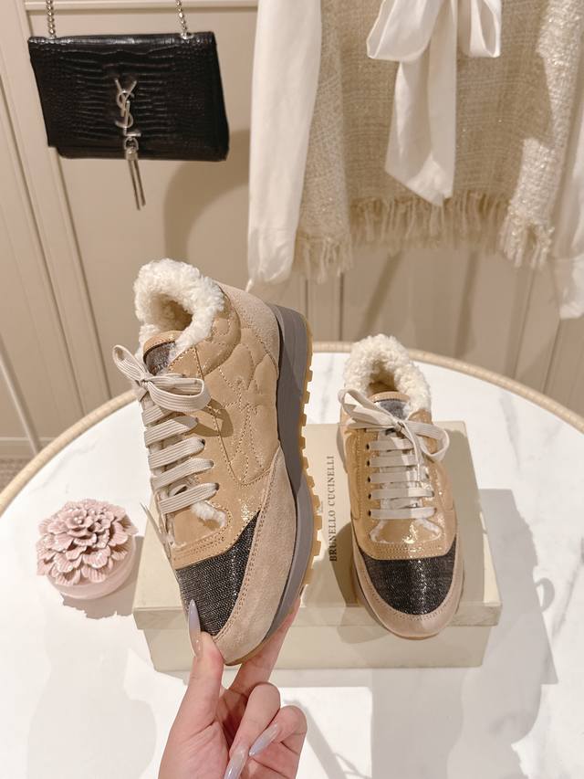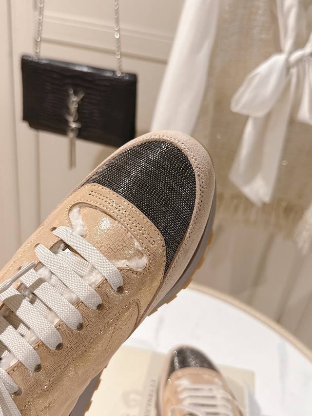 Factory direct sales, top-quality version: Brunello Cucinelli casual sneakers. Made with original materials, these Brunello Cucinelli sneakers feature a new design inspired by precious knitwear, offering a refined reinterpretation of classic athletic style. The delicate jacquard knit texture creates a captivating gradient on the toe, further enhanced by the lamellar stitching. Soft suede trim adds an elegant contrast. Embroidered beads on the eyelets add a touch of feminine elegance with a subtle sheen. Comes with exquisite boutique packaging. Material: Original custom imported cowhide + knit. Insole: Original custom warm wool lining. Sole: Original molded non-slip rubber material. Sole thickness: 3cm. Size: Women's 35-42.