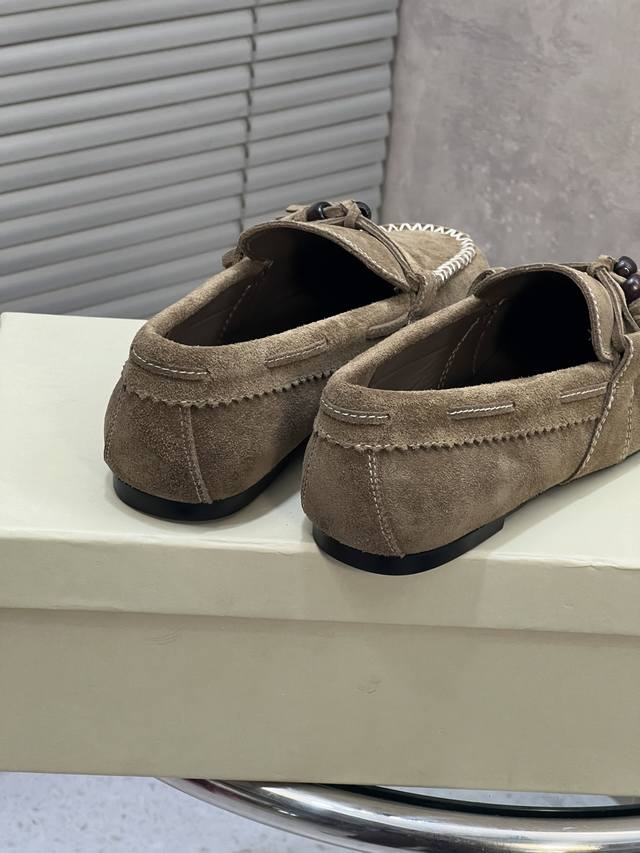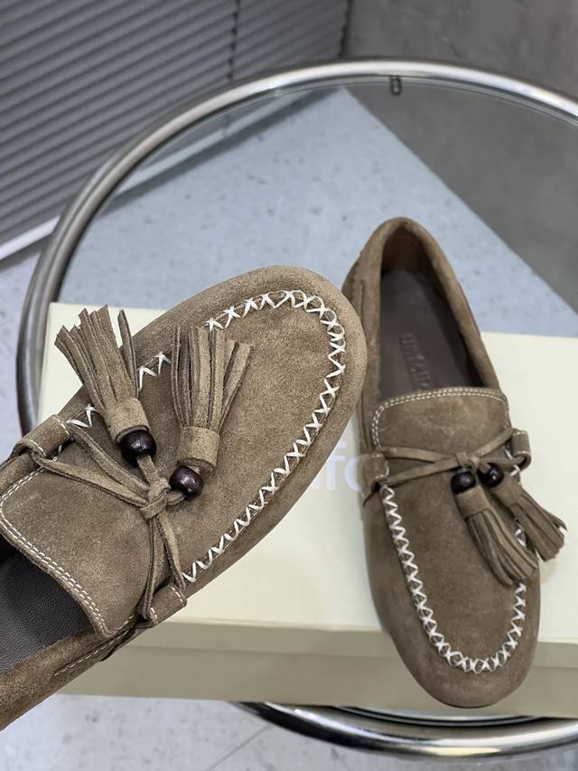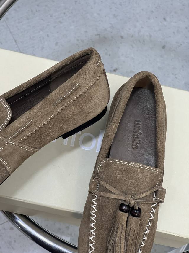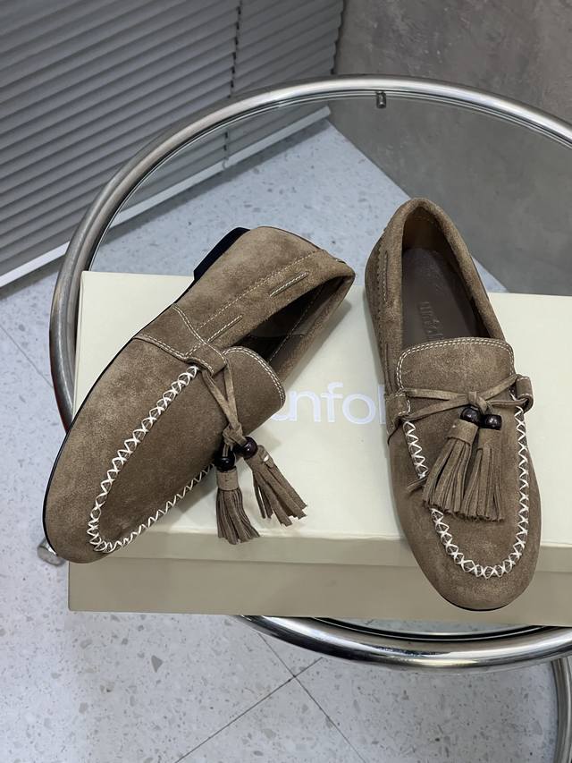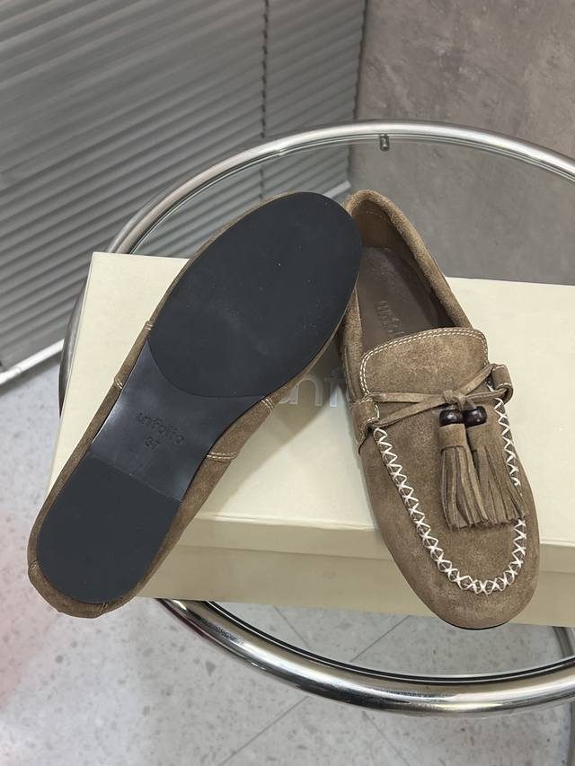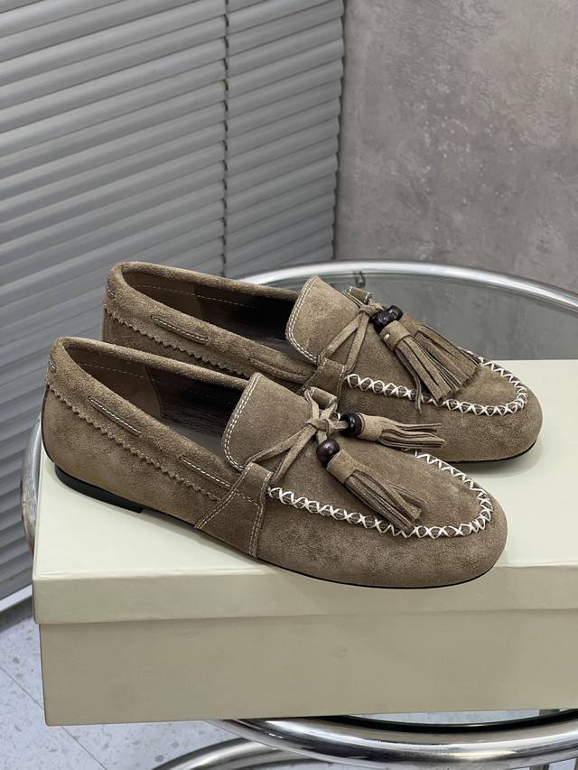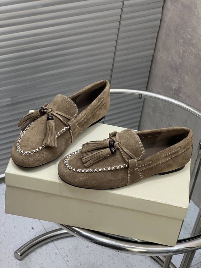 Factory Direct DDD Unfolio New Retro Simple Tassel Flat Loafers DDD Made of suede, soft to the touch with a matte, high-end feel. The design is detailed, featuring tassels, decorative beads, and visible stitching, giving it a refined and retro vibe. These slip-on loafers are easy to put on and take off, suitable for everyday commuting or casual occasions. DDD Upper: Cow Suede DDD Lining: Sheepskin DDD Outsole: Original Rubber Outsole DDD Size: 35-41 (Size 40 and 41 are custom-made and non-refundable/non-exchangeable) DDD