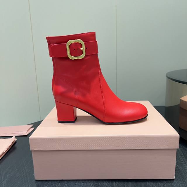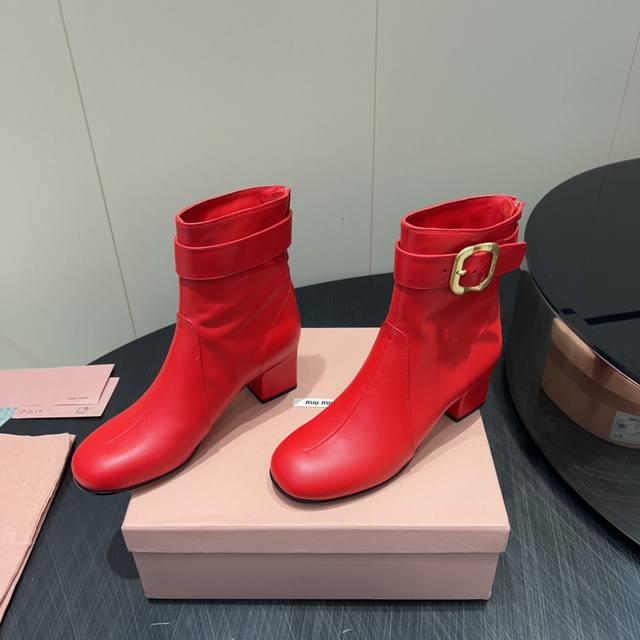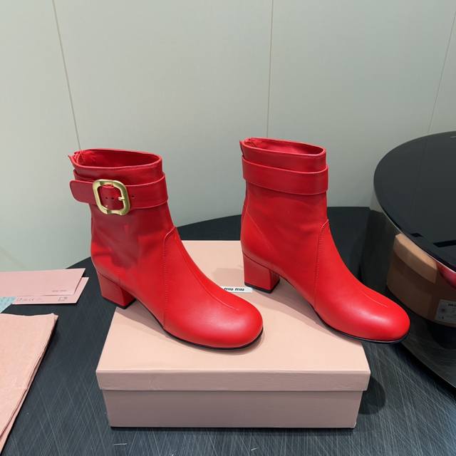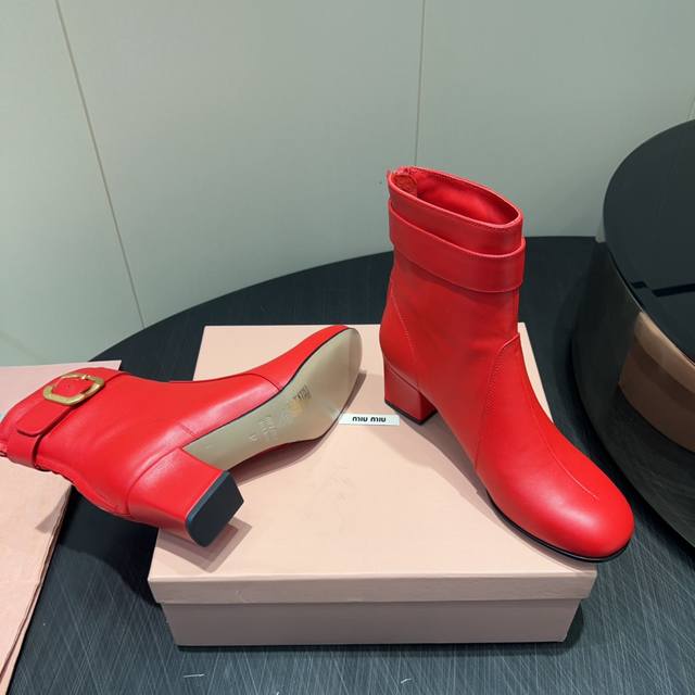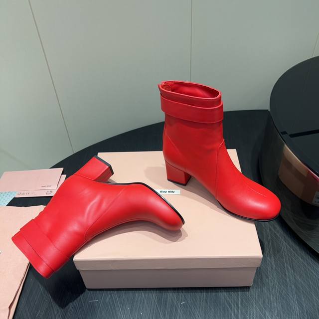 , Miumiu's latest runway hit from the 2025 Vs Early Fall collection. Round-toed mid-heeled ankle boots.