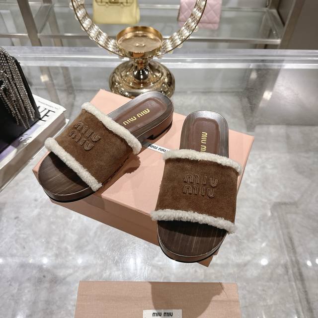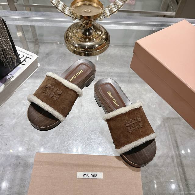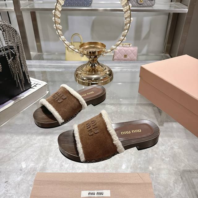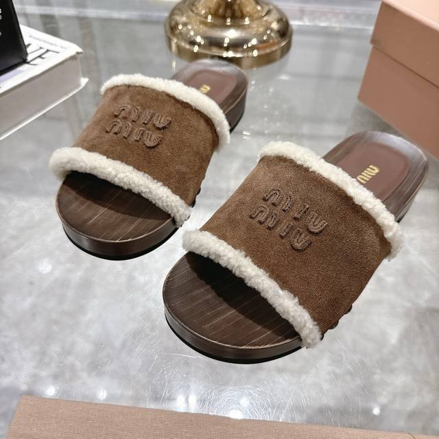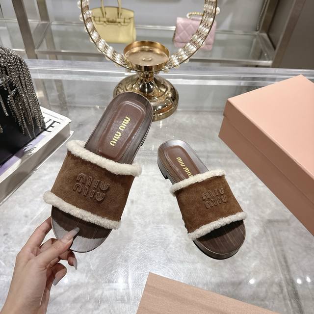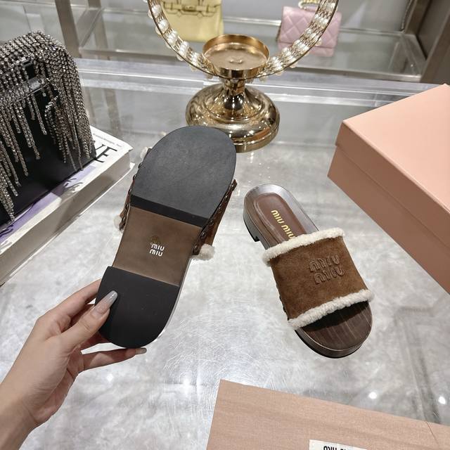 Factory Miu Miu new autumn and winter catwalk solid wood sole wool half-slip, comfortable and soft to wear, open toe style is particularly convenient to wear, wear as you go
