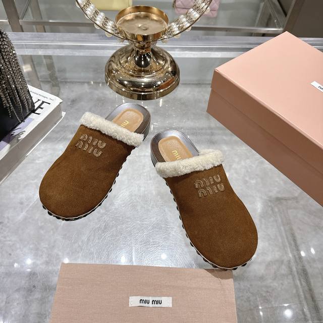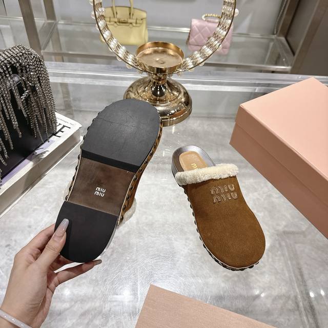 Factory Miu Miu new autumn and winter catwalk solid wood sole wool half-slippers, comfortable and soft to wear, the style is designed to be half-covered and very convenient to wear, you can wear it anytime you want