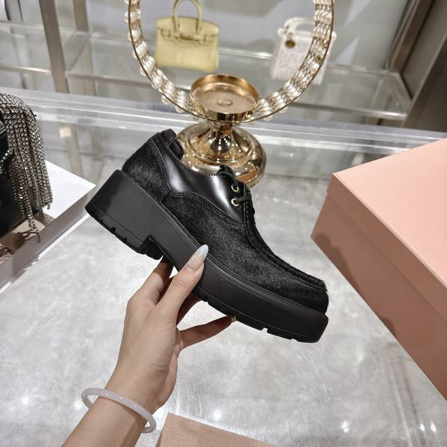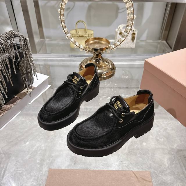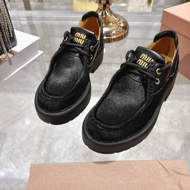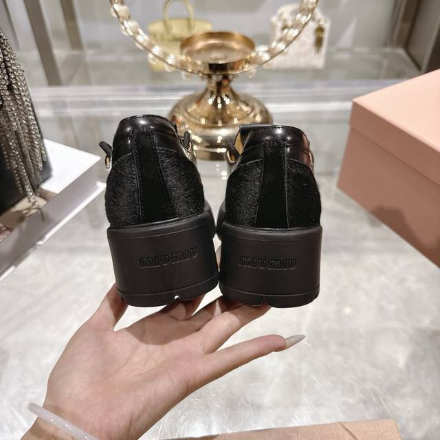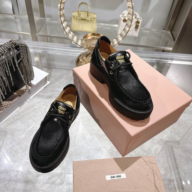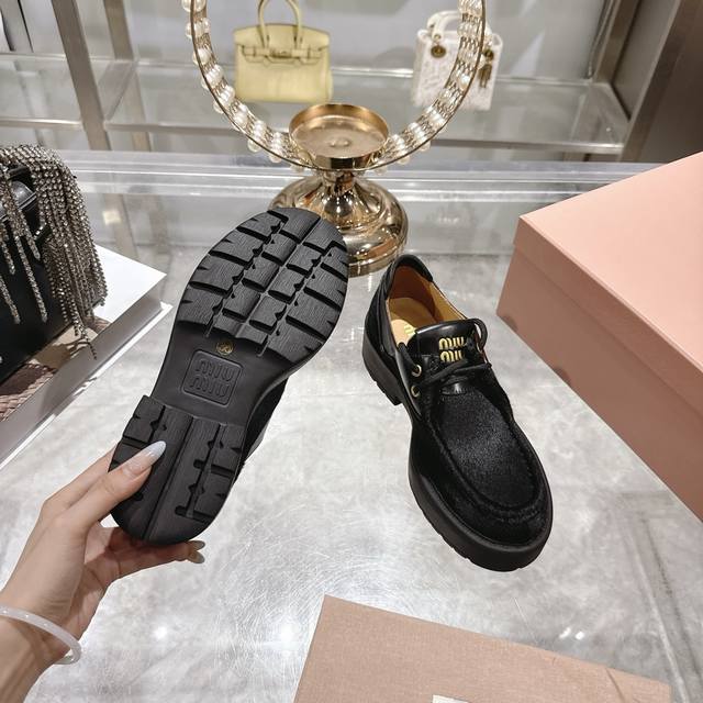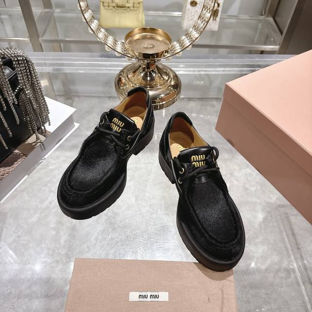 Factory Miumiu 2025 runway new loafers, small leather shoes, casual shoes. Made of pony hair, this shoe features an embossed Miu logo on the tongue, showcasing a unique, classic style. Extremely comfortable, especially for petite women. Zp develops hardware and custom colors. Upper: Custom pony hair. Lining: Sheepskin . Sole: Zp molded rubber outsole. Sizes: 35-41. 40.41 custom made.