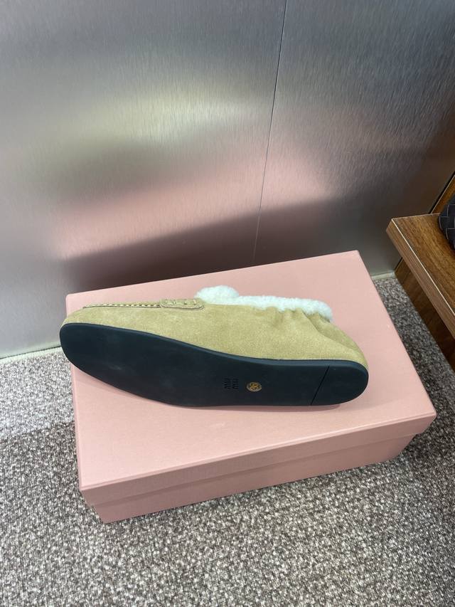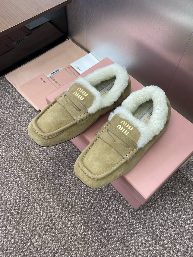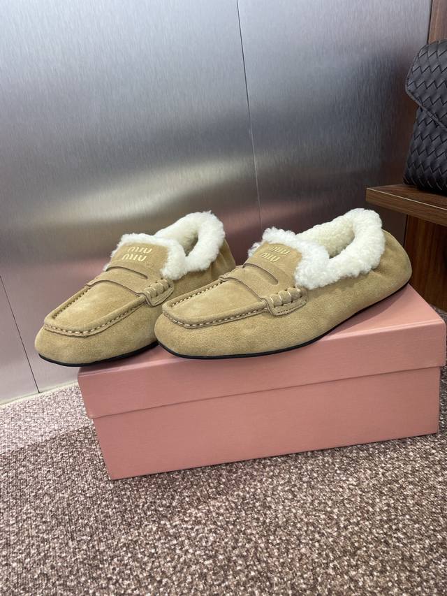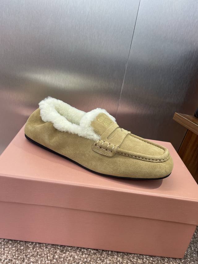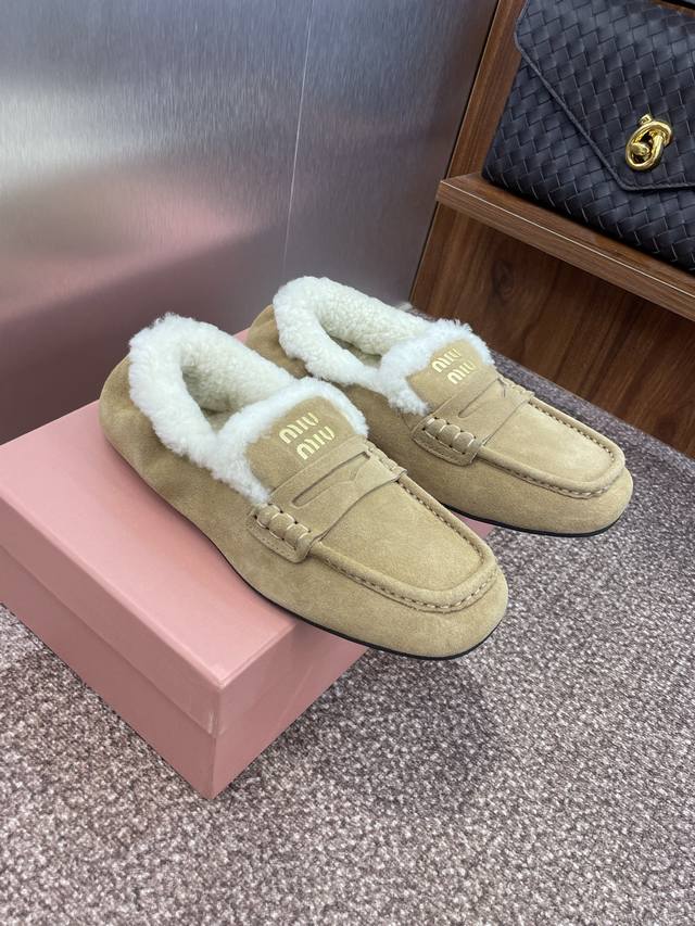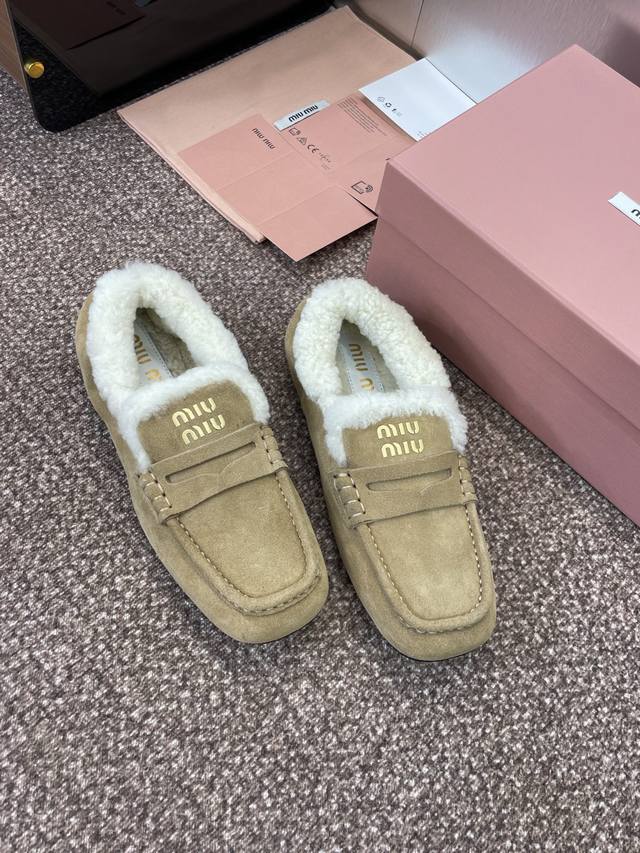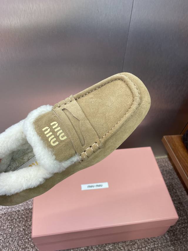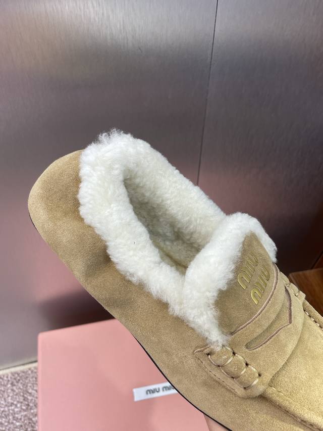 Miumiu 2025 autumn and winter new fashion lambswool women's single shoes Miu Miu letter logo hardware belt buckle flat round toe color matching loafers