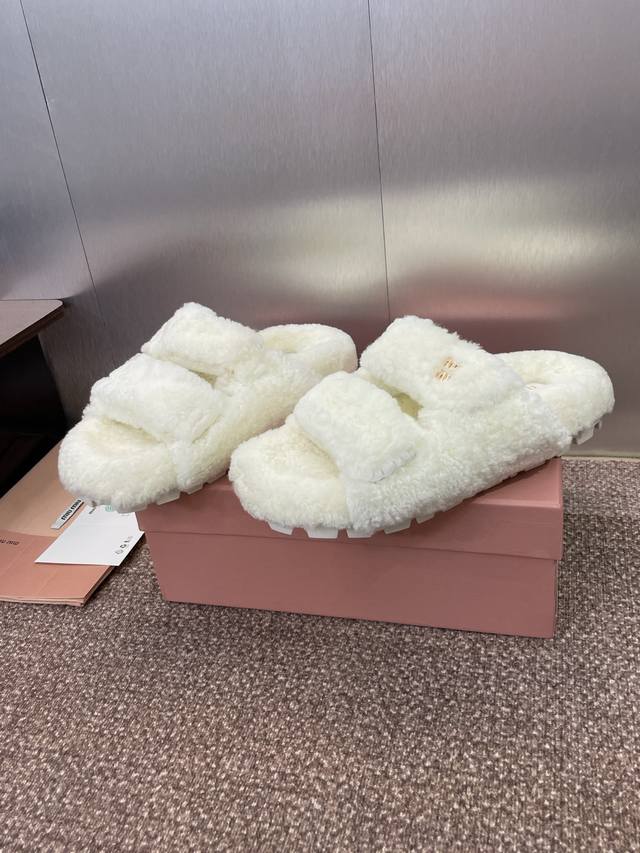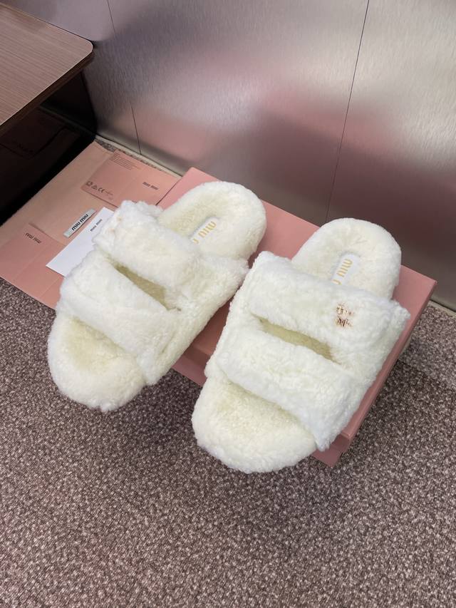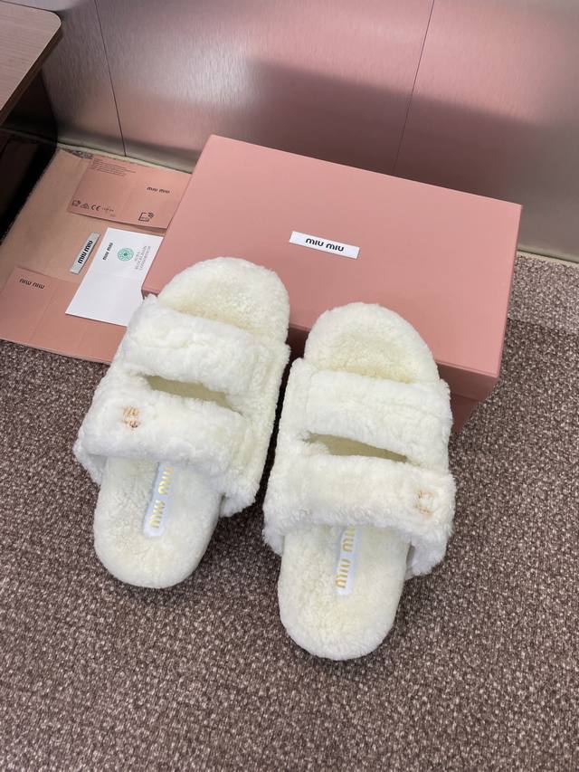 Miumiu 2025 autumn and winter new fashion Velcro lambskin women's slippers Miu Miu letter logo flat round toe color matching open toe home shoes