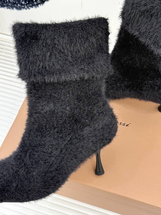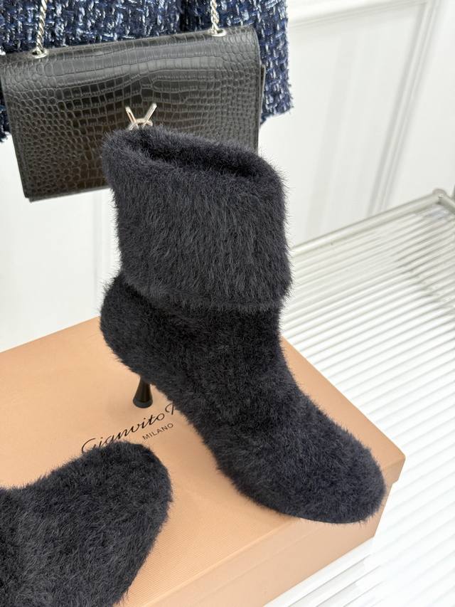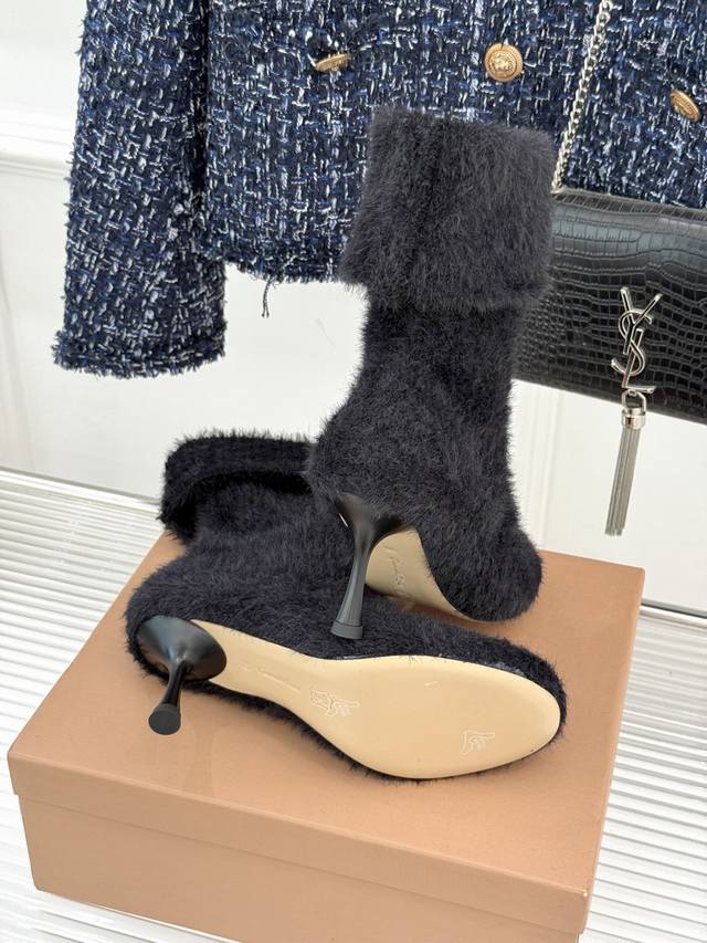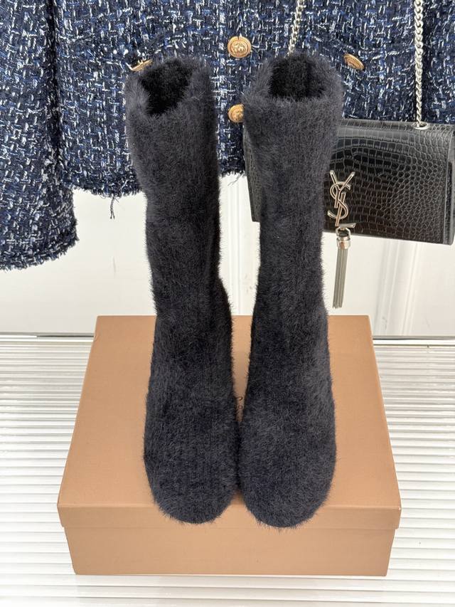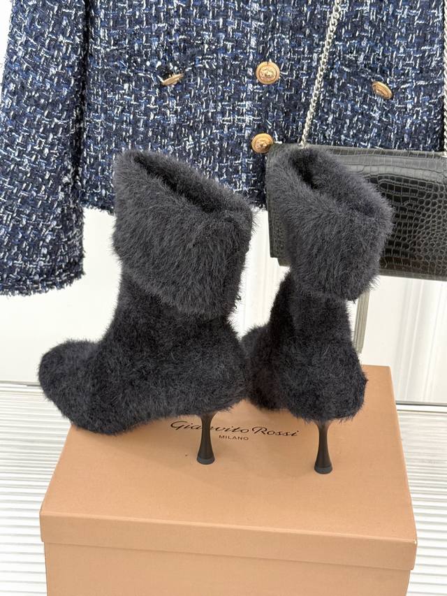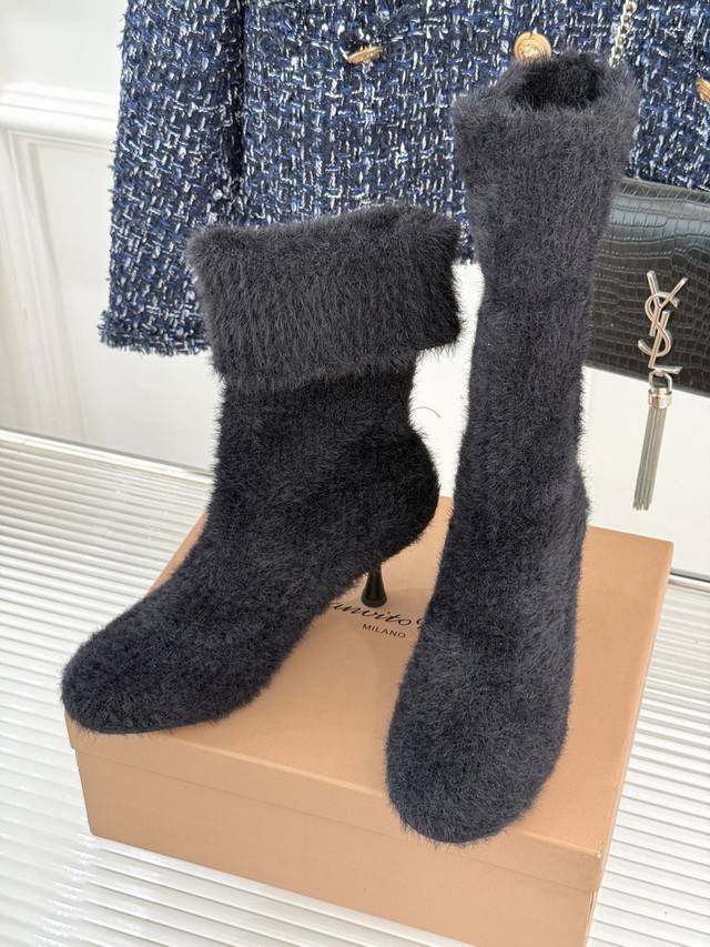 Factory Price: Gianvito Rossi 25Wf New Fall/Winter Knitted High-Heeled Sock Boots. When the soft texture of knit meets the sharp edge of a high heel, these sock boots redefine fall/winter footwear with their unique aesthetic. Made from 48-gauge combed cotton knit, they fit the ankle and calf like a second skin, naturally flowing with your gait without feeling constricted. Subtle folds add a touch of relaxed elegance as you walk. The heel is the heart of the design. The 7cm stiletto heel features a matte metallic finish. The flowing lines that extend from the boot shaft to the sole retain the elegant aura of a stiletto while enhancing stability through a wider heel base. The gently rounded toe and tonal knit binding soften the heel's sharpness, adding a touch of retro elegance. The ribbed cuffs at the boot collar securely secure the boot in place. They also cleverly shape the calf, making the ankle appear slimmer. Perfect for commuting with a wool coat or a date with a velvet dress. The softness of the knitted fabric contrasts sharply with the coolness of the metal heel. Each step strikes a perfect balance between gentleness and sharpness, making them a powerful footwear tool for modern women to express their diverse style. Lined with lambskin. Imported Italian leather outsole. Sizes: 35-39, 34, 40, 41, 42. Customizable.